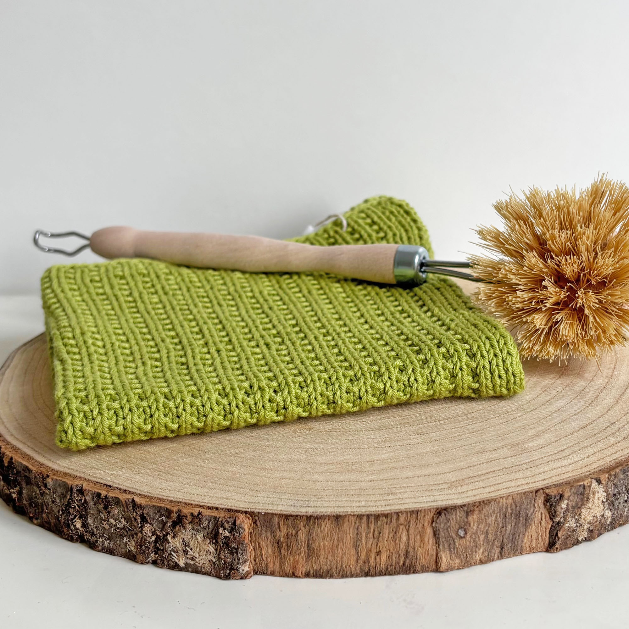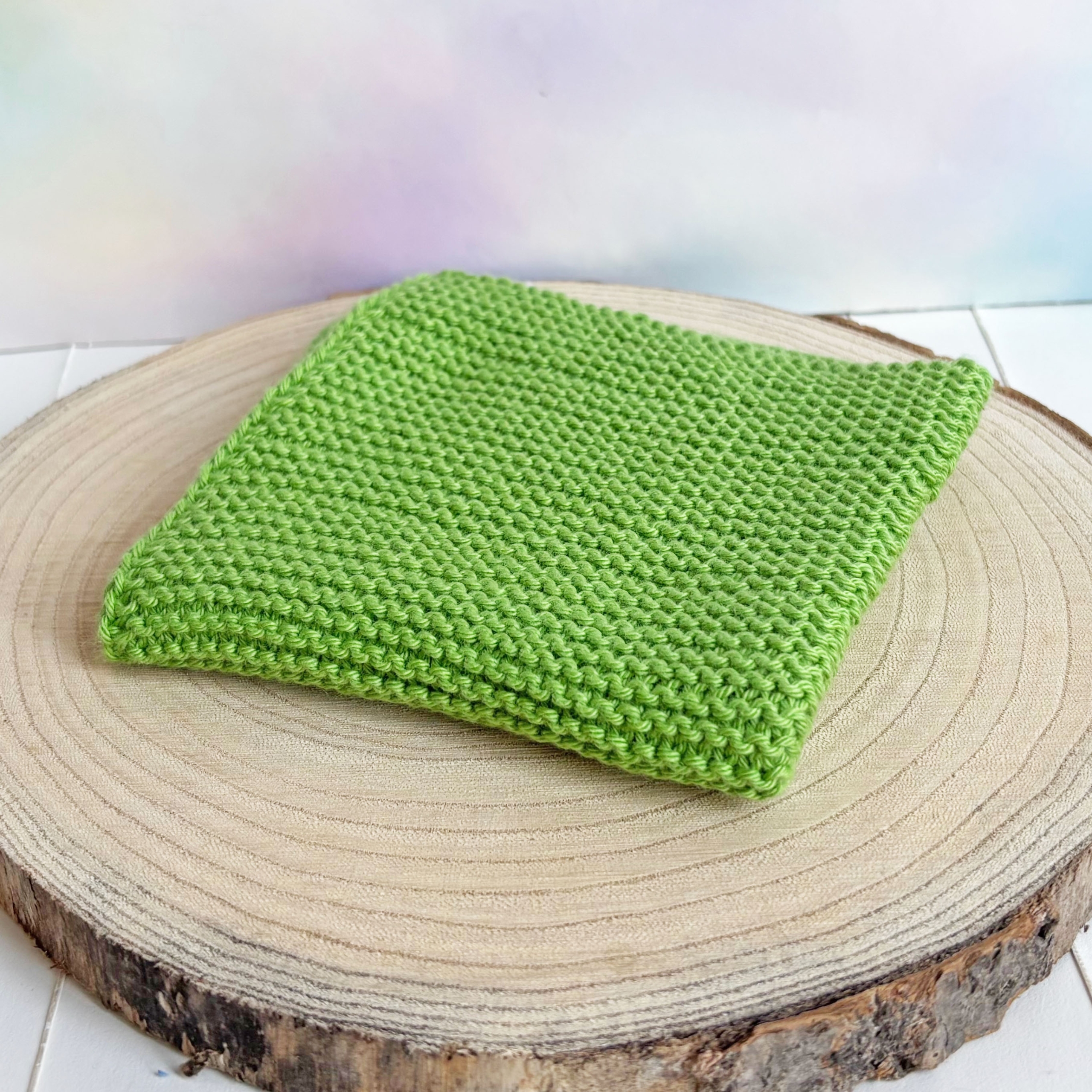 Handgestrickte Spültücher aus Baumwolle in Grüntönen, eine bunte nachhaltige Alternative zu Einmalwaschlappen.