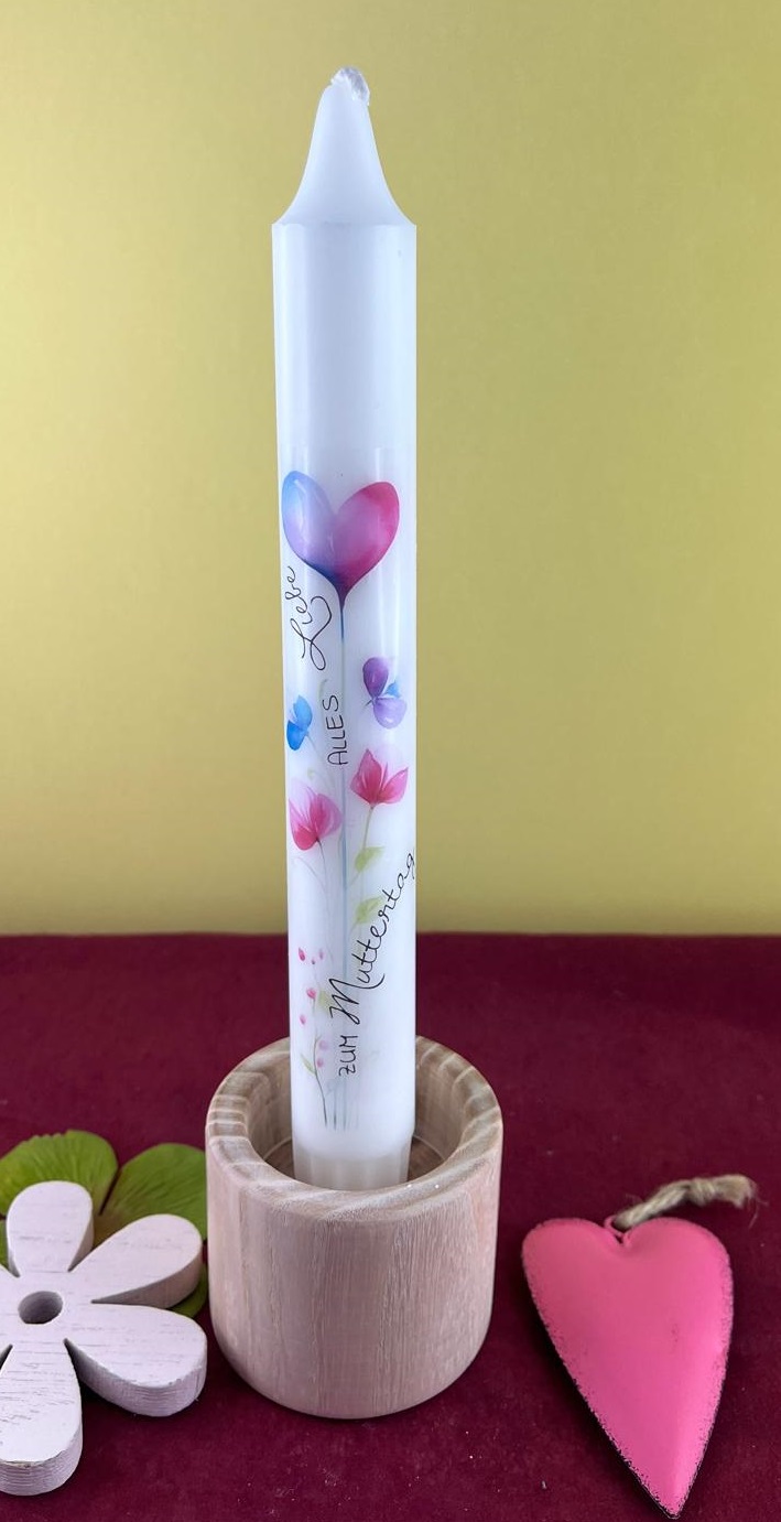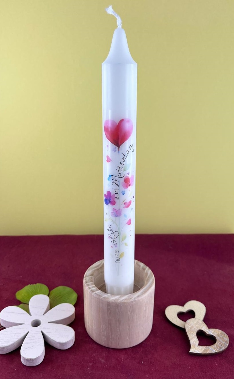 Unsere elegante Stabkerze zum MUTTERTAG besticht durch ein zarte Herzmotiv mit Spruch zum Muttertag, die einseitig auf die Kerze angebracht wird.