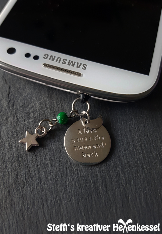 Schöner Handyanhänger bestehend aus einem silberfarbenen Anhänger mit der Aufschrift "I love you to the moon and back". Dazu hängen passend ein Mond und ein Stern sowie eine grün marmorierte Perle mit am Anhänger.