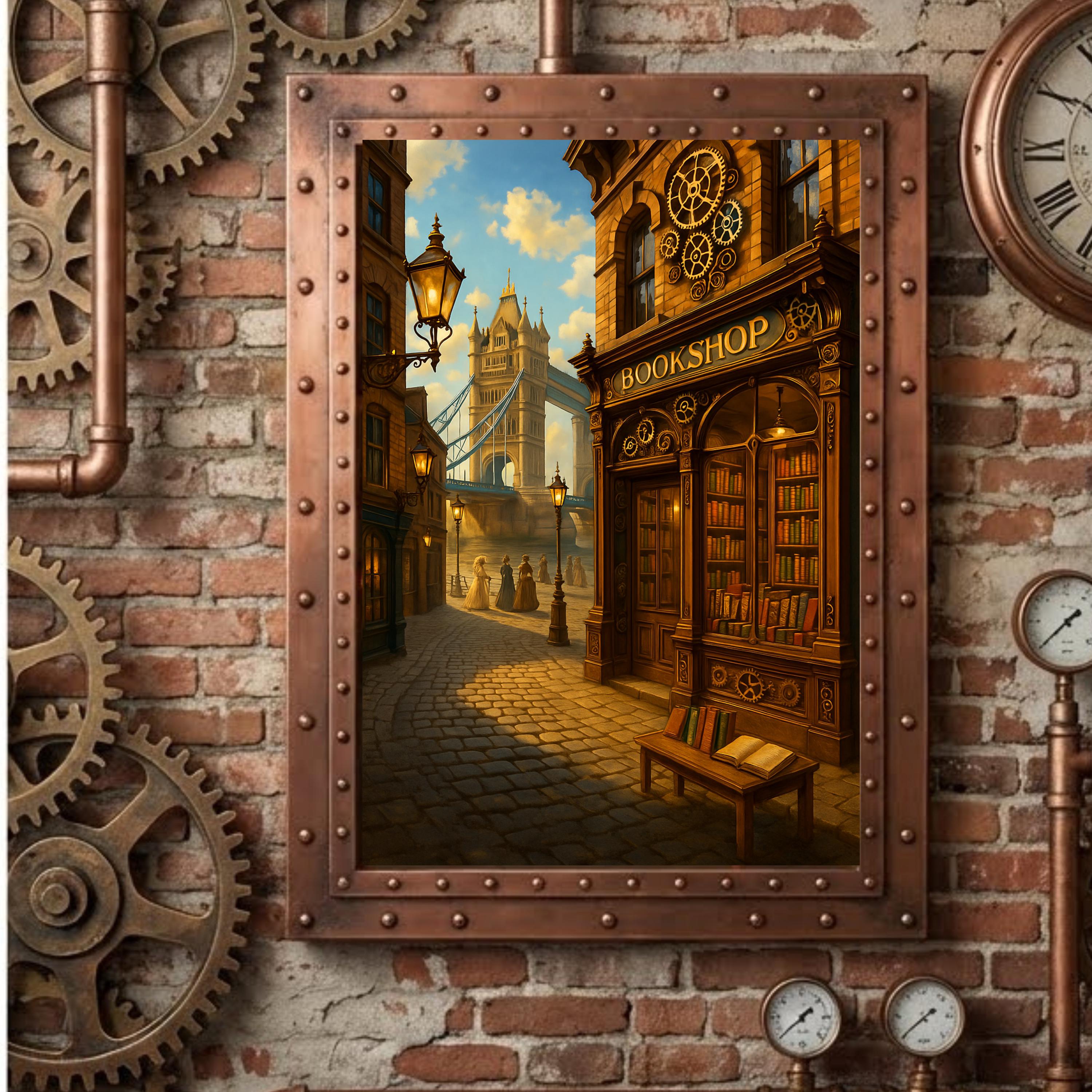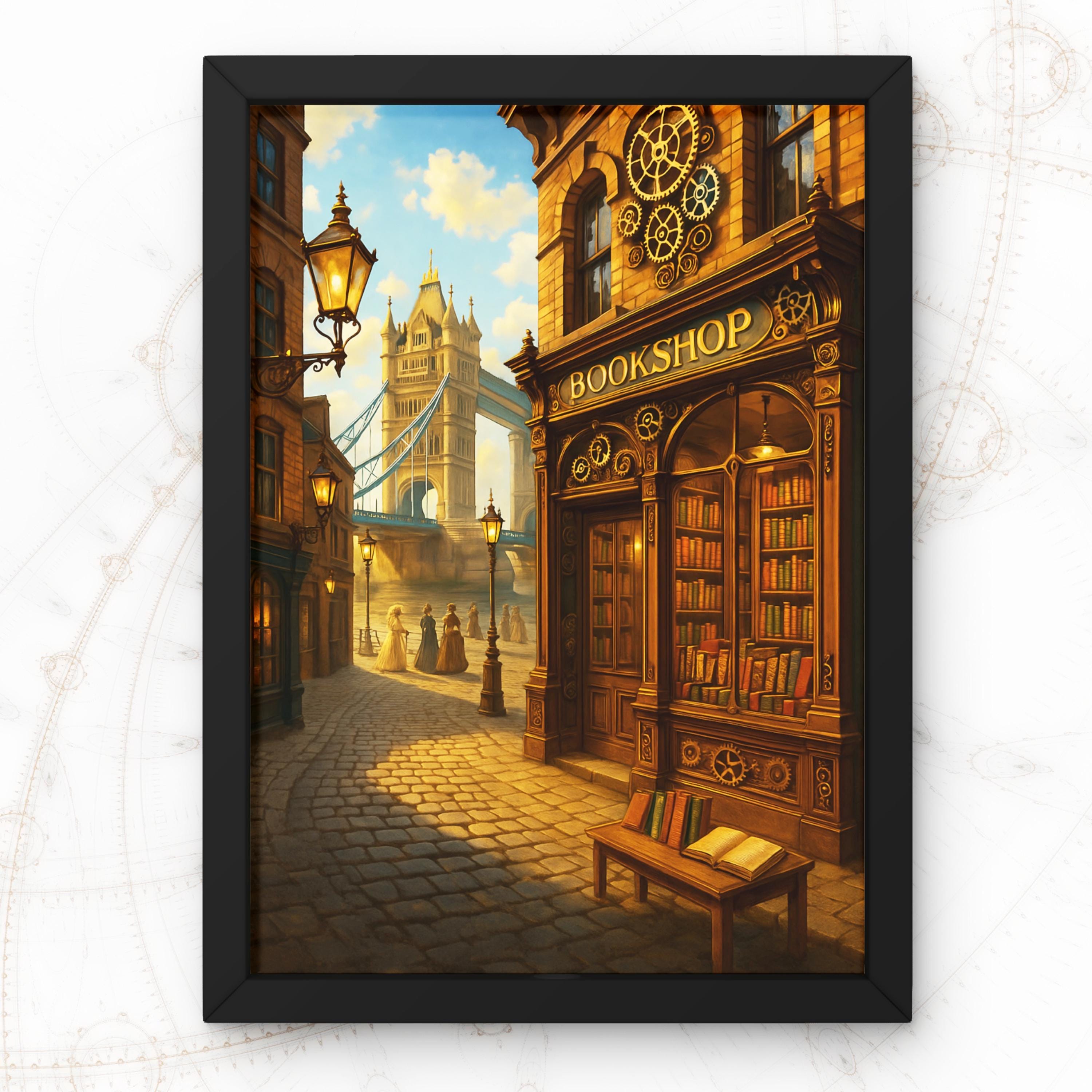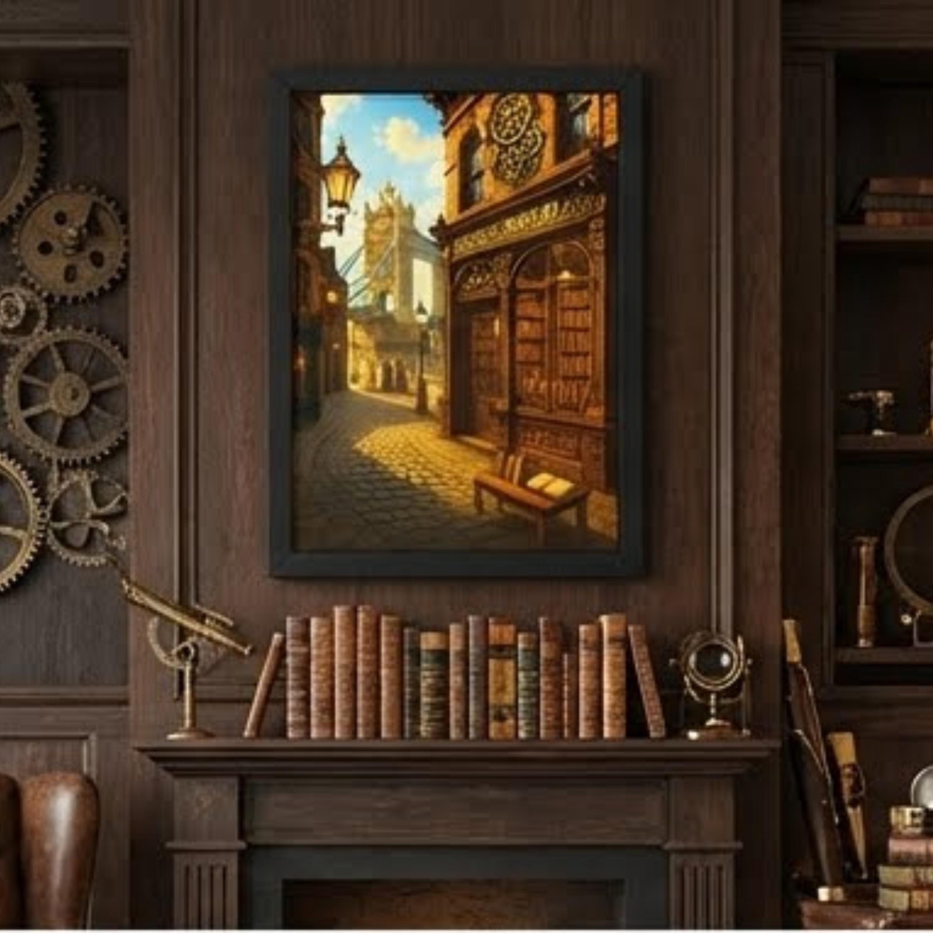 Gaslampen, Tower Bridge und ein Buchladen aus einer anderen Zeit. Dieses viktorianische Stadtbild taucht tief in die Welt des Steampunk ein – mit detailreichen Architekturelementen, warmem Licht und einer Atmosphäre, die nach alten Karten und Abenteuern riecht. Ideal für Bücherliebhaber, Städtereisen-Fans oder alle, die London ein bisschen anders sehen wollen. Gedruckt auf hochwertigem 200g Papier mit mattem Finish. Format: DIN A4 (21 x 29,7 cm).