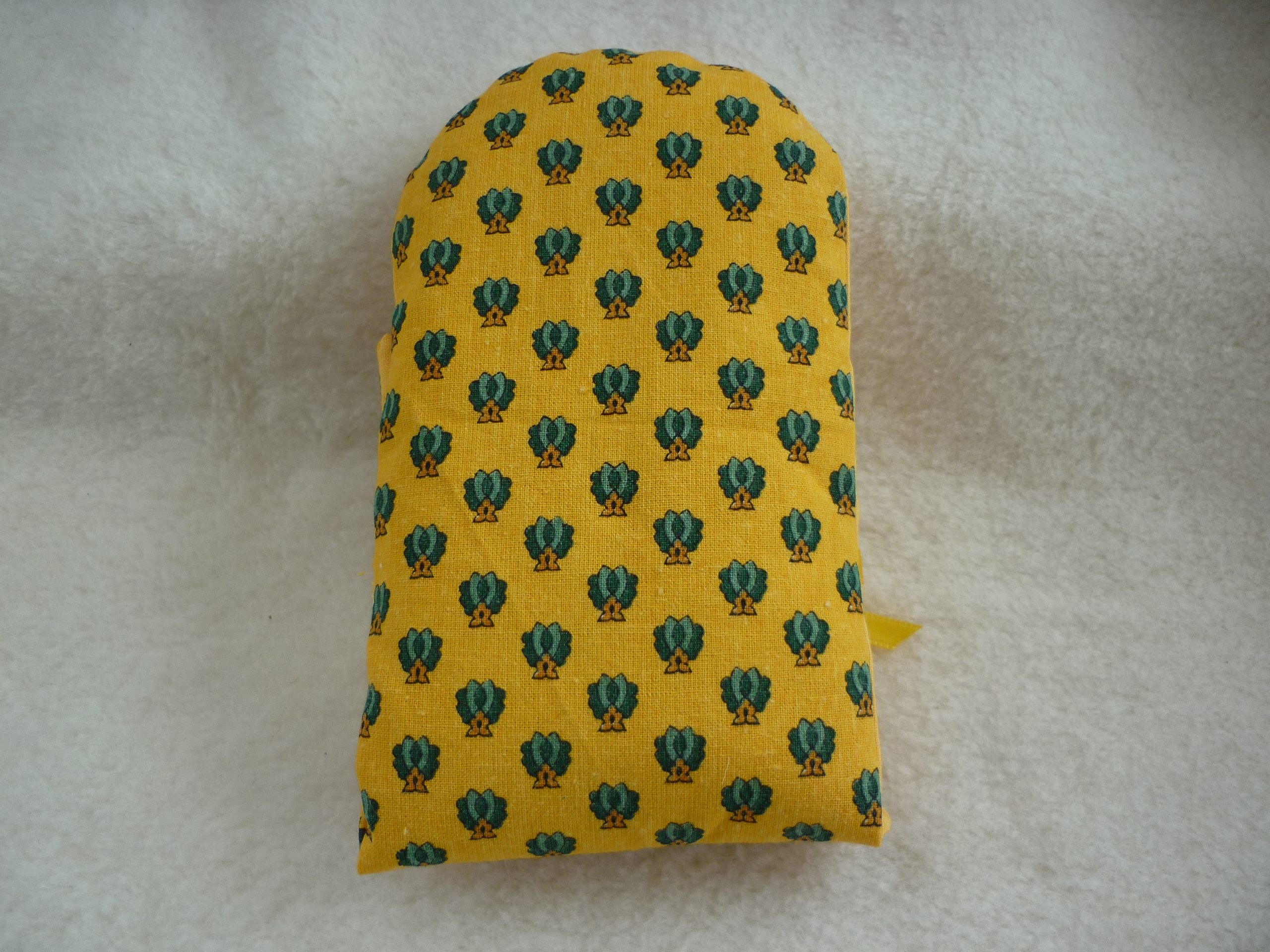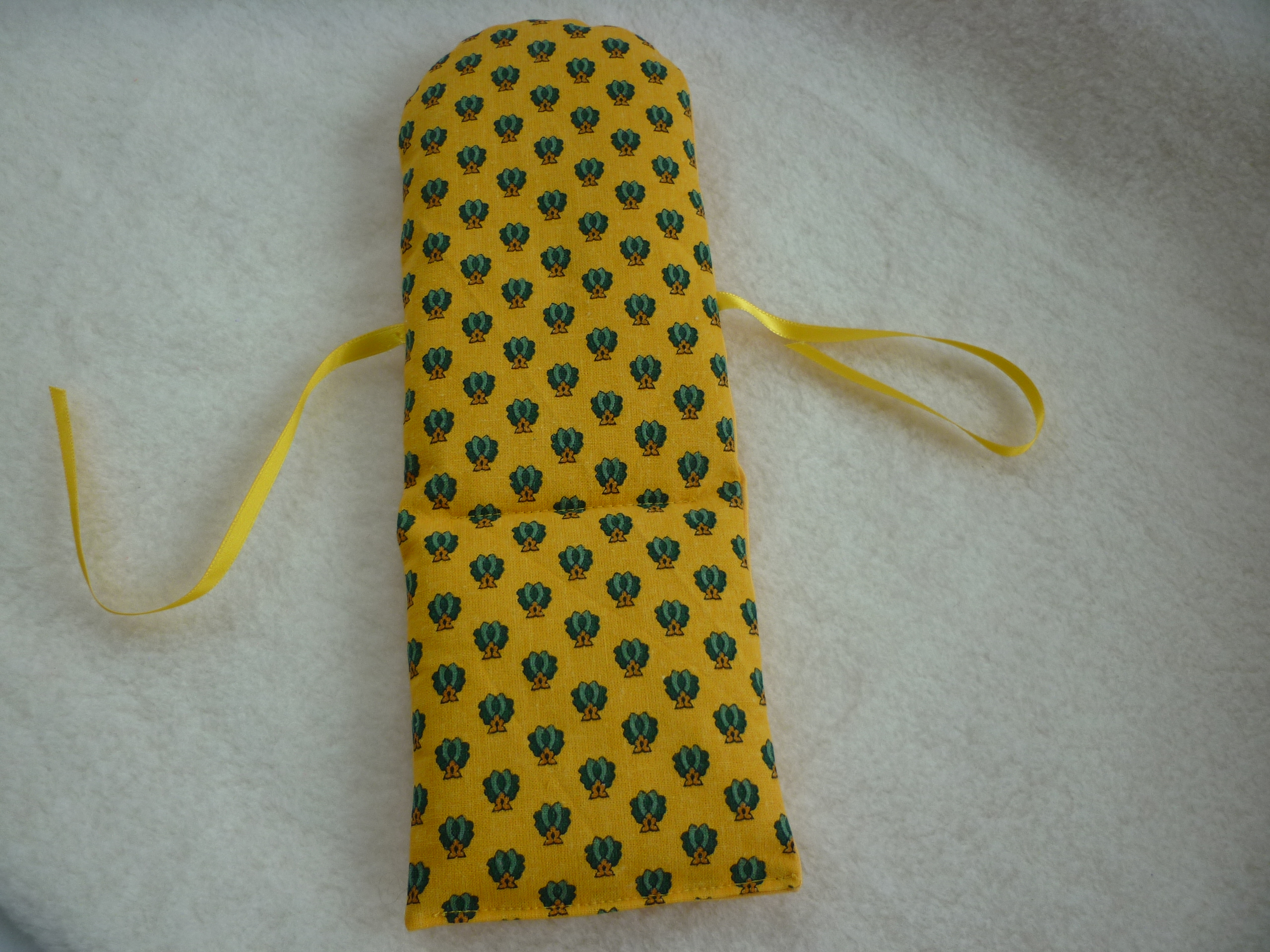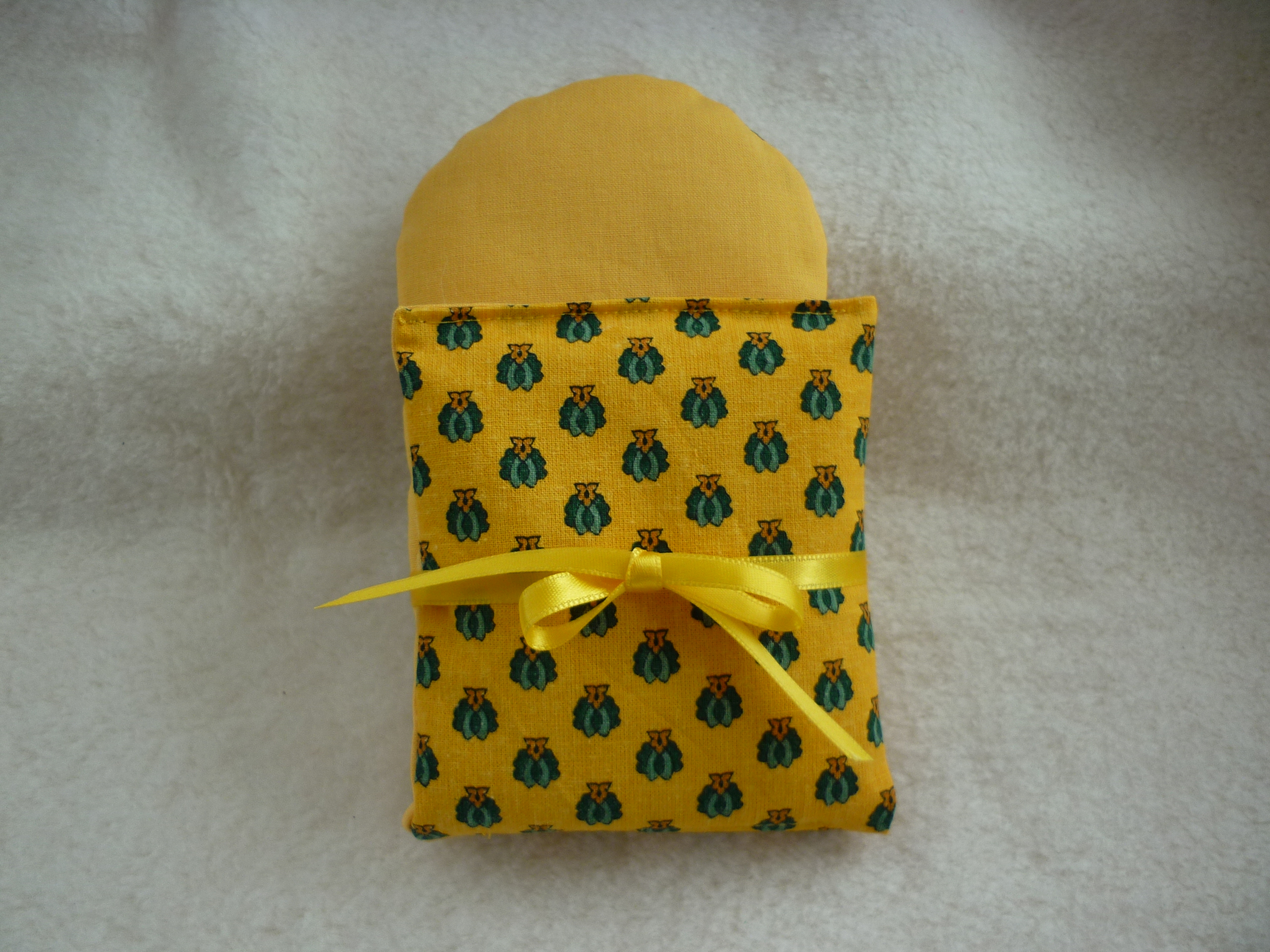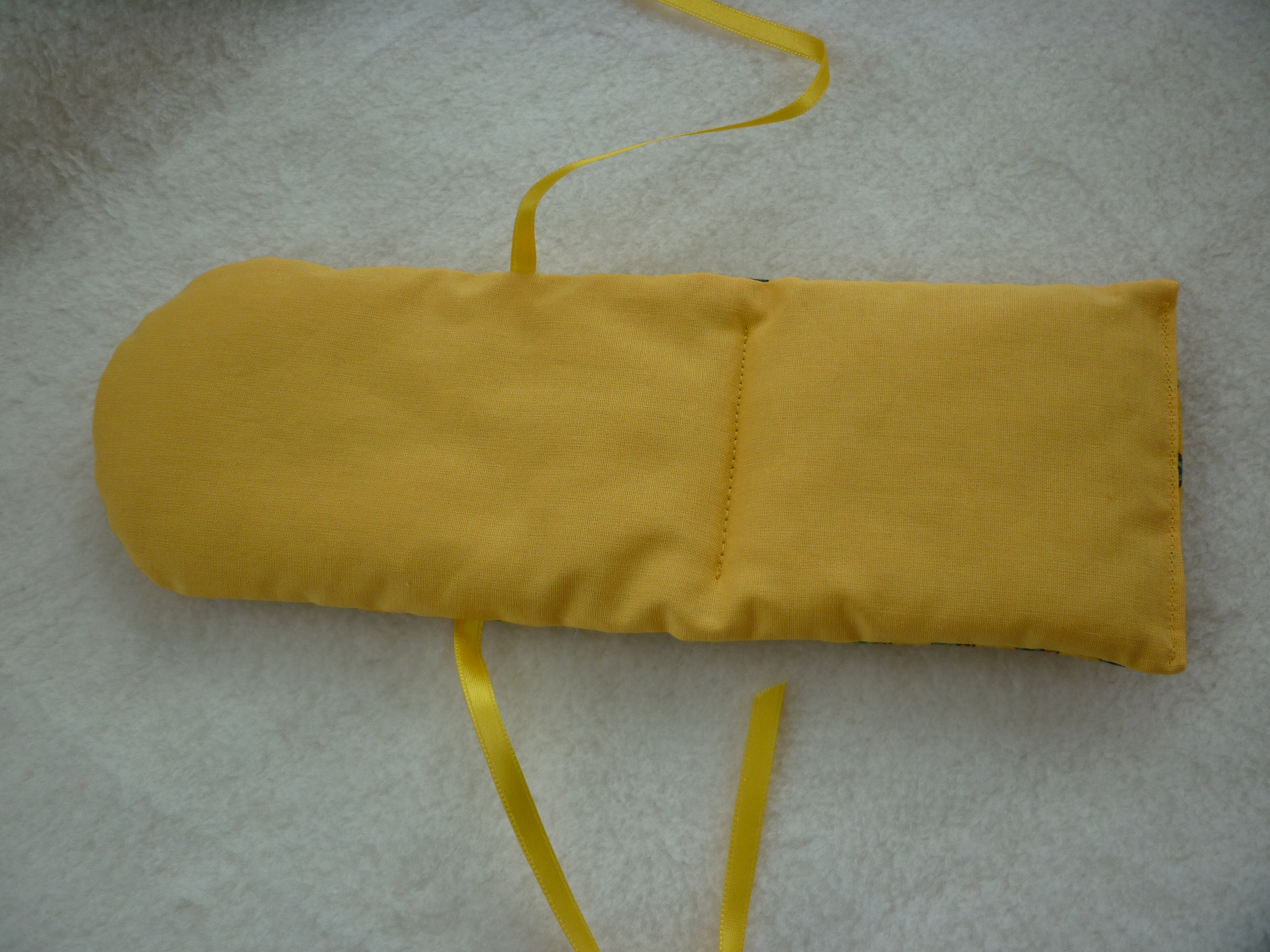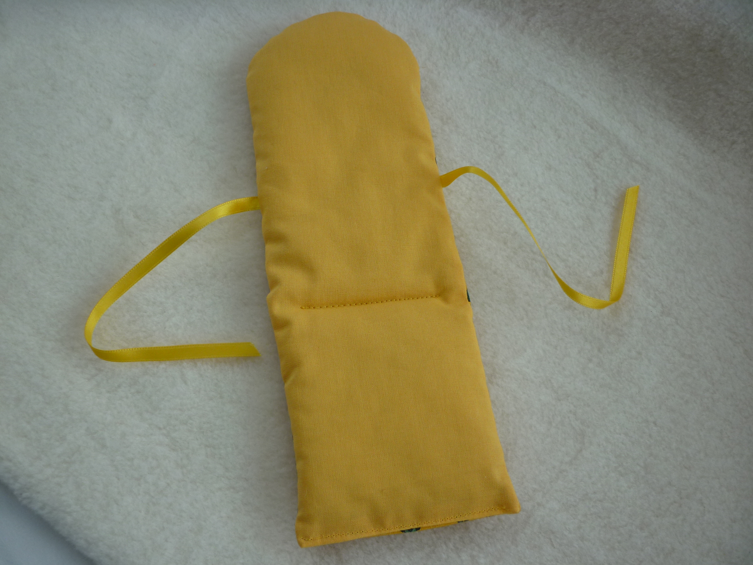 Steckbettchen ist aus zwei gelben Baumwollstoffen (mit Muster und uni) genäht und wird mit einem Satinband geschlossen. Gefüllt mit Schafwolle, deswegen bitte nur Handwäsche, da die Schafwolle sonst verfilzt.