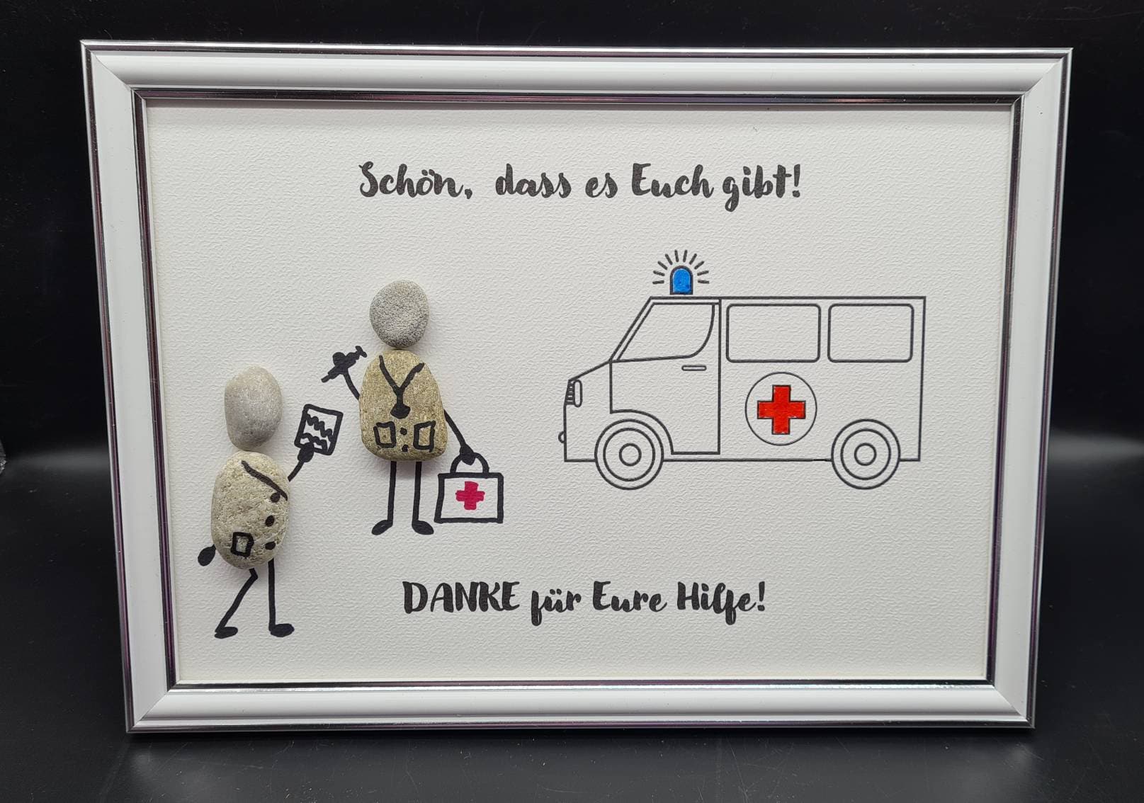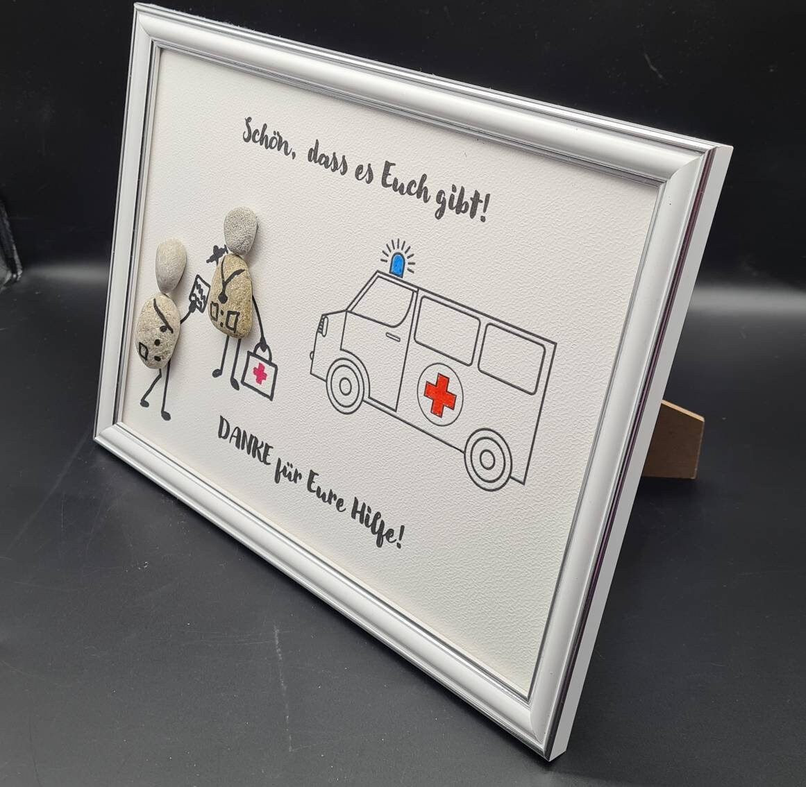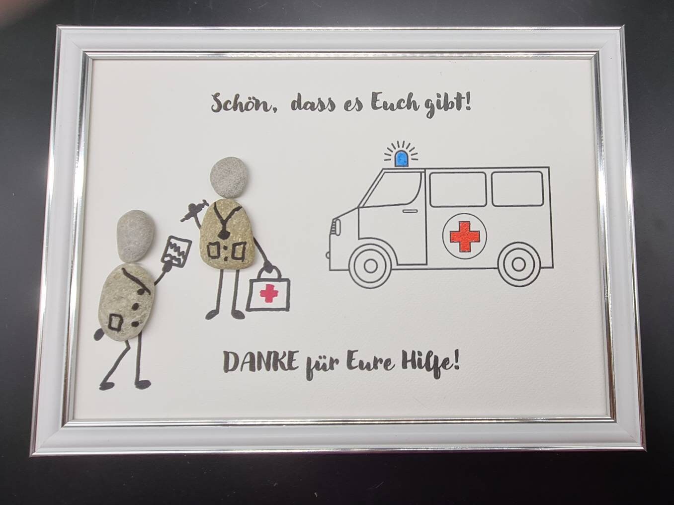 Das ideale Geschenk um Danke zu sagen. Liebevoll handgefertigtes Steinbild als Geschenk um Danke an die Krankenwagenfahrer, Rettungssanitäter, Notärzte etc. zu sagen. Bitte eventuell gewünschte Änderungen bei Bestellung mit angeben, wird nichts gesondert angegeben, wird das Bild mit dem abgebildeten Text und Motiv geliefert. Jedes Bild ist ein Unikat und wird direkt nach Bestelleingang angefertigt. Da es sich um Naturmaterialien handelt, kann es zu kleinen Abweichungen kommen. Auch die weiteren verwendeten Materialen (Rahmen, Tonkarton) können je nach Verfügbarkeit etwas variieren.