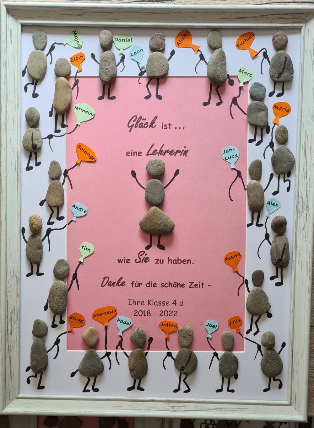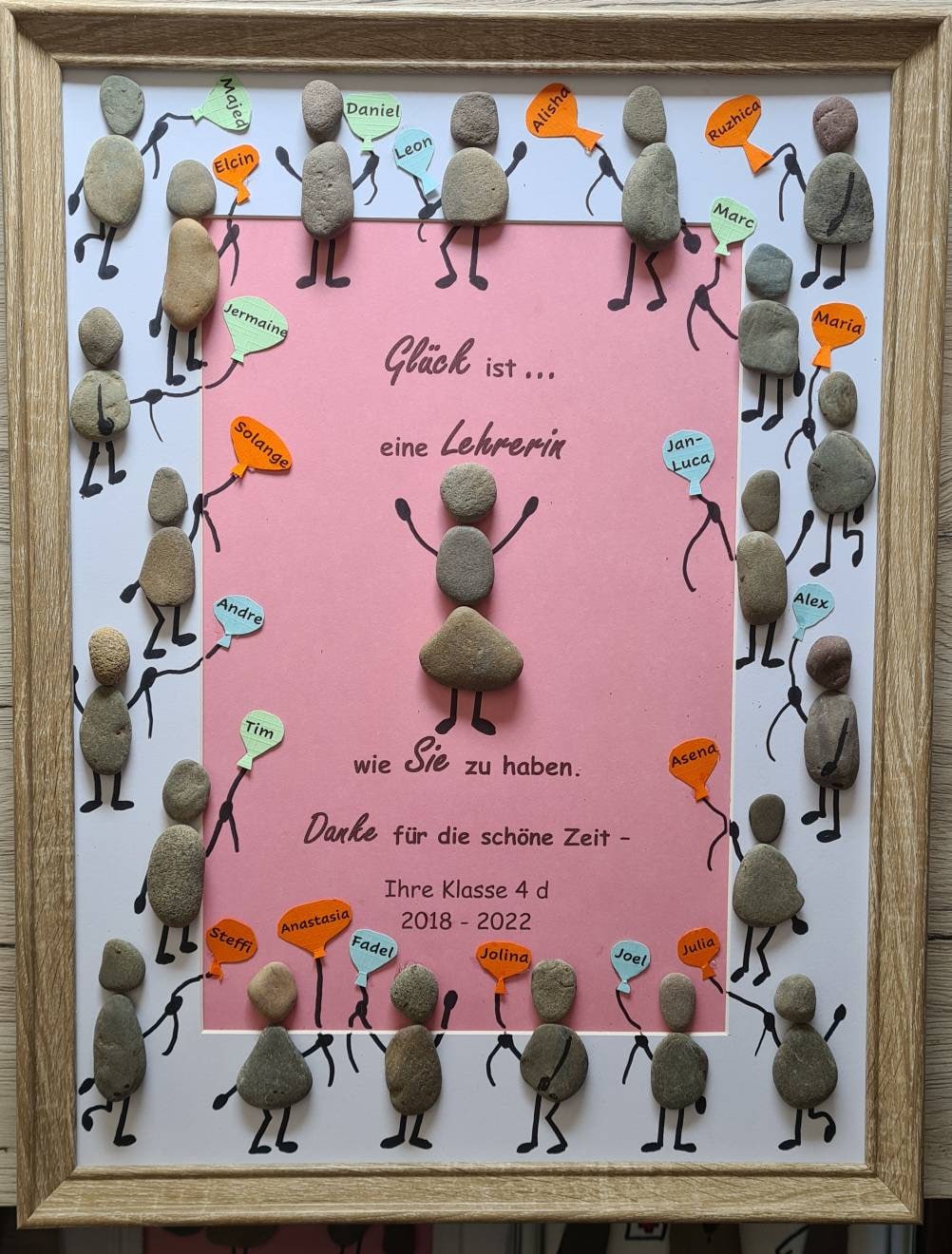 Liebevoll handgefertigtes Steinbild als Abschiedsgeschenk für die Lehrerin aber auch für den Lehrer als männliches Steinbild mit hellblauem Hintergrund, um Danke für die schöne Zeit zu sagen. Für den Lehrer kann selbstverständlich auch ein Hintergrund in hellblau oder hellgrün verwendet werden. Die ganze Schulklasse ist als Steinmännchen abbildbar (bis max. 24 Kinder). Personalisiert mit den Namen der Kinder in Luftballons. Bitte Namen und Klasse sowie Jahreszahlen bei der Bestellung als Nachricht angeben. Jedes Bild ist ein Unikat und wird direkt nach Bestelleingang angefertigt.