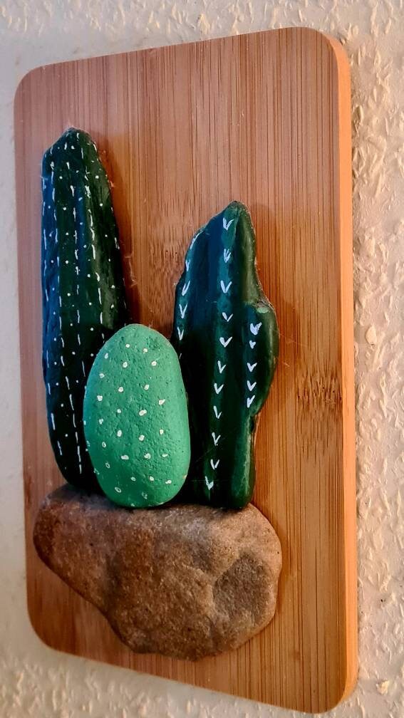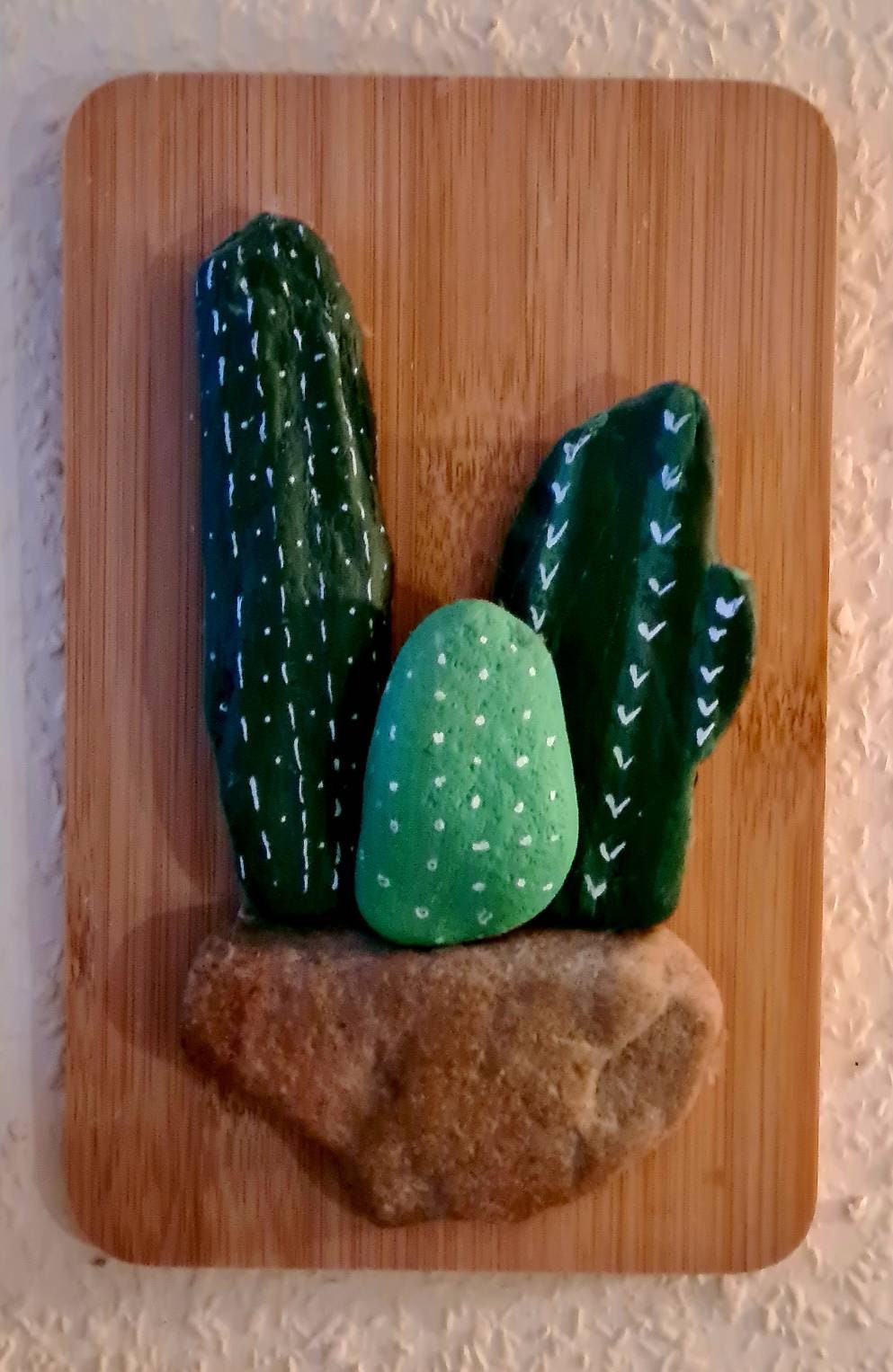 Steinbild in Form eines Kaktus, handgemalte auf einem Bambusbrettchen, mit Aufhänger auf der Rückseite.