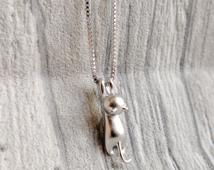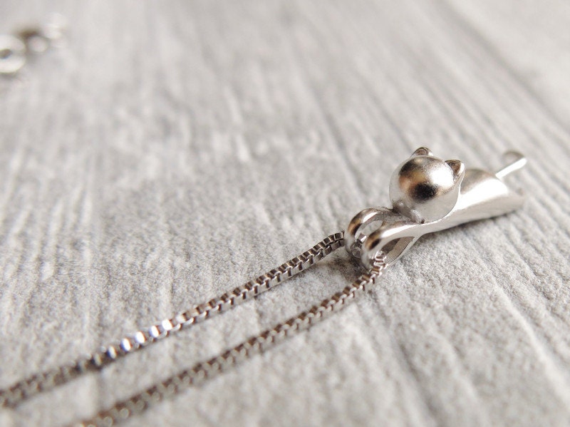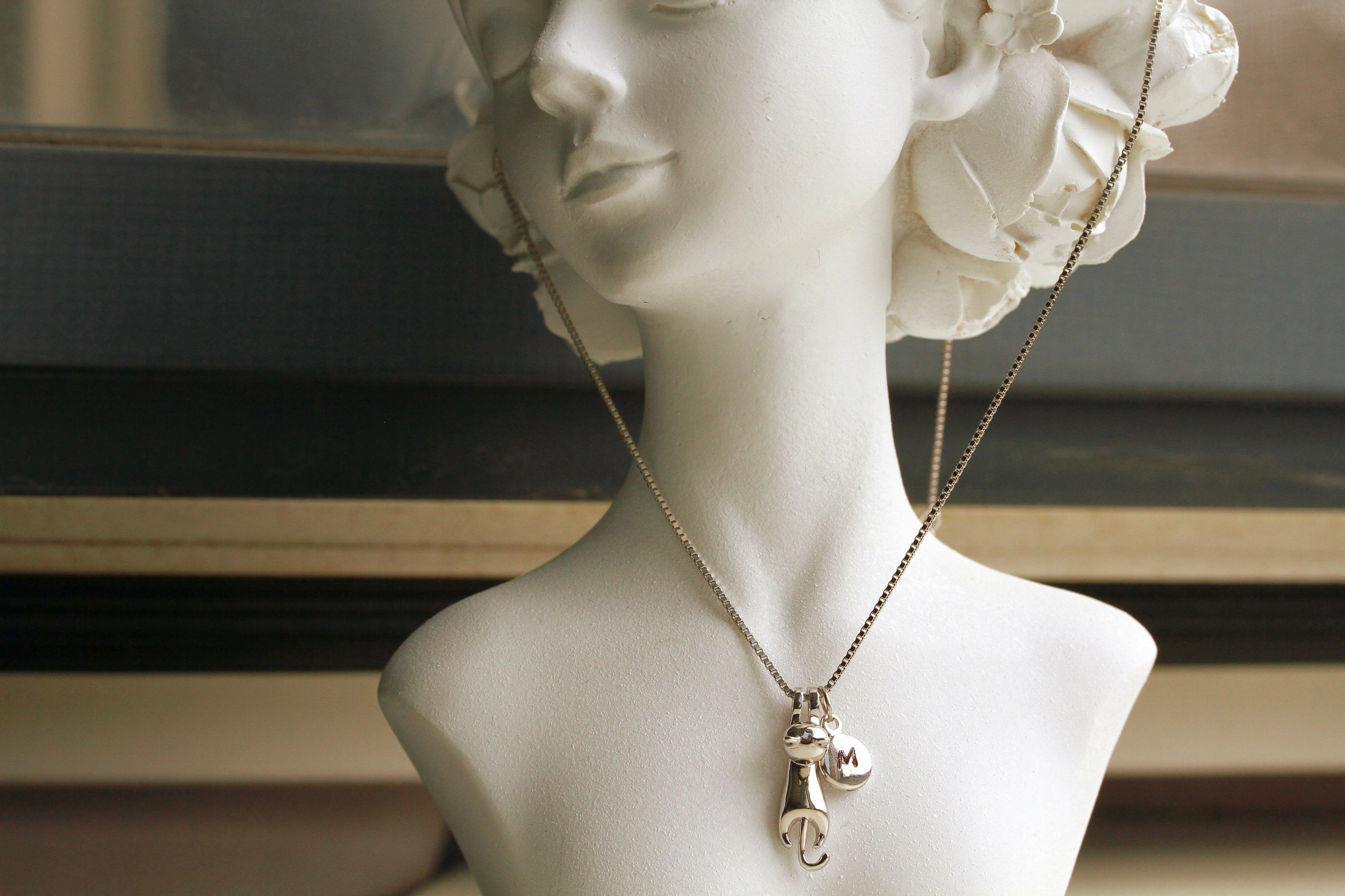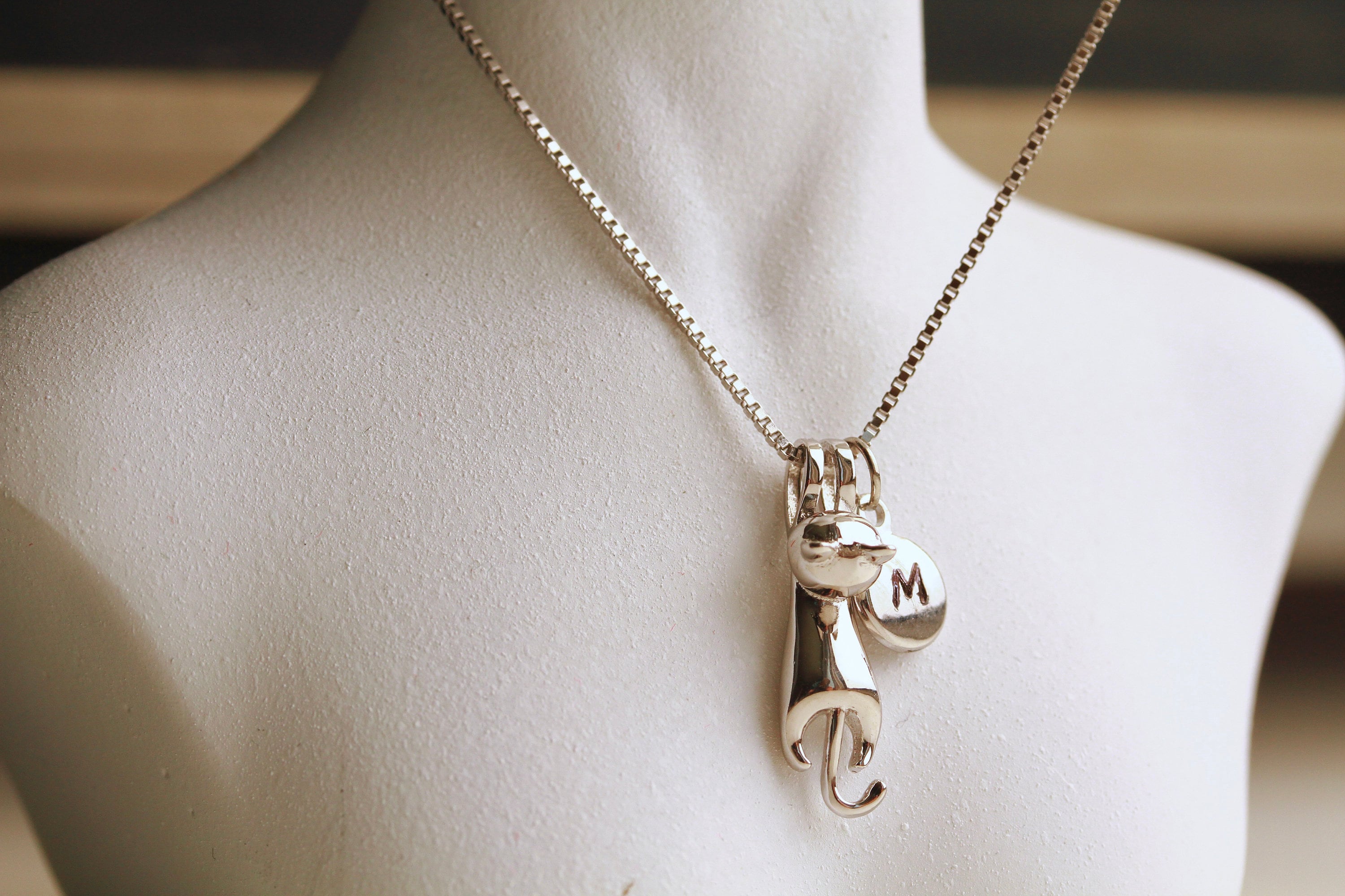 Sehr fein ausgearbeitete Kette aus Sterling Silber (925) mit einer kleinen hängenden Sterlingsilber Katze und personalisiertem Anhänger aus versilberten Messing, der mit einem Wunsch Initial per Hand bestempelt wird. Den Wunschbuchstaben können Sie uns ganz einfach in oder nach der Bestellung mitteilen.