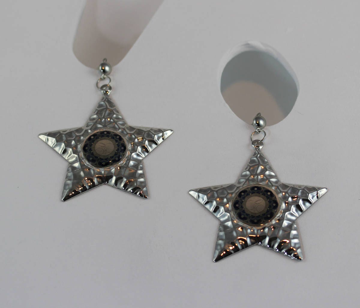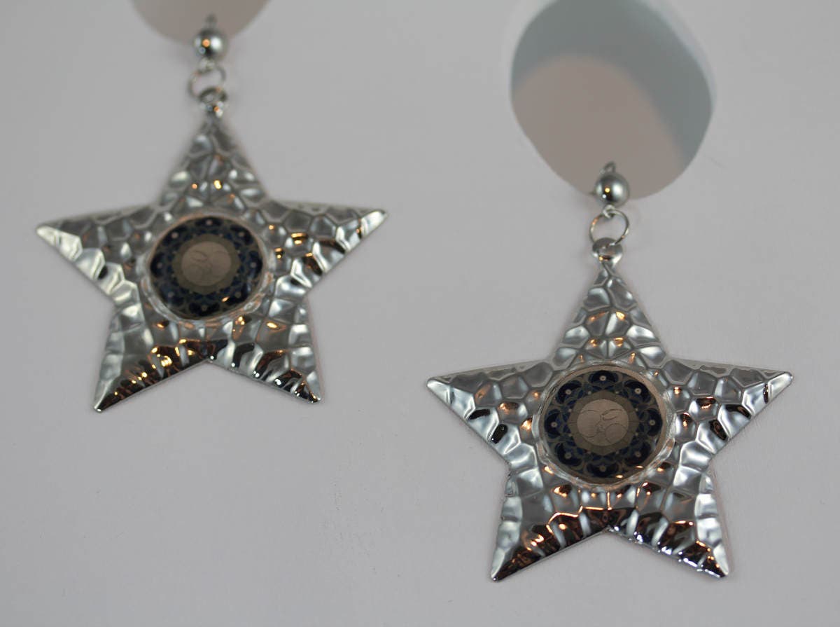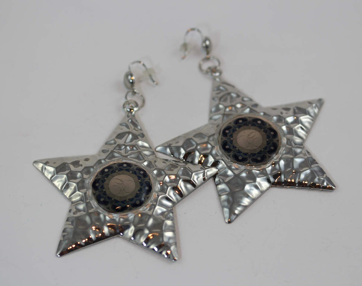 Eindrucksvolle Stern-Ohrringe mit dem Mond Mandala Motiv "Lunasacrada" auf silbernem Grund in gehämmerter Struktur.