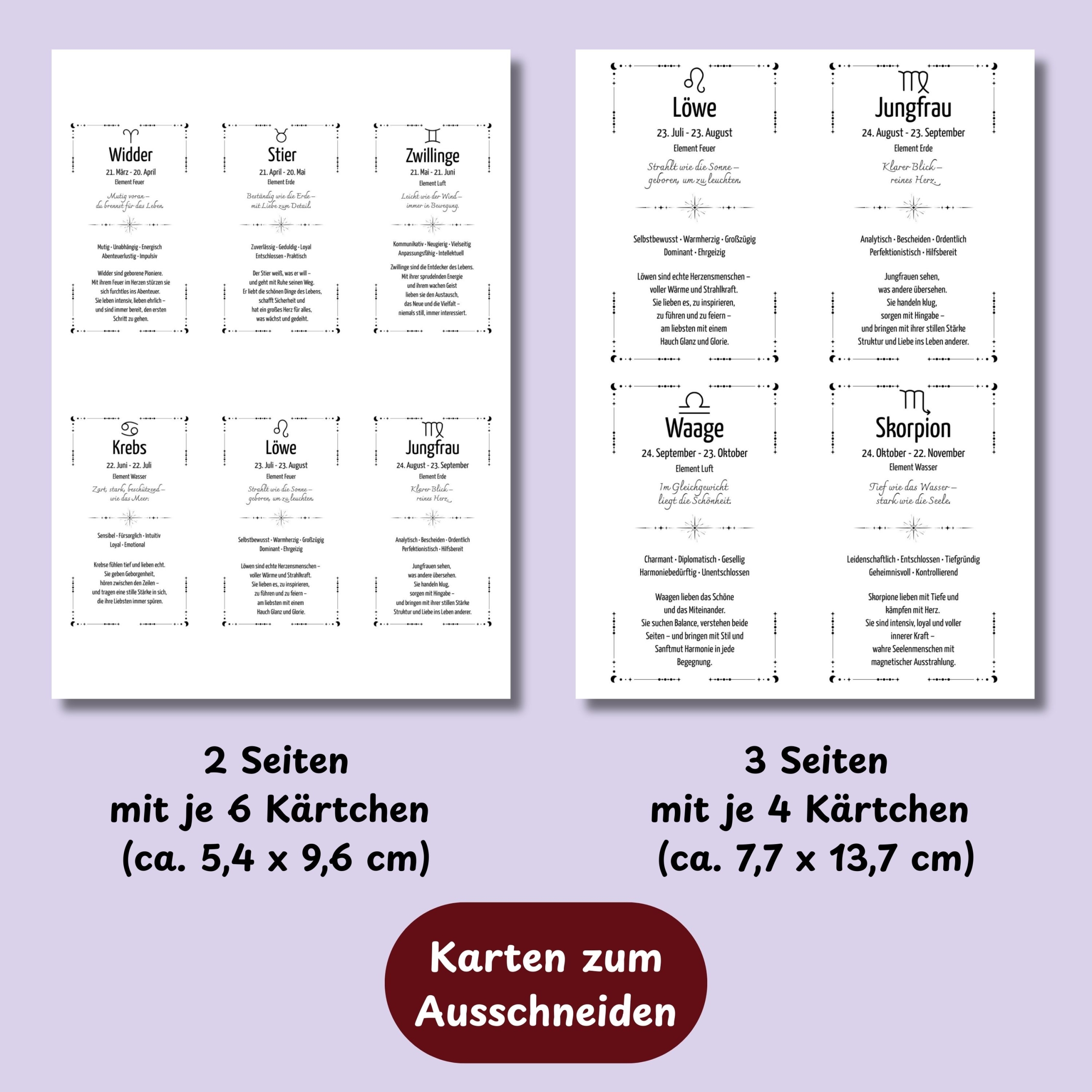 12 digitale Sternzeichen Karten zum Ausdrucken in 2 verschiedenen Größen; PDF Datei