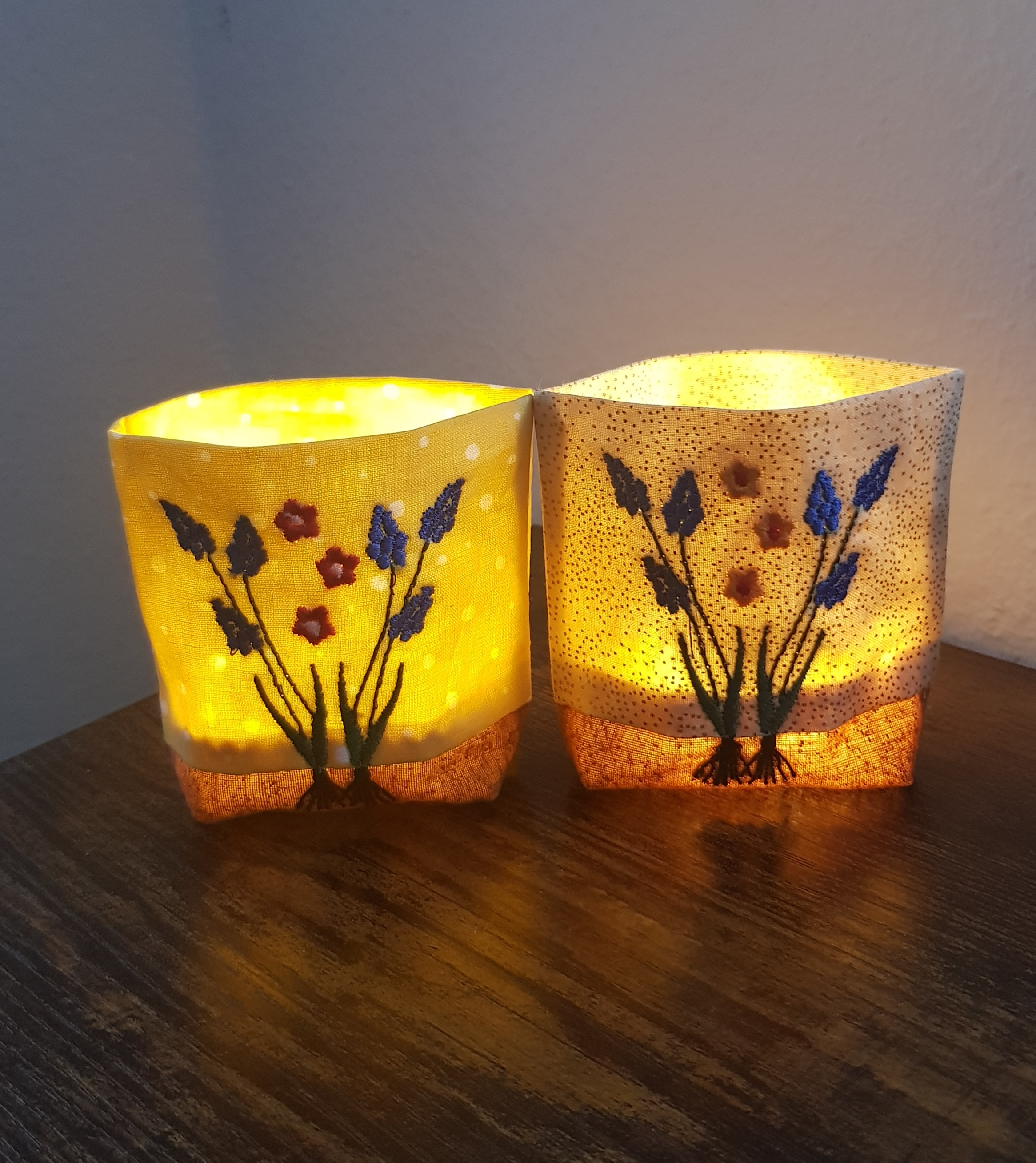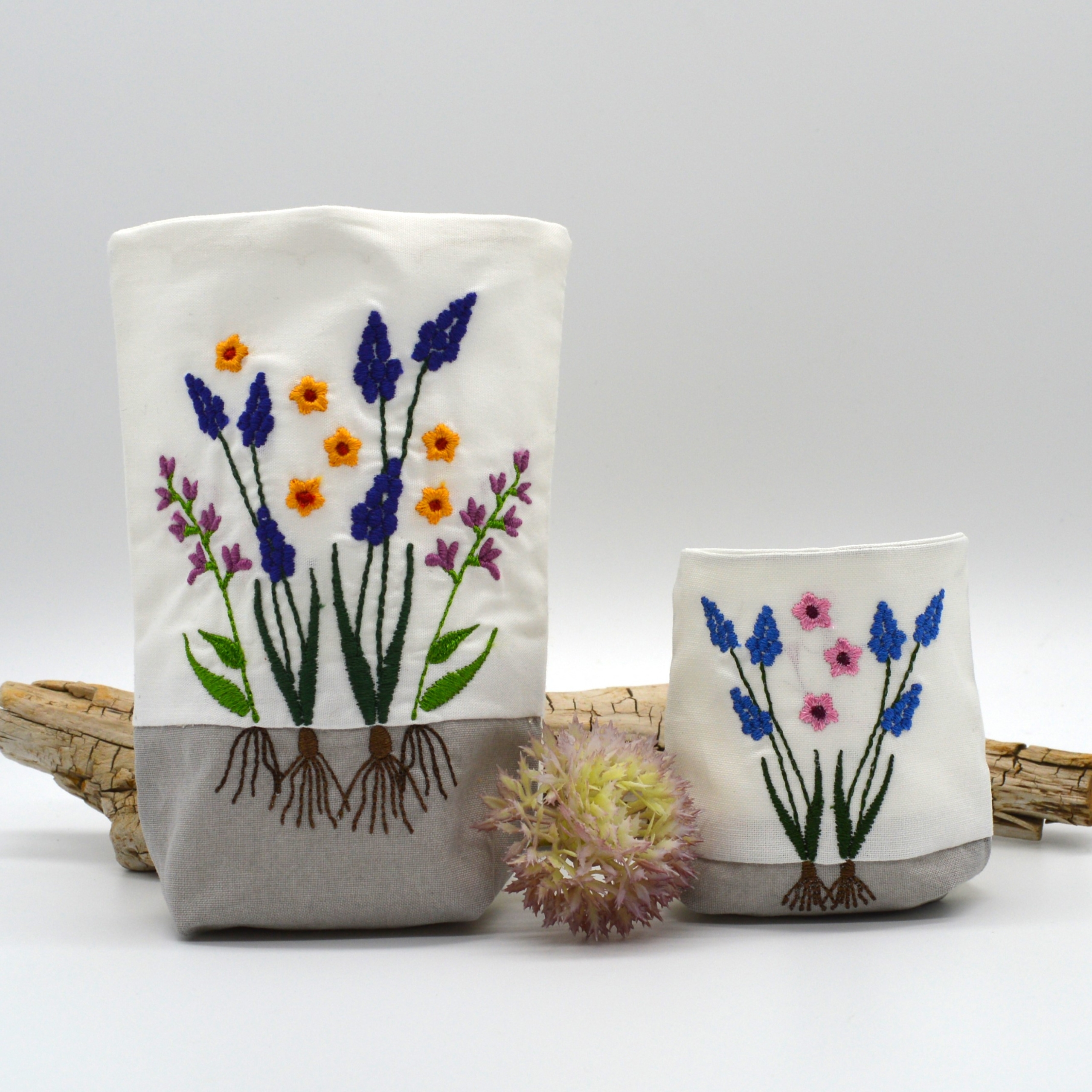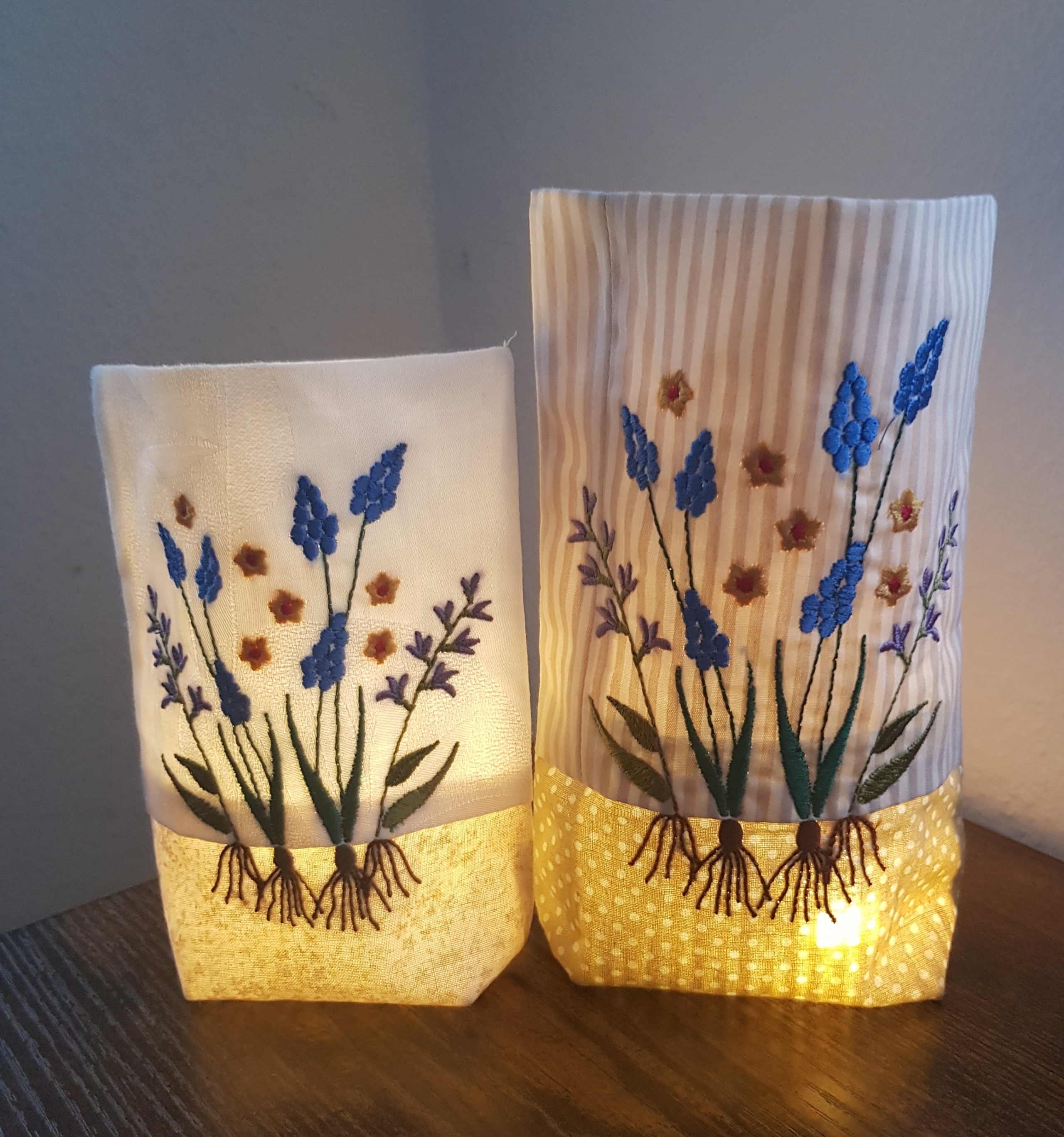 Lichterbeutel bestickt mit Frühlingsblumen. Verwendet man für den unteren Stoffstreifen einen braunen Stoff, wirkt es, als wüchsen die Zwiebeln in den "Boden" hinein.