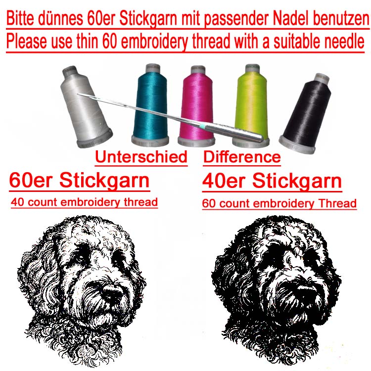 Für realistische Stickdateien sind deutlich mehr Stiche als gewöhnlich nötig, damit sie ein schönes und detailreiches Ergebnis erhalten. Mit einem dickeren Garn und einer dickeren Nadel kann das Ergebnis unscharf und konturlos wirken. Zudem kann der Faden schneller reißen. Die Datei sollte auf einen festen Stoff sowie ein stabiles Stickvlies gestickt werden.