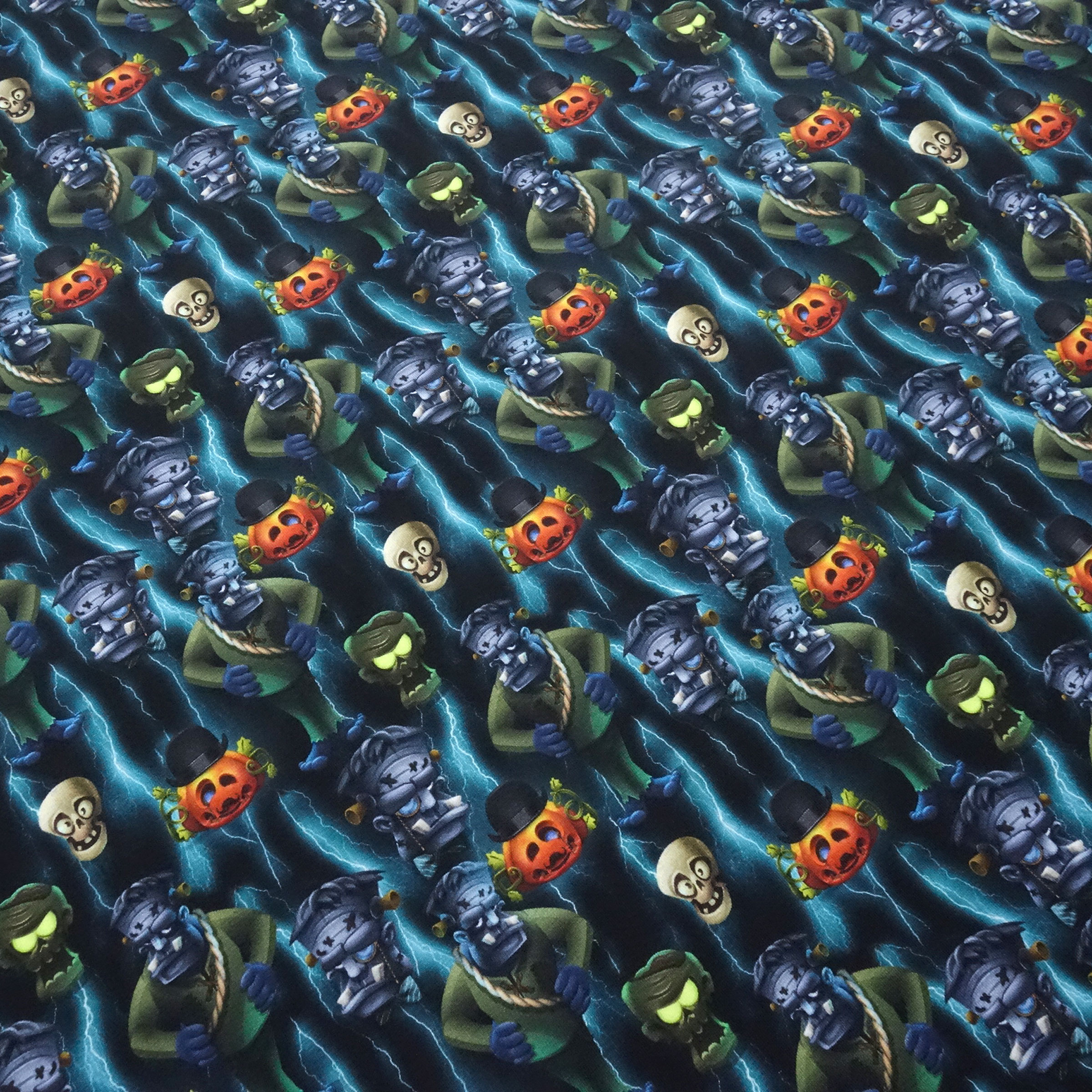 Schöne weiche und fließende Baumwolle/Elasthan-Jersey Qualität. Dieser Stoff ist mit einem tollen Halloween / Zombie / Kürbis / Skulls Design bunt bedruckt. Die großen Zombies haben eine Größe von ca. 5 x 8,5 cm. Ideal für Kinderkleidung wie Shirts, Hosen, Röcke, Kleider oder Accessoires wie Loops, Beanies etc.