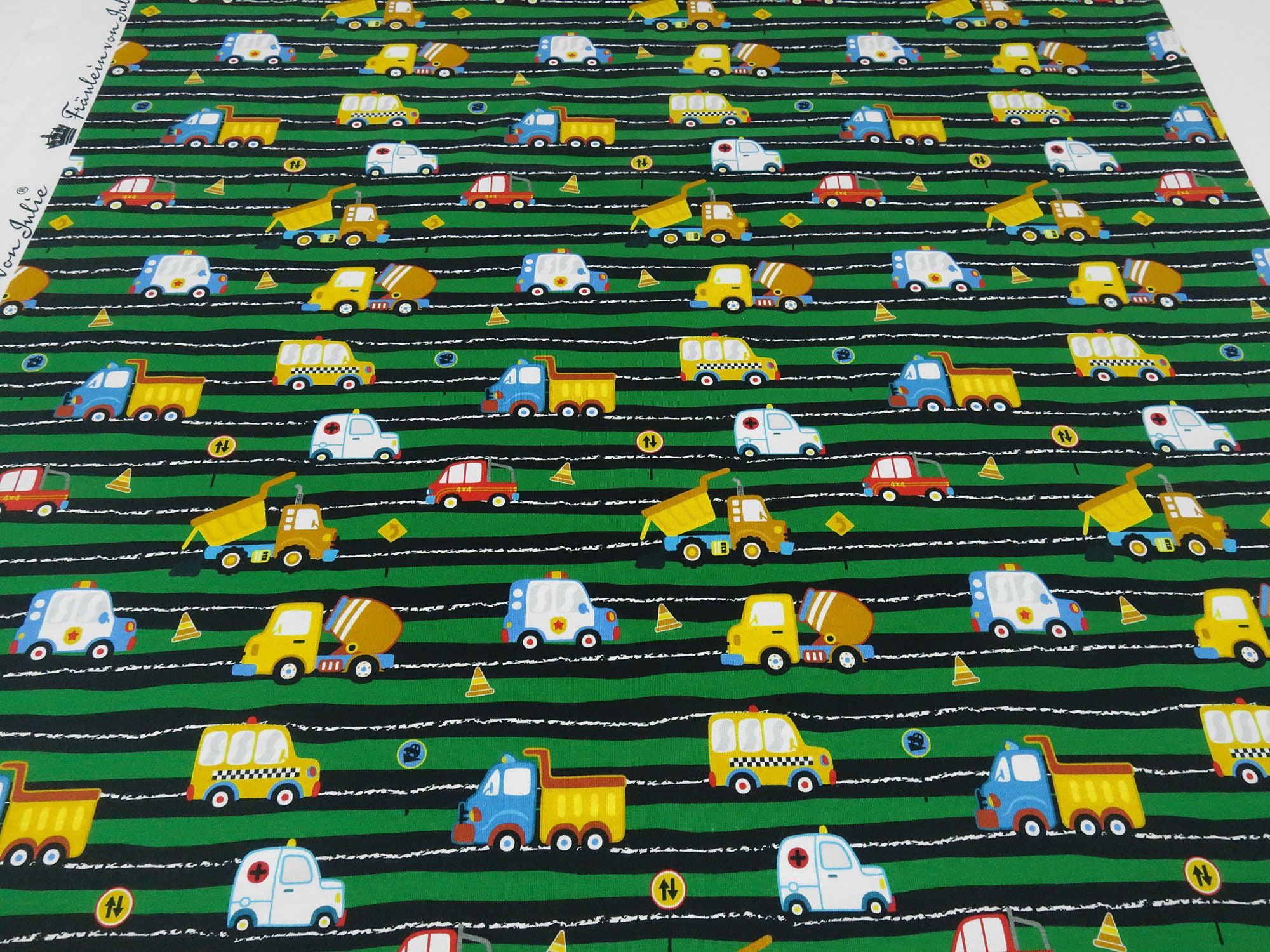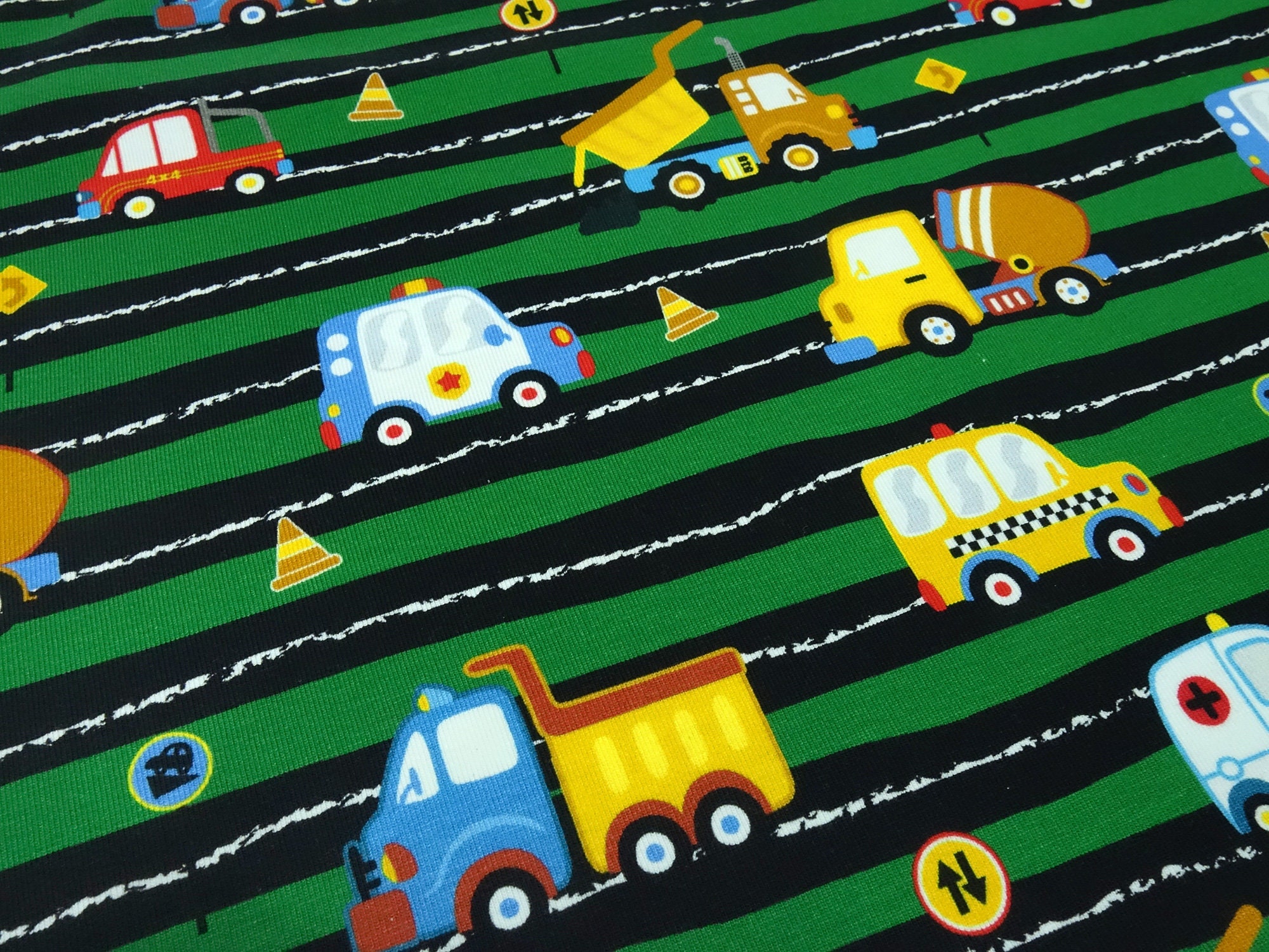 Stoff Baumwolle Jersey mit Auto Poilzeiauto Trucks LKW Betonmischer Design grün gelb blau bunt Kinderstoff Kleiderstoff!