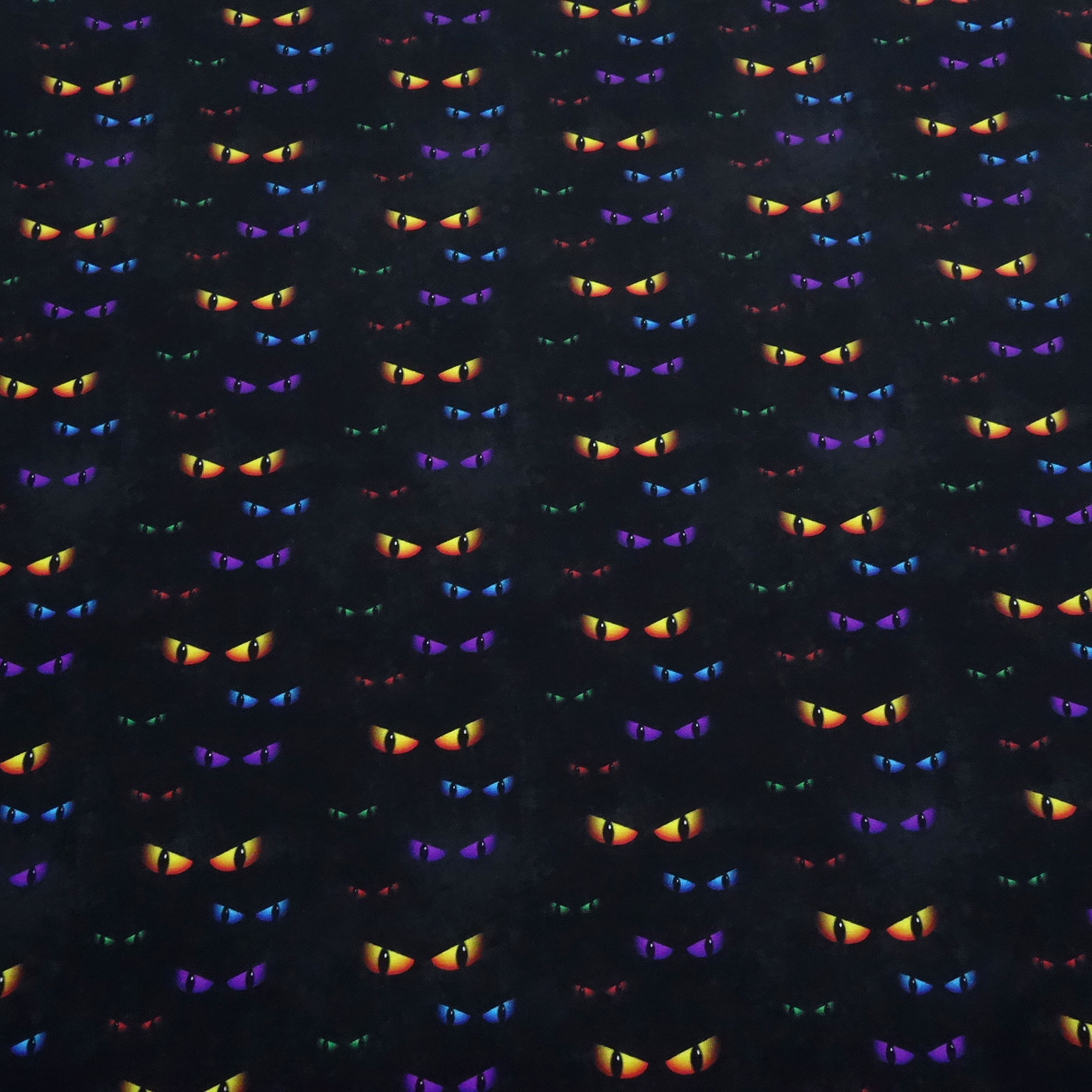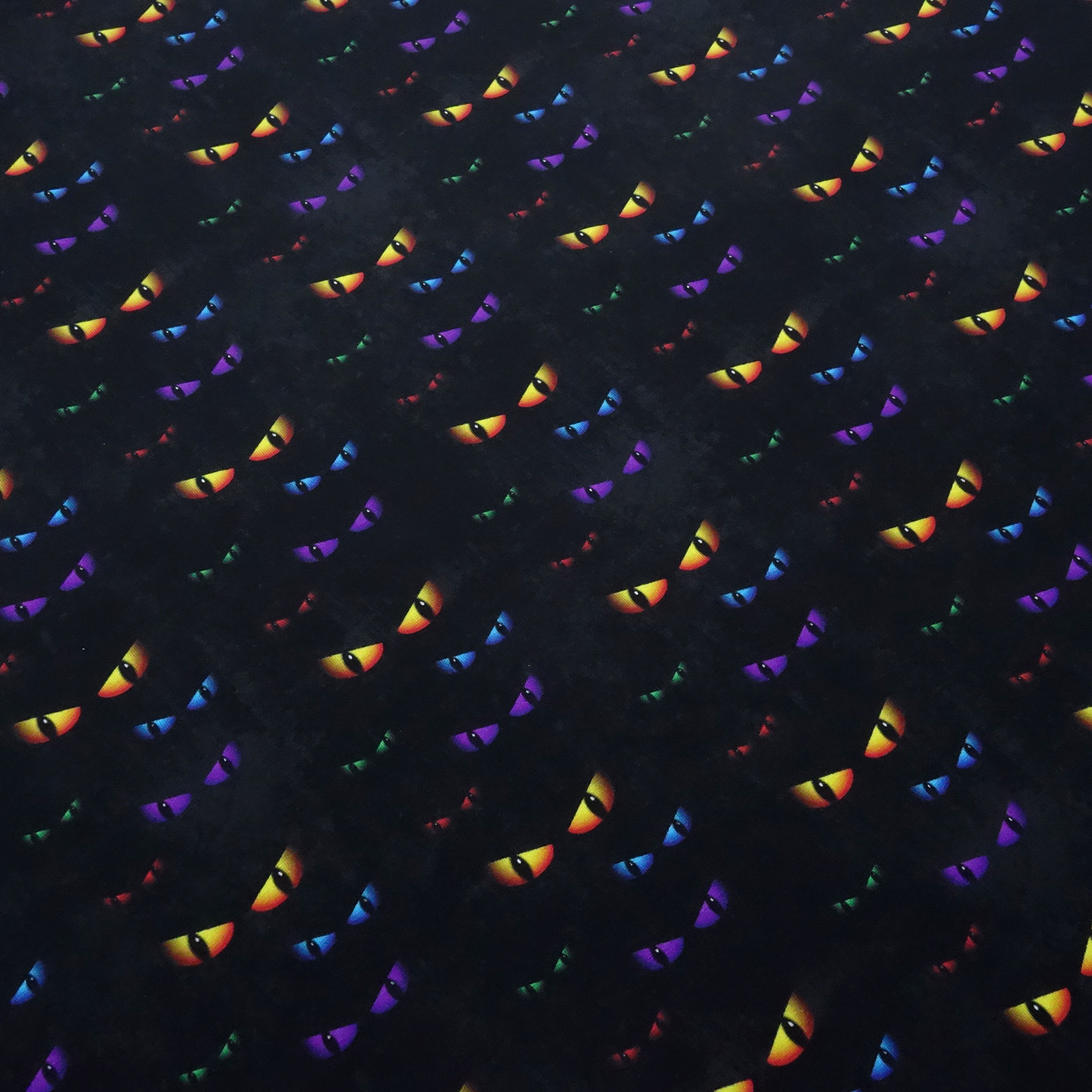 Schöne weiche und fließende Baumwolle/Elasthan-Jersey Qualität. Dieser Stoff ist mit einem Cat Eyes (Katzenaugen) Design - auf für Halloween sehr gut geeignet - bunt bedruckt. Die größten Katzenaugen haben eine Größe von ca. 1,5 x 5 cm. Ideal für Kleidung wie Shirts, Hosen, Röcke, Kleider oder Accessoires wie Loops, Beanies etc.
