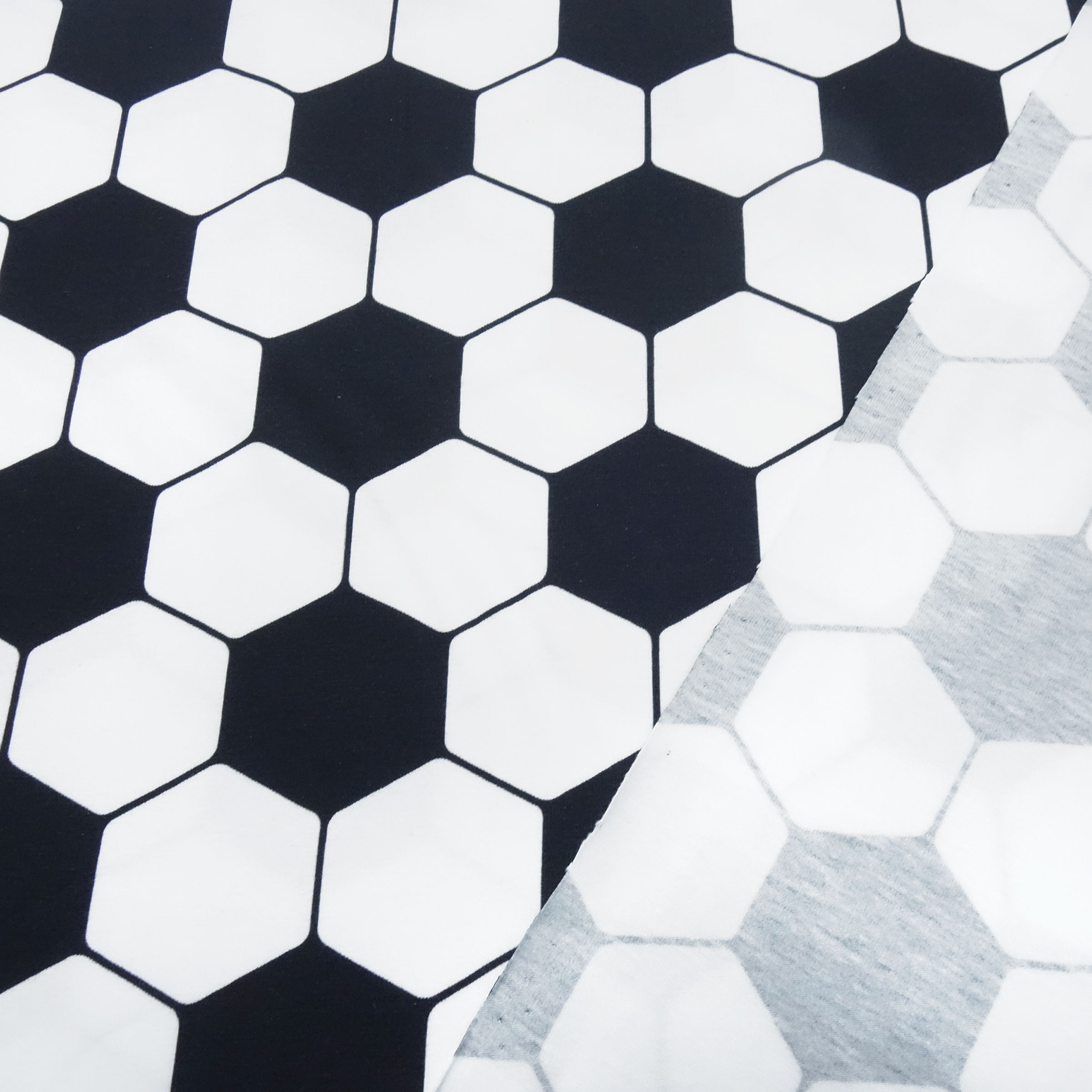 Tolle weiche und fließende Baumwolle/Elasthan-Jersey Qualität. Der Stoff ist mit einen Fußball Design weiß schwarz bedruckt. Die einzelnen Felder haben eine Größe von ca. 4,6 cm. Aus diesen Stoff können Sie T-Shirts, Kleider, Shirt, Tuniken, Röcke, Kinderkleidung oder auch Accessoires wie Loops etc. nähen.