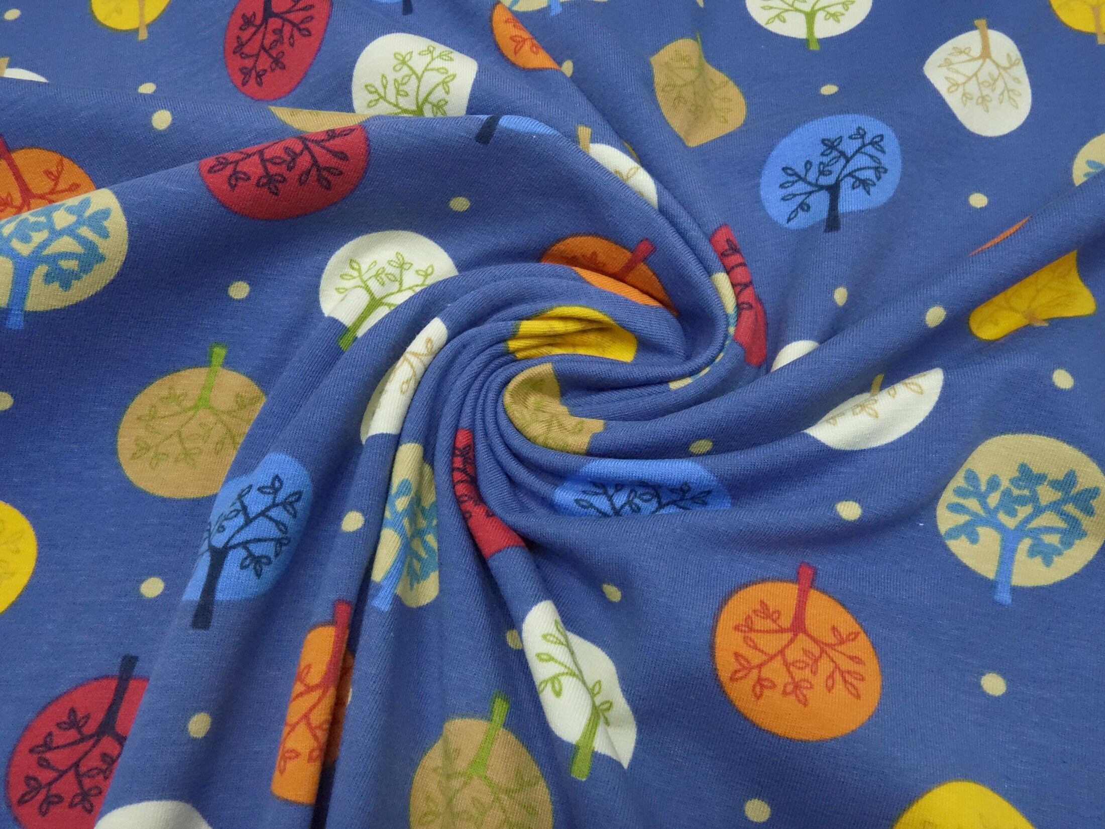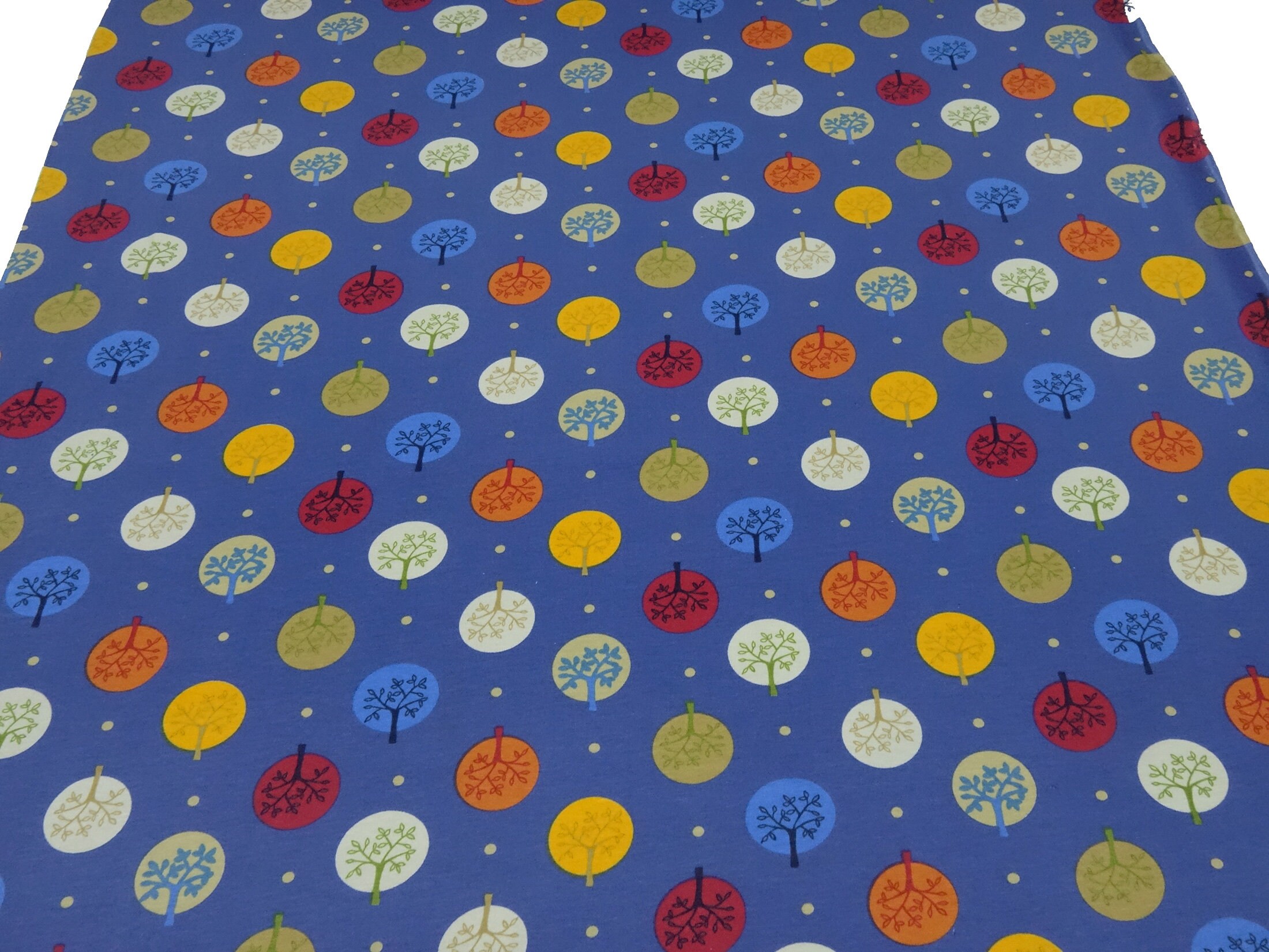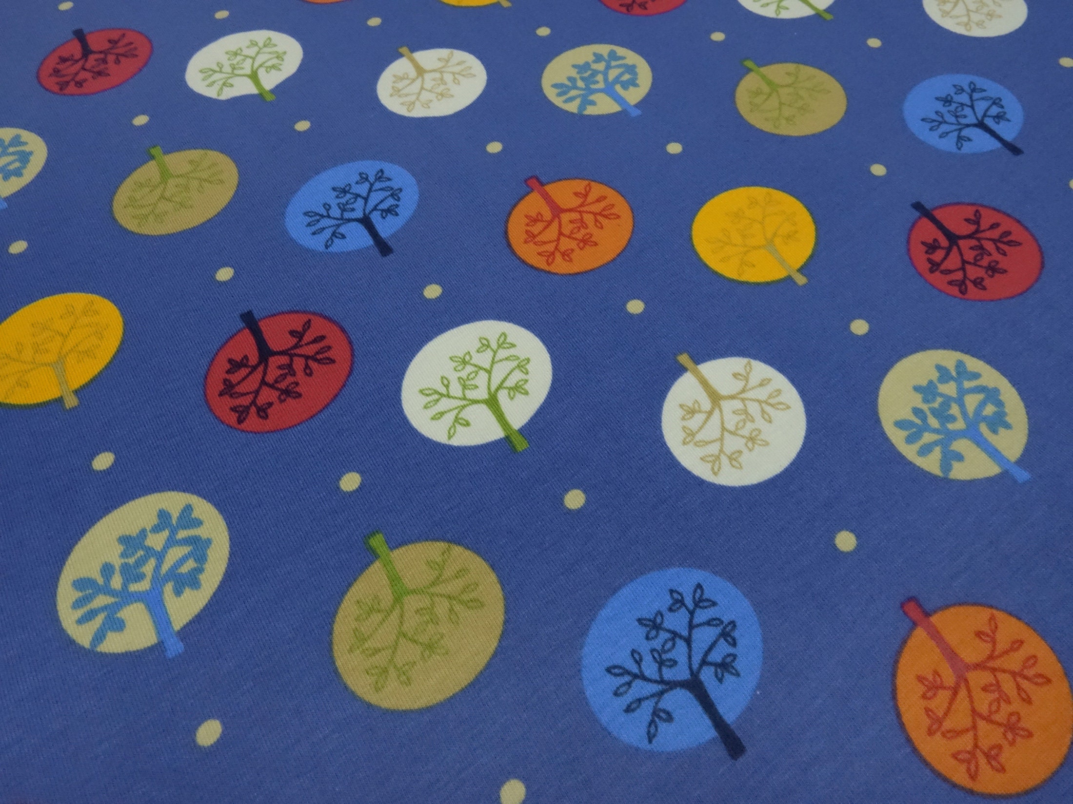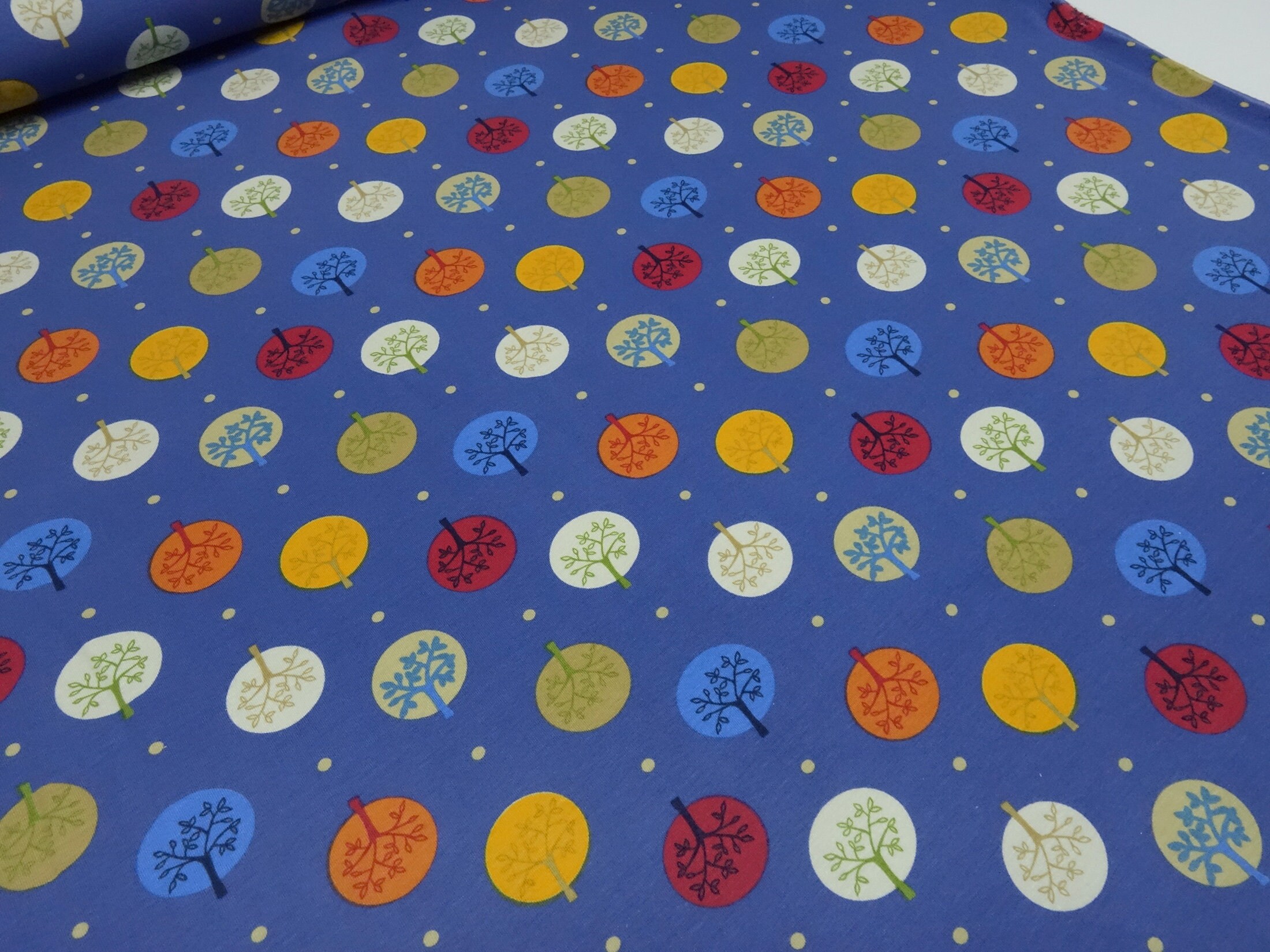 Stoff Baumwolle Jersey mit Kreise Punkte Bäume Design blau curry orange rot beige bunt Kinderstoff Kleiderstoff