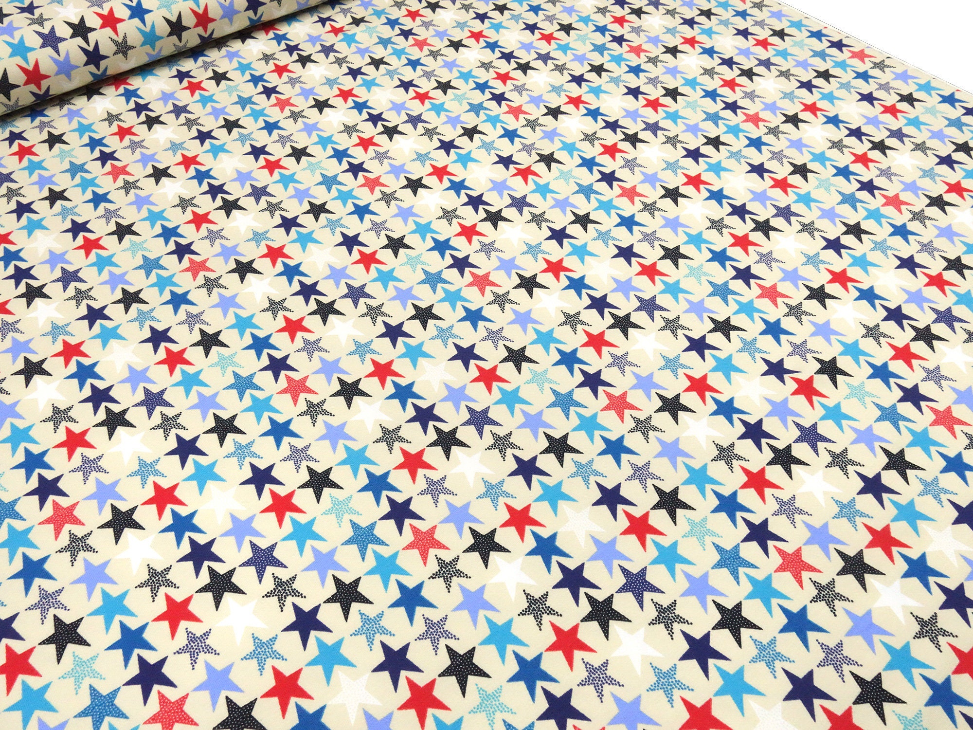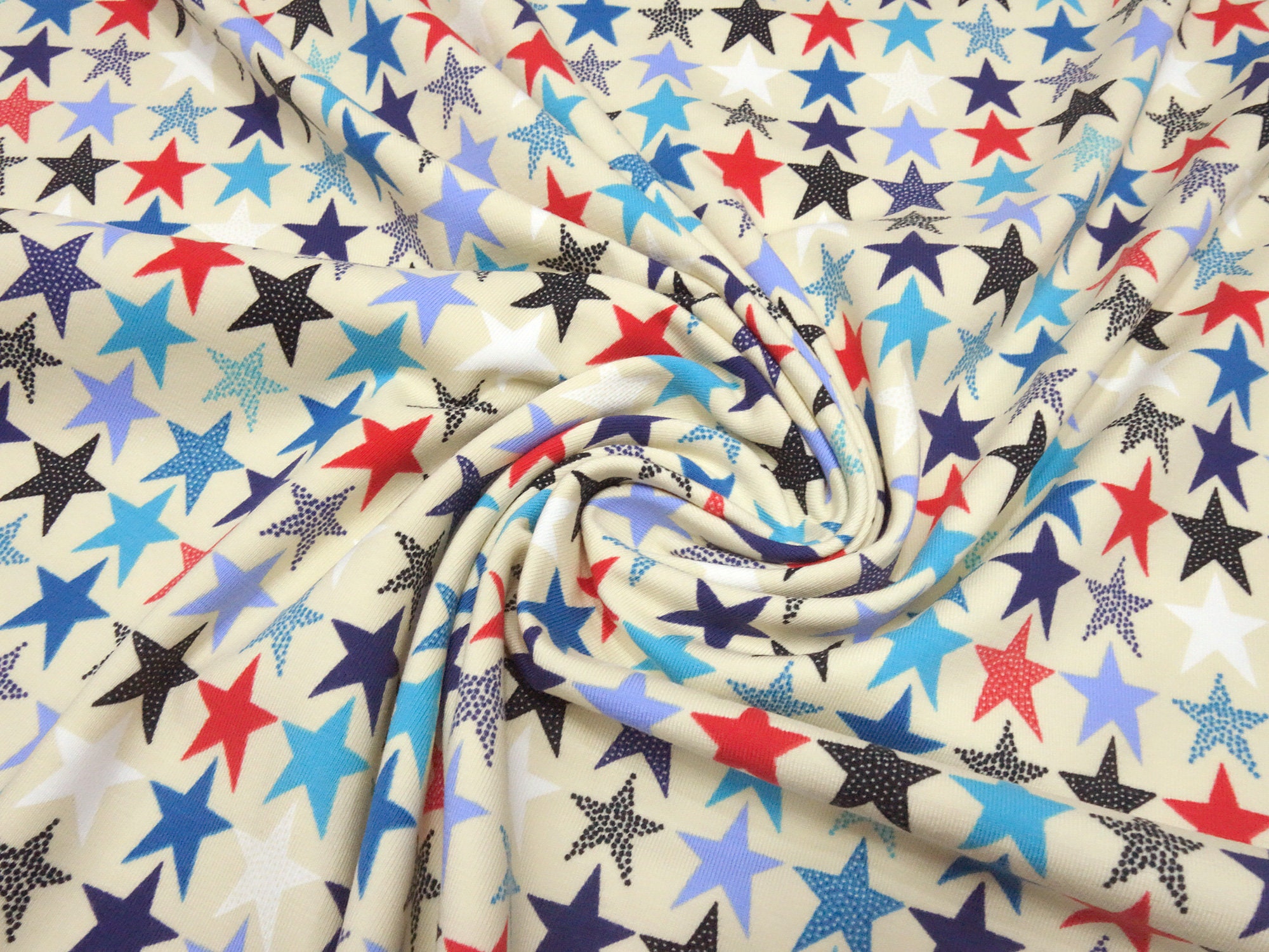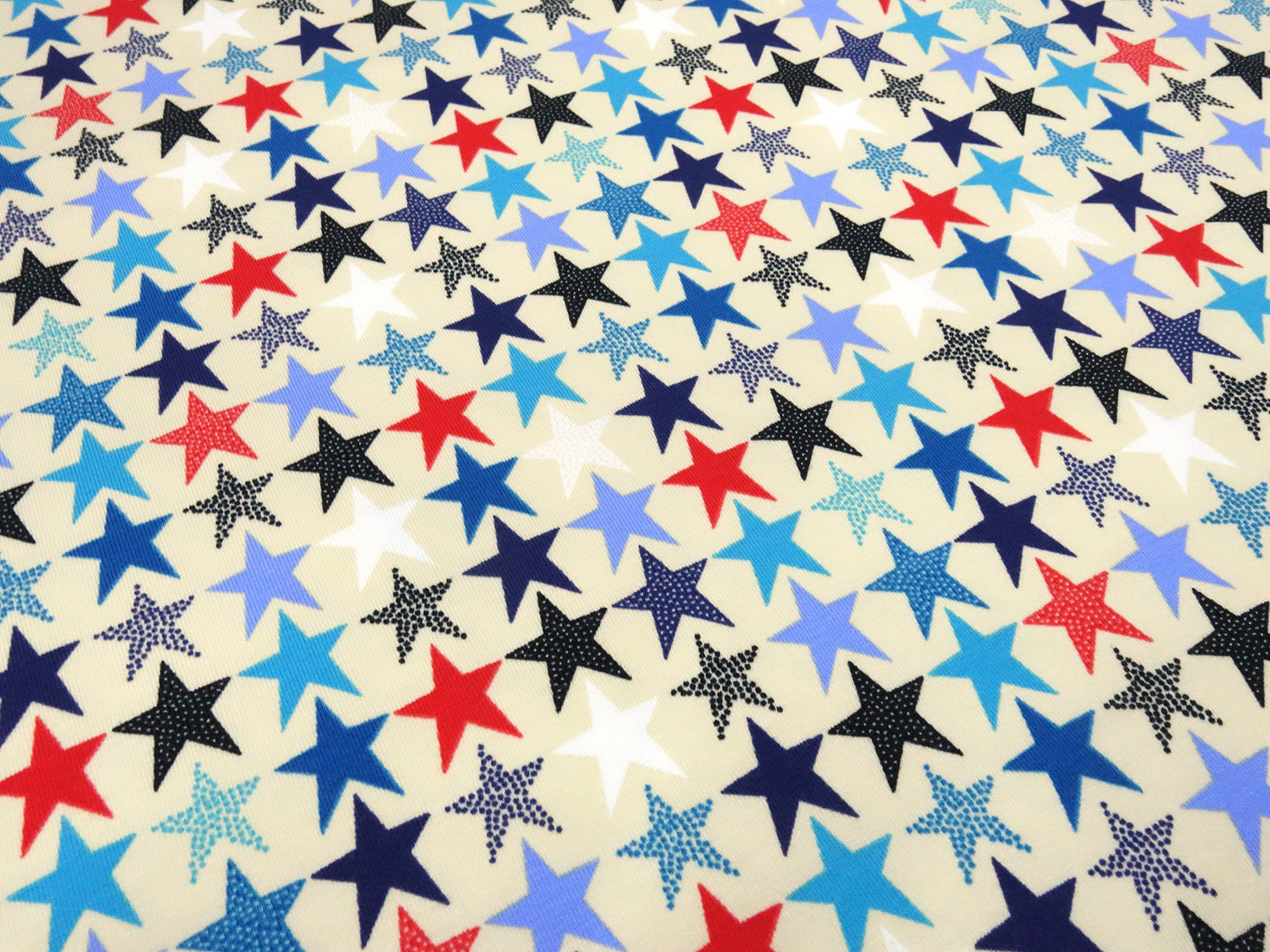 Stoff Baumwolle Jersey mit Sterne Design beige blau rot weiß schwarz Kinderstoff Kleiderstoff