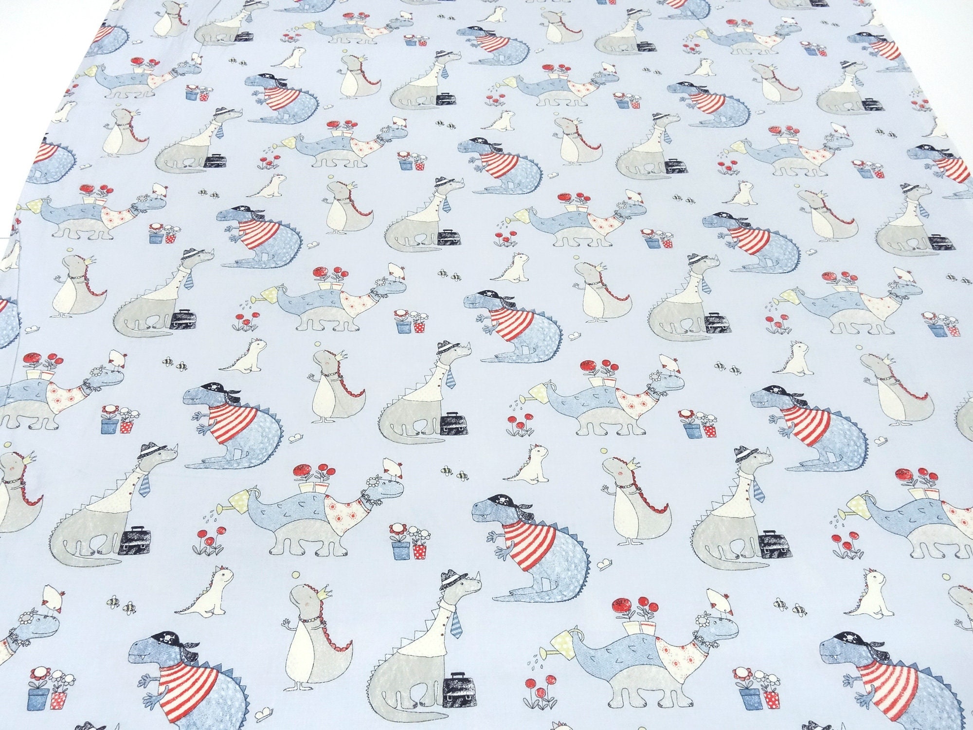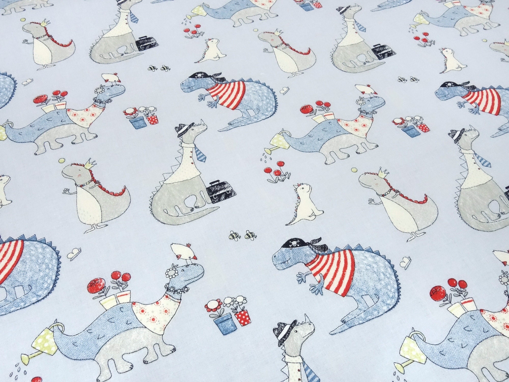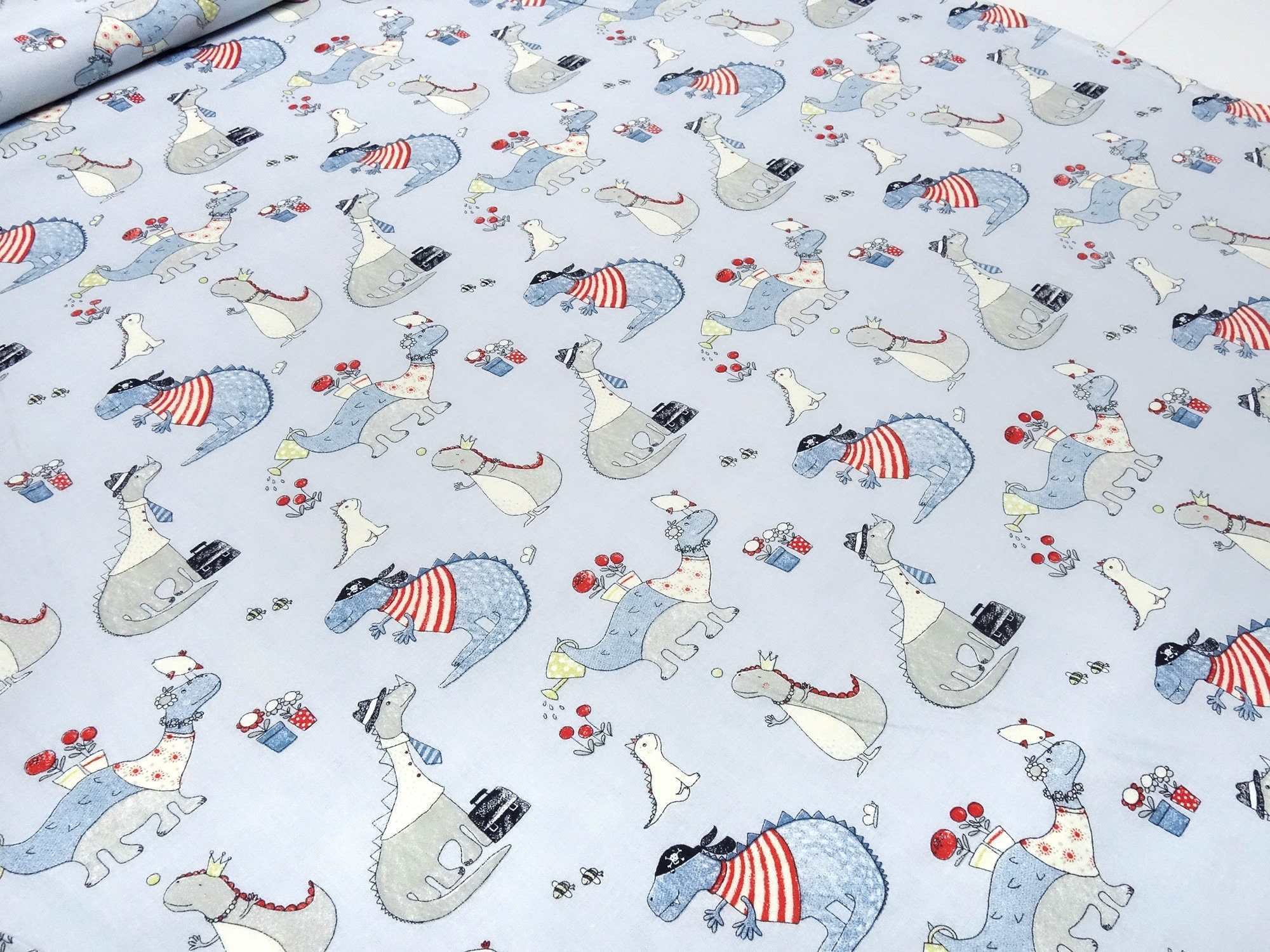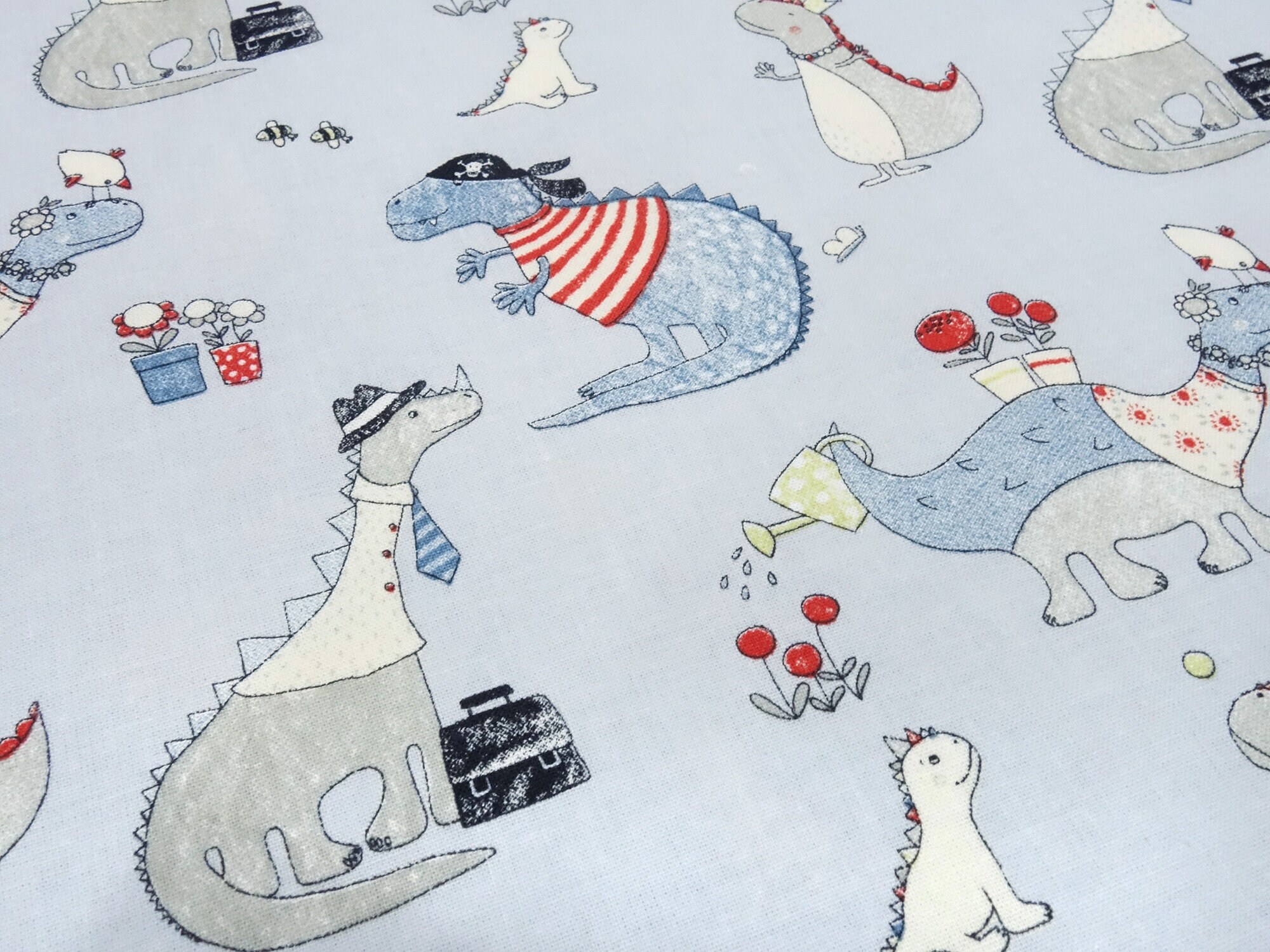 Baumwolle Popeline mit Dinos Dinosaurier Design hellblau blau rot weiß