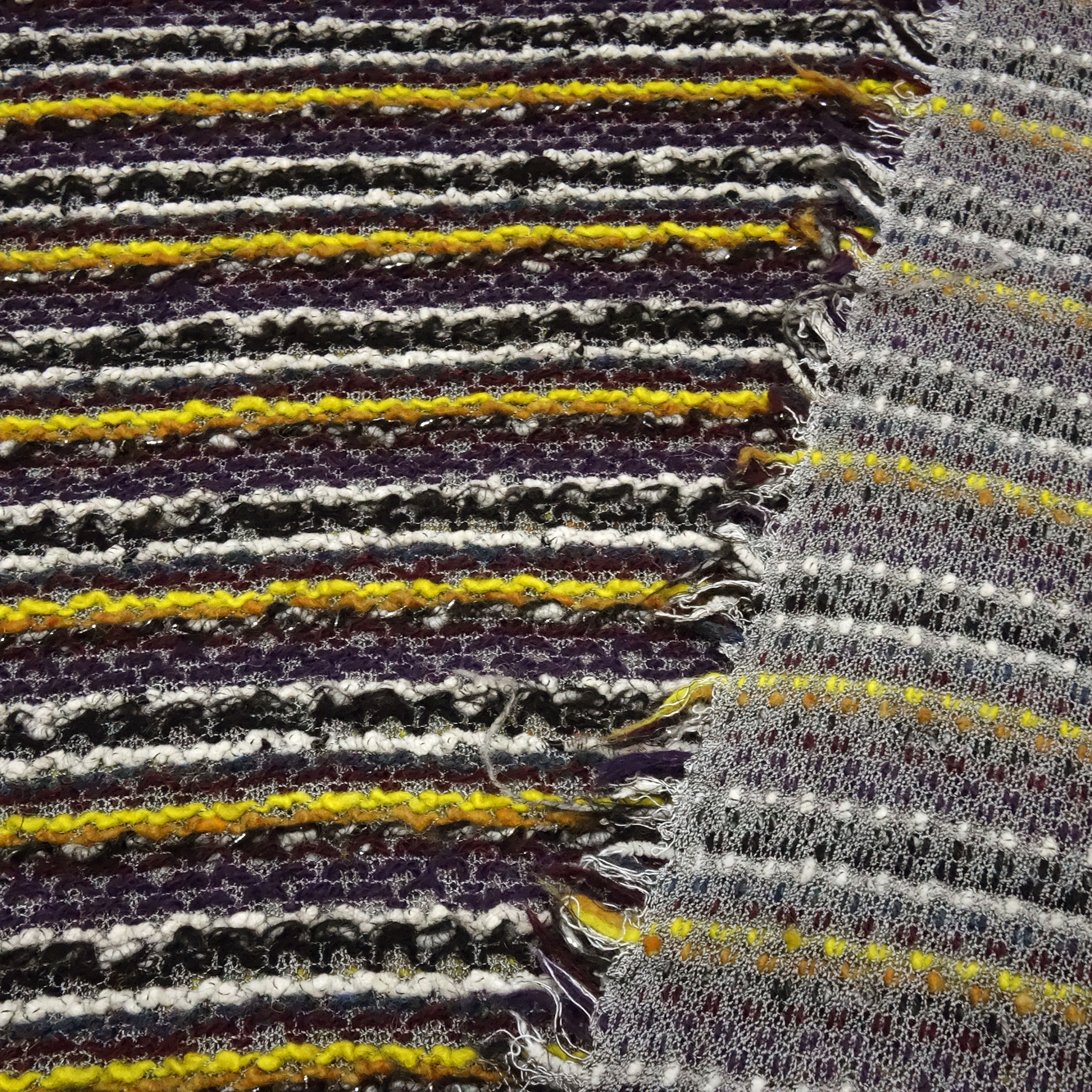 Stoff Strickstoff Grobstrick quer gestreift lila schwarz weiß gelb beige bordeaux silber Kleiderstoff
