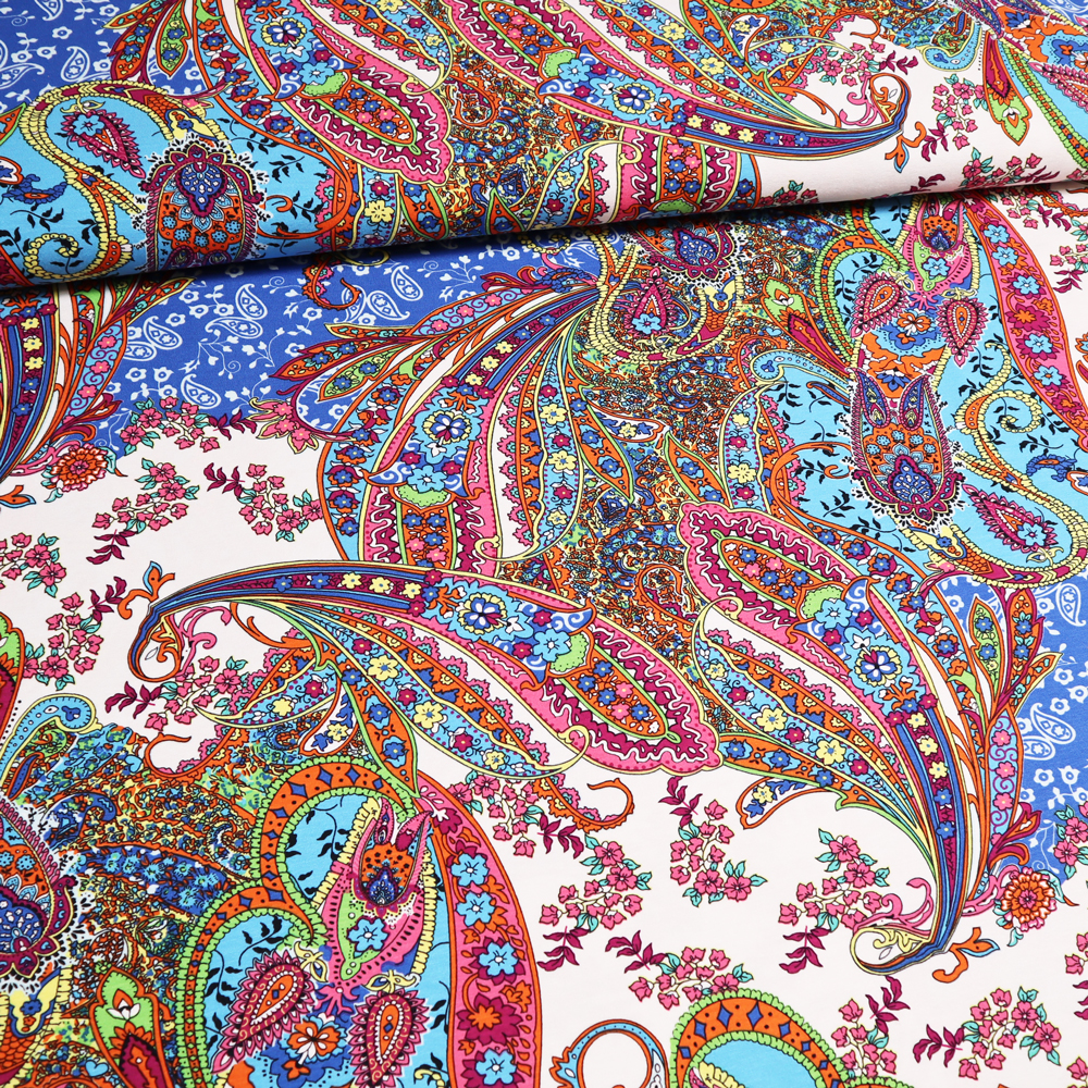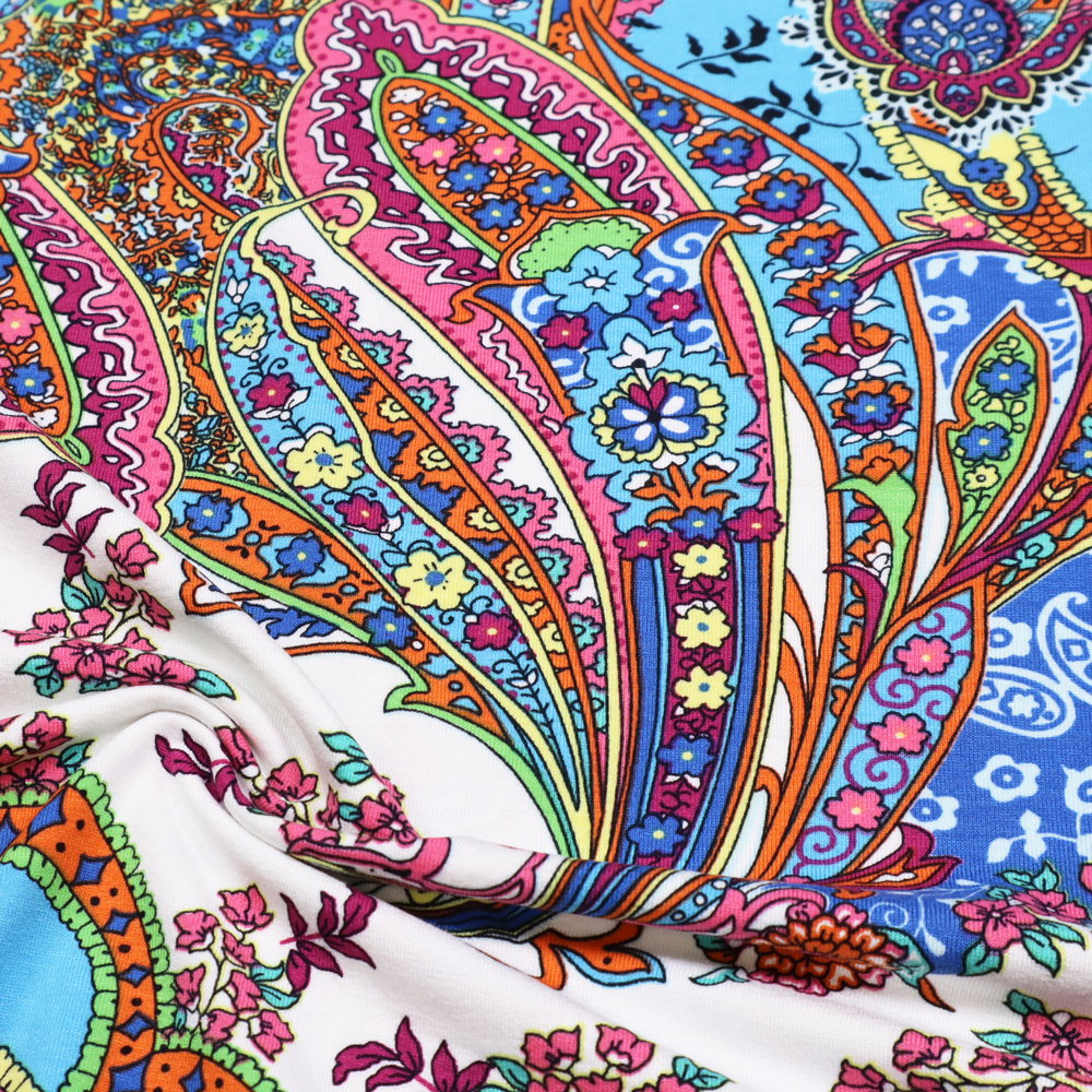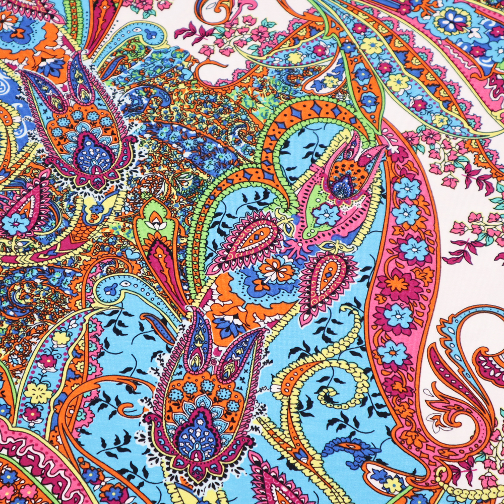 Stoff Viskose Jersey mit Paisley Design wollweiß grün rosa gelb orange blau bunt bedruckt Kleiderstoff Kinderstoff