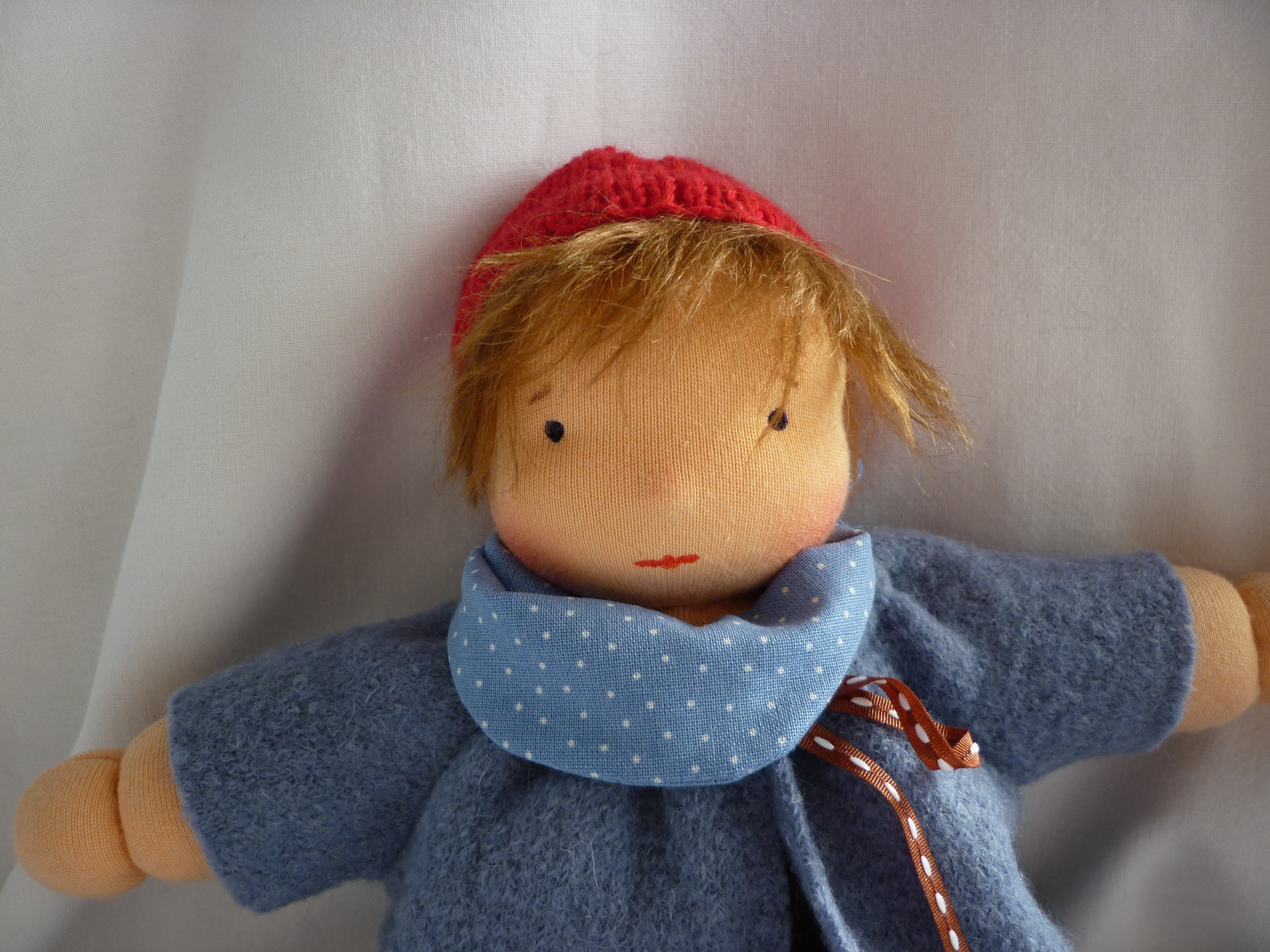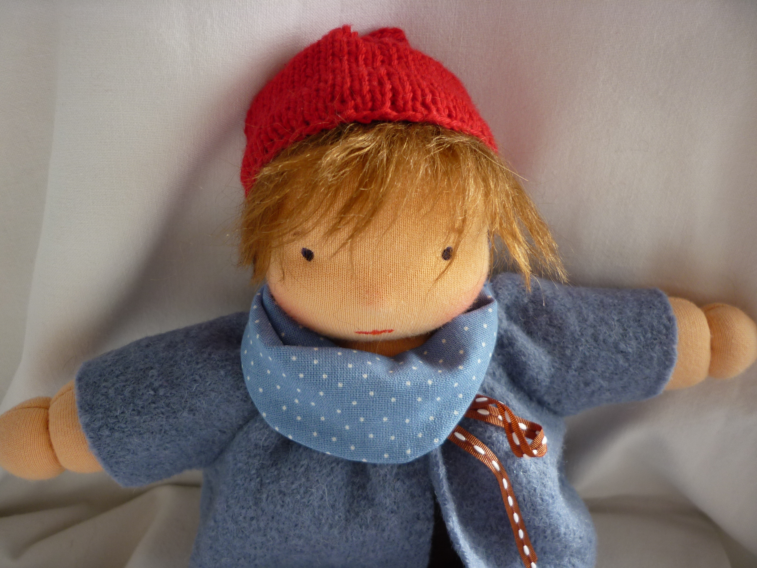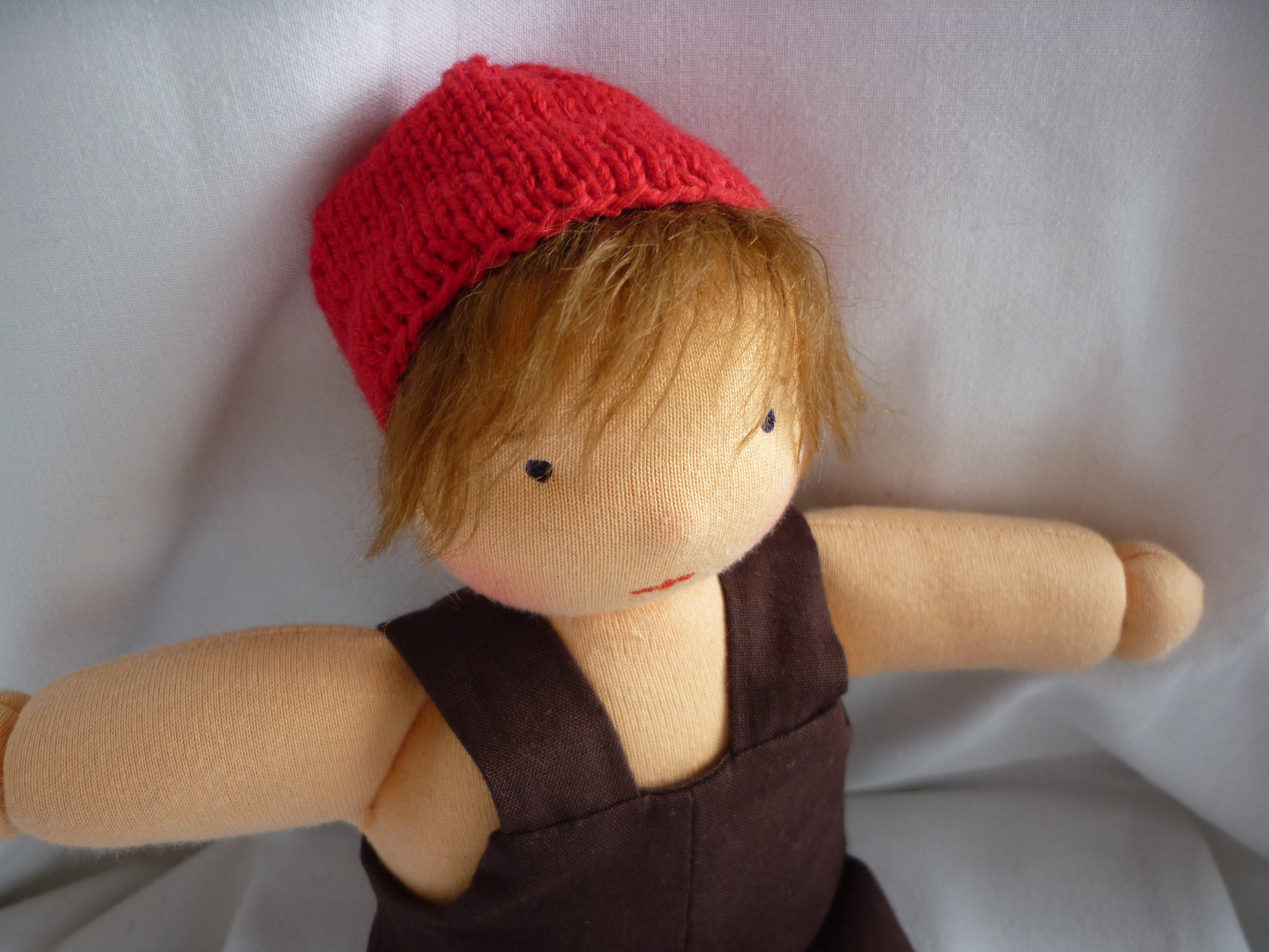 Aus hochwertigem Puppen-Trikot, mit Schafwolle gefüllt. Die Mütze ist aus Baumwollgarn gestrickt und fest an den Kopf angenäht. Die blauen Augen und der Mund sind mit wasserfester Stofffarbe gemalt. Für die Ponyhaare habe ich ein Stück Mohairvlies aufgenäht.