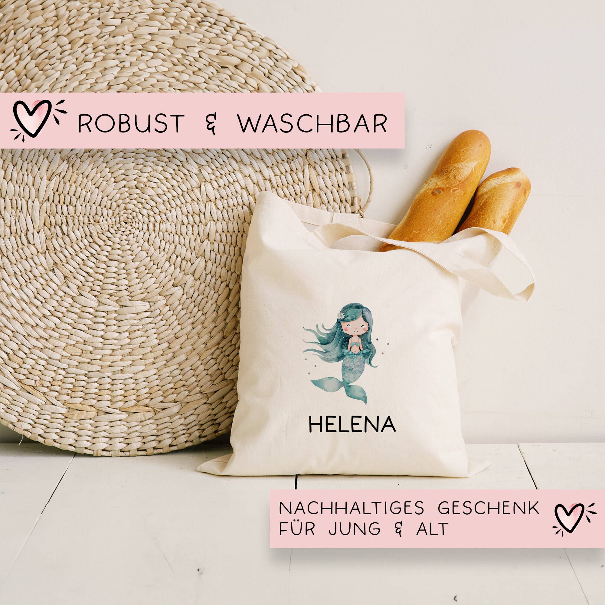 Eine Stofftasche mit einem süßen Meerjungfrau und dem Wunschnamen ist der perfekte Begleiter für Kinder in Kita, Schule und Kindergarten. Diese vielseitige Tasche kann als Sporttasche, Tragetasche oder für Wechselwäsche verwendet werden. Besonders praktisch ist der Kinder-Beutel mit Namen, der Verwechslungen vermeidet und die Tasche zu einem individuellen Lieblingsstück macht. Ob für den Sportunterricht, Ausflüge oder den täglichen Gebrauch – die Stofftasche ist stets dabei. Sie ist robust, geräumig und leicht zu tragen, wodurch sie sich ideal für kleine Abenteurer eignet. Mit diesem bunten und personalisierten Accessoire macht der Alltag gleich doppelt so viel Spaß!