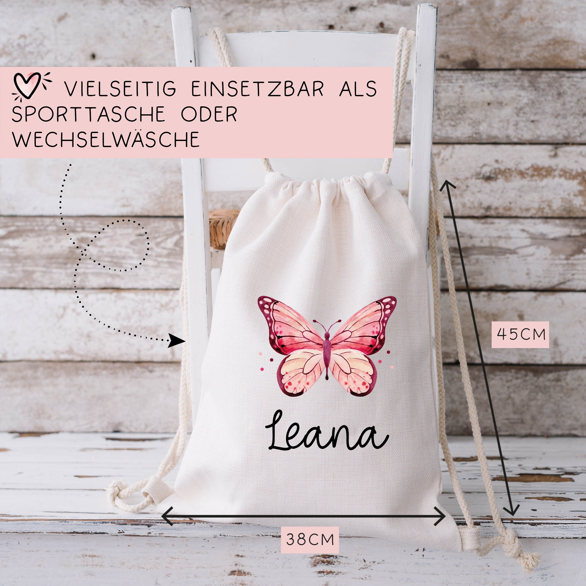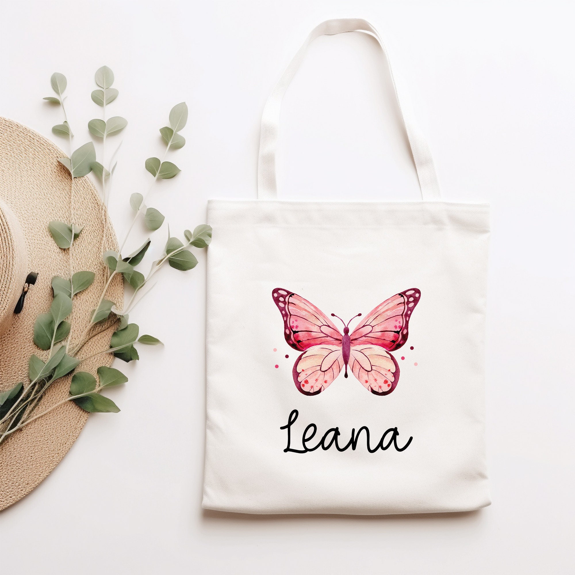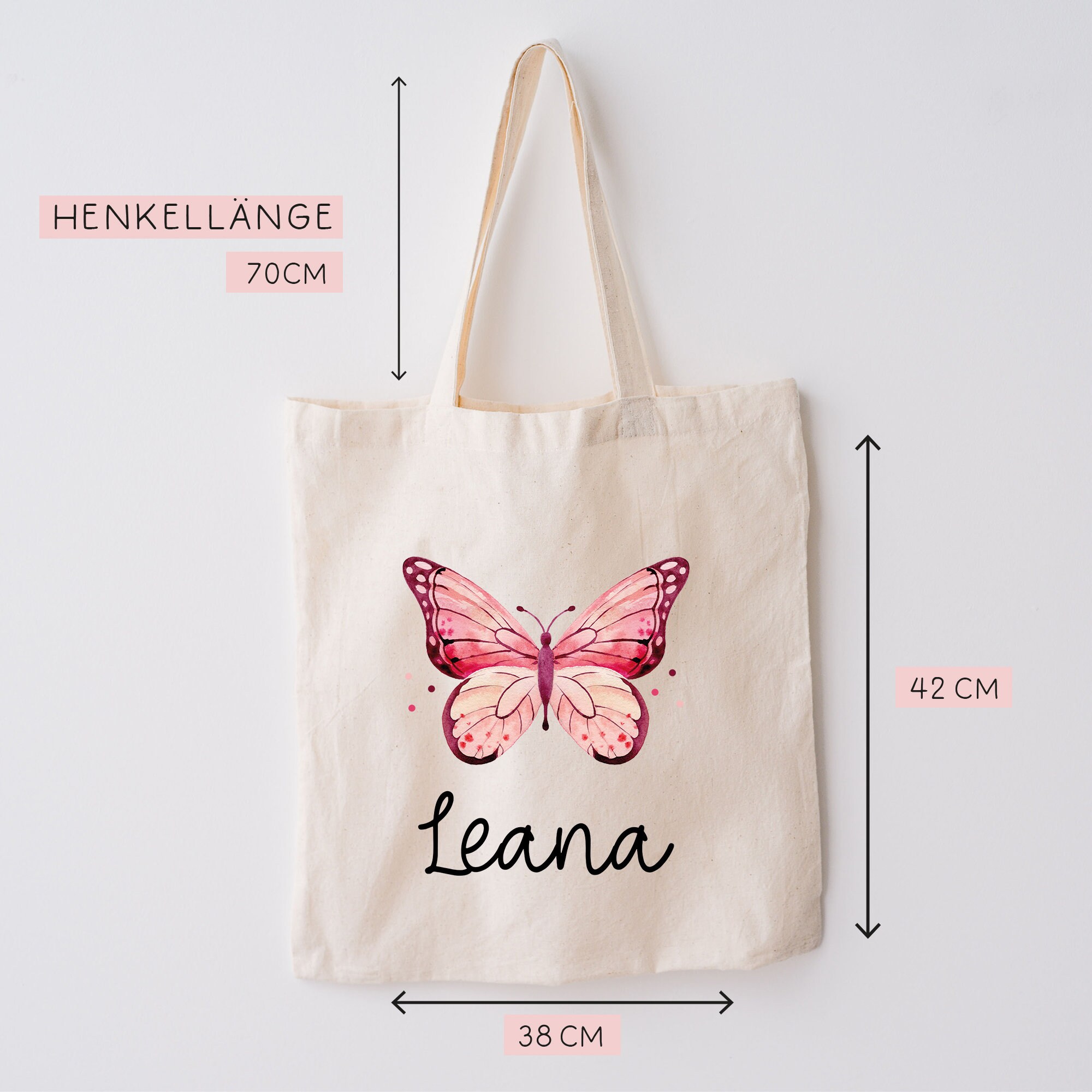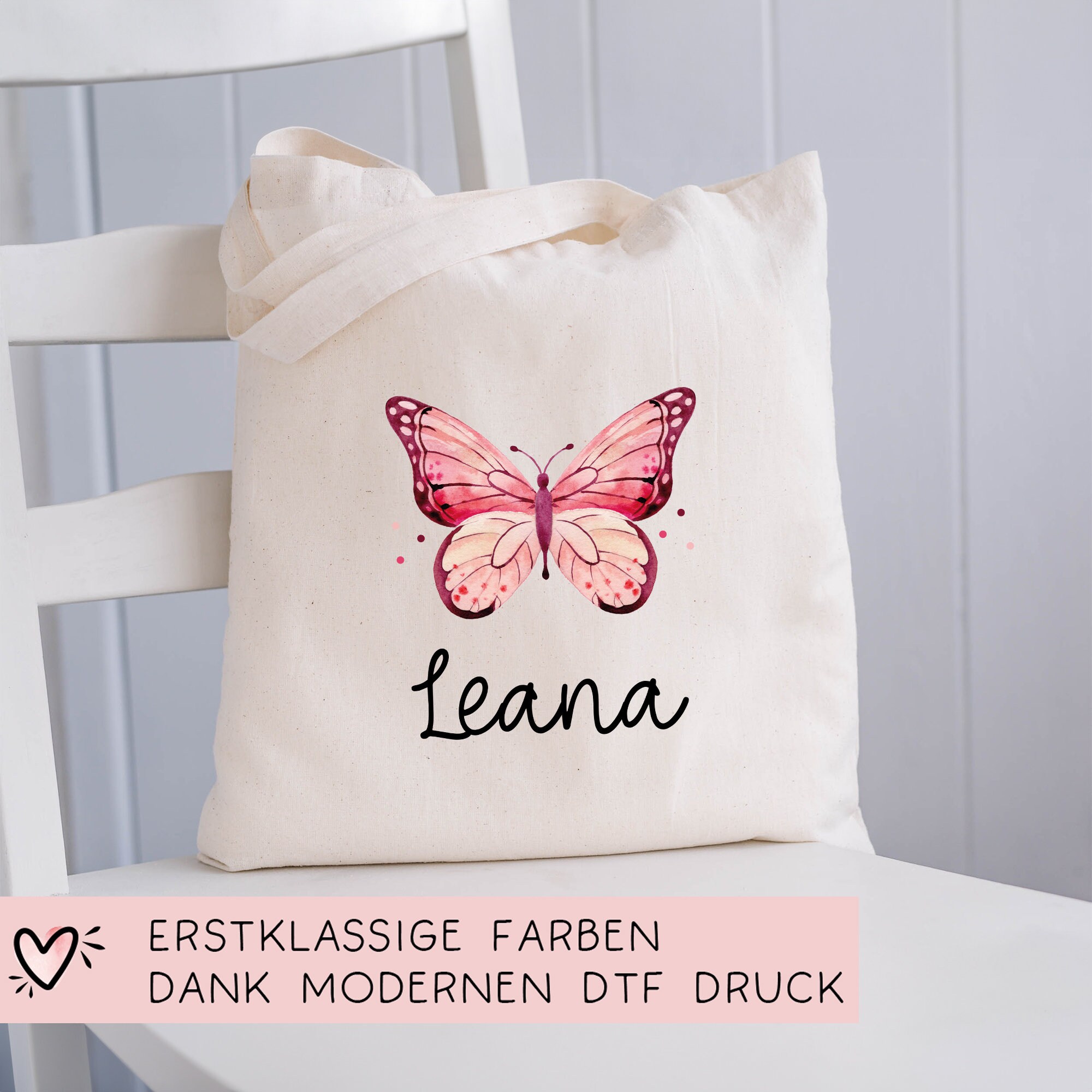 Der einseitig bedruckte und personalisierte Stoffbeutel für Kinder ist vielseitig einsetzbar, besteht aus robuster Bio-Baumwolle und ist ein treuer Begleiter für unsere Kleinen. Er ist mit einem einem Rosa Schmetterling oder Falter und dem Namen des Kindes bedruckt.