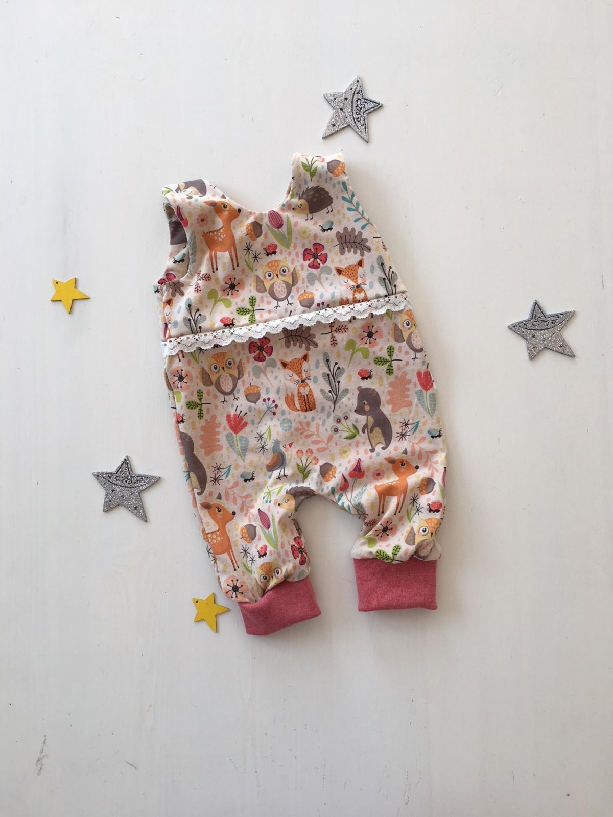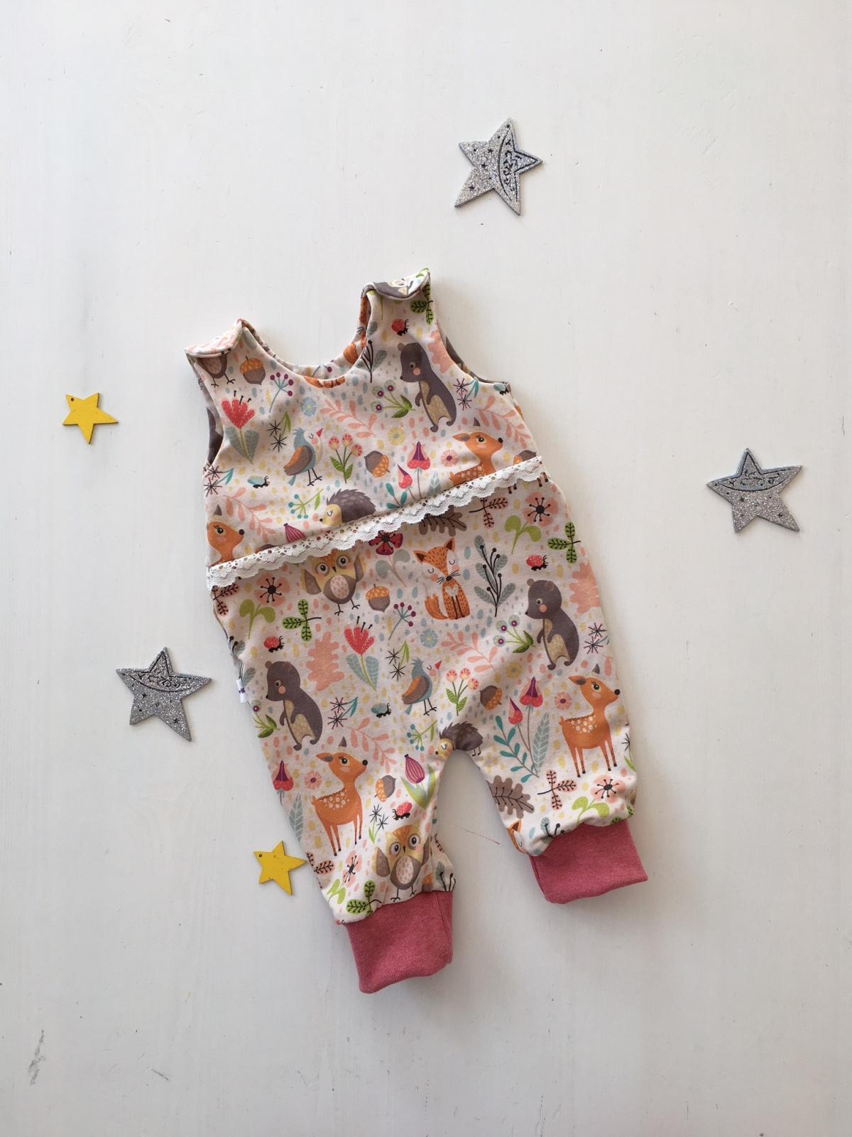 Dieser Strampler besteht um die Brust aus zwei Lagen Jerseystoff. Er ist mit einer Spitzenborte aufgehübscht und hat an den Füßen Bündchen.