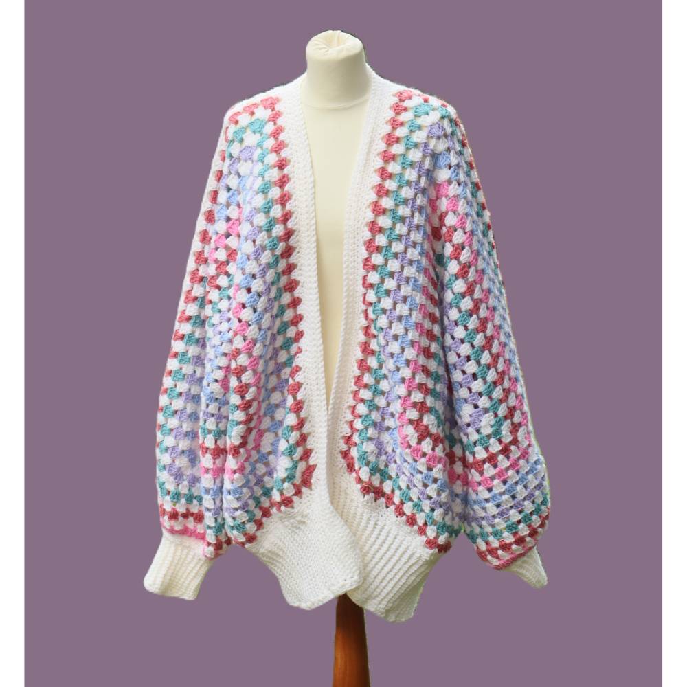 Toller Cardigan ,liebevoll von Hand gehäkelt in großer Größe . Die Jacke wurde aus weichem Acrylgarn gehäkelt in dezenten Tönen.
