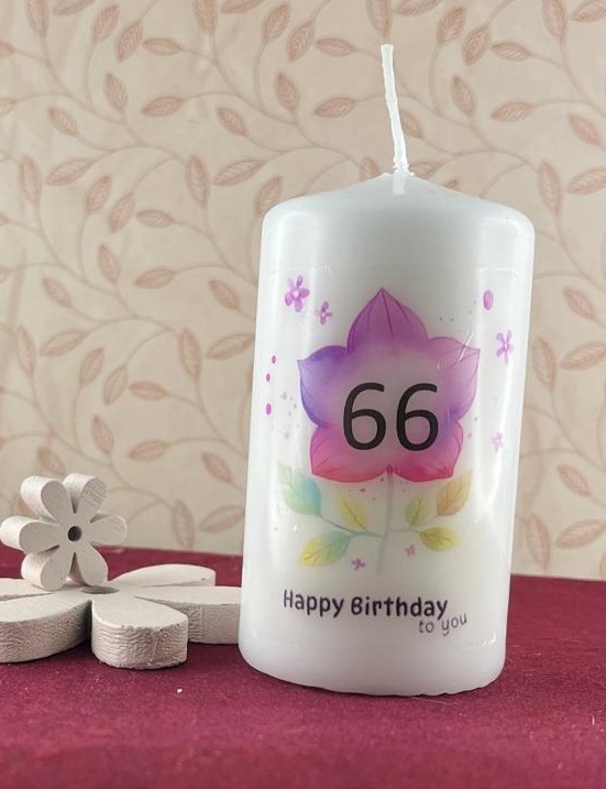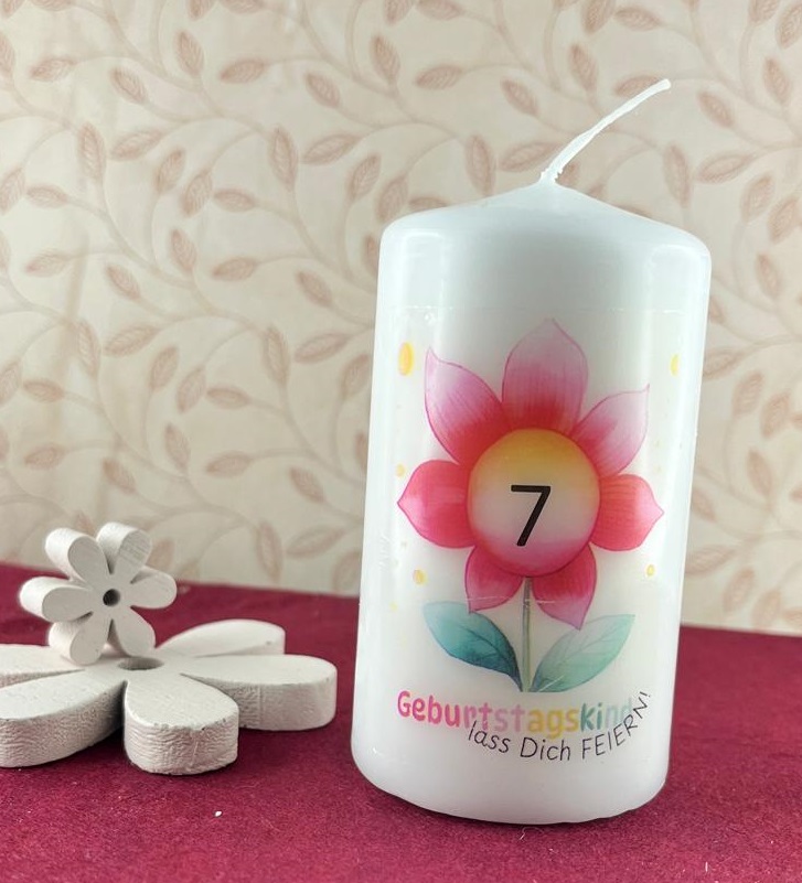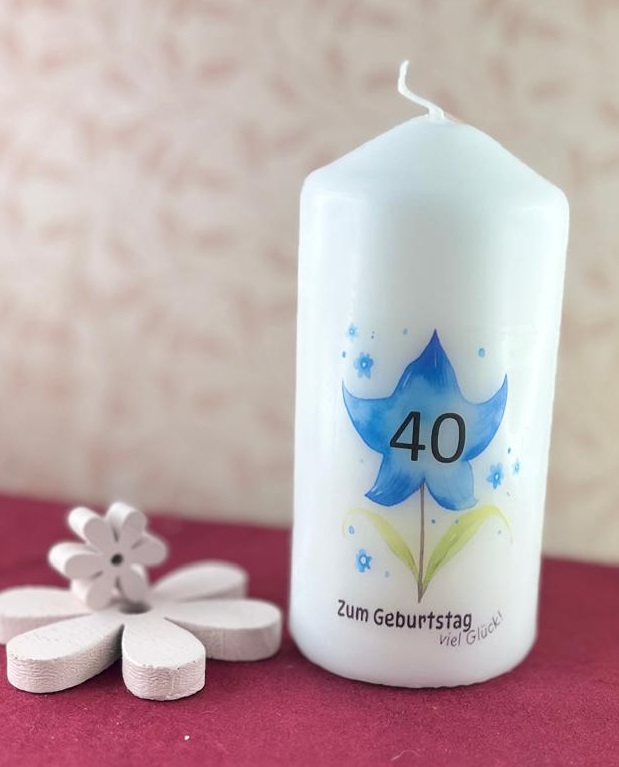 Einzigartige Stumpenkerzen mit feinen Blumenmotiven in vier Farben, bedruckt mit deiner individuellen Jahreszahl auf hochwertiger Wasserschiebefolie.