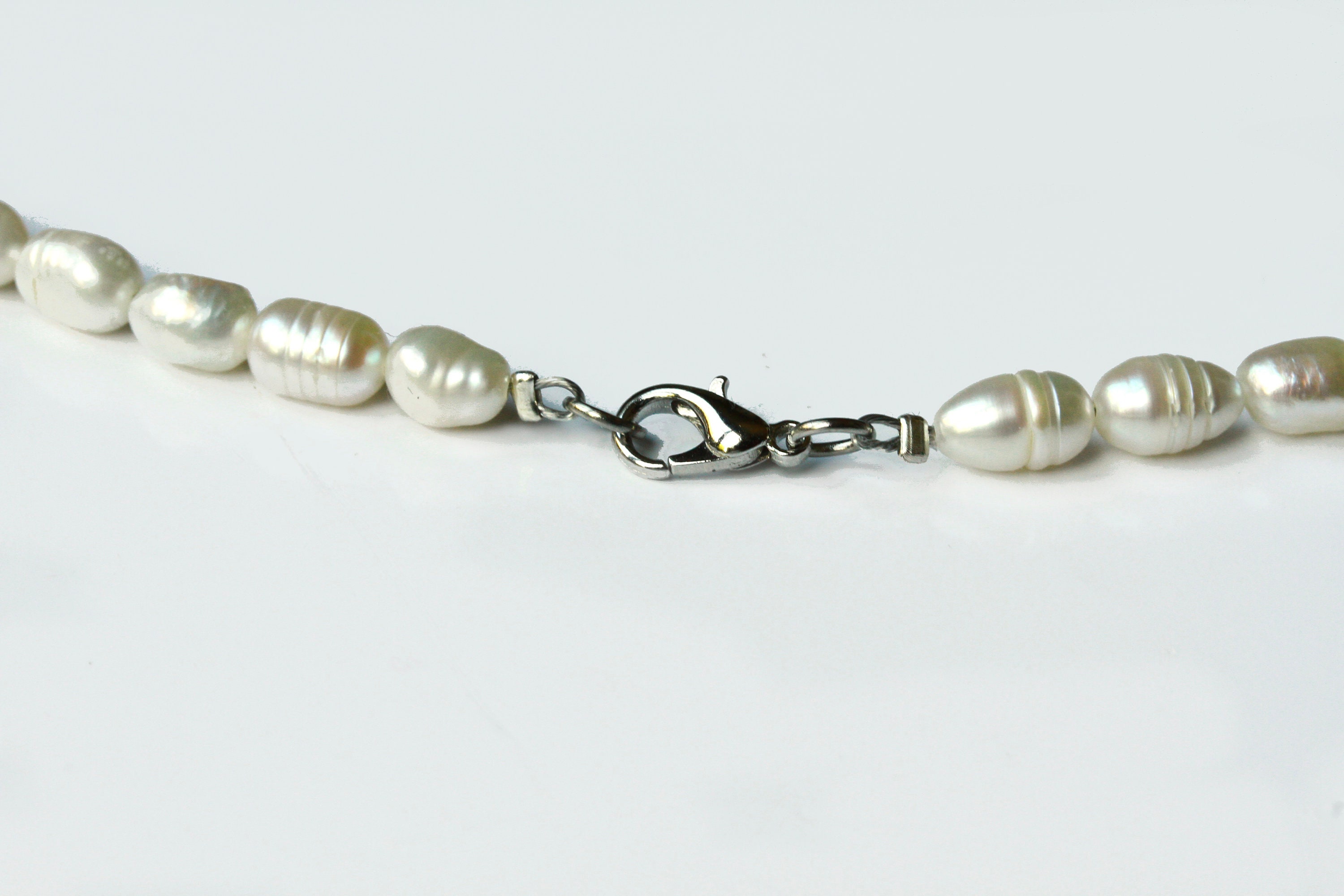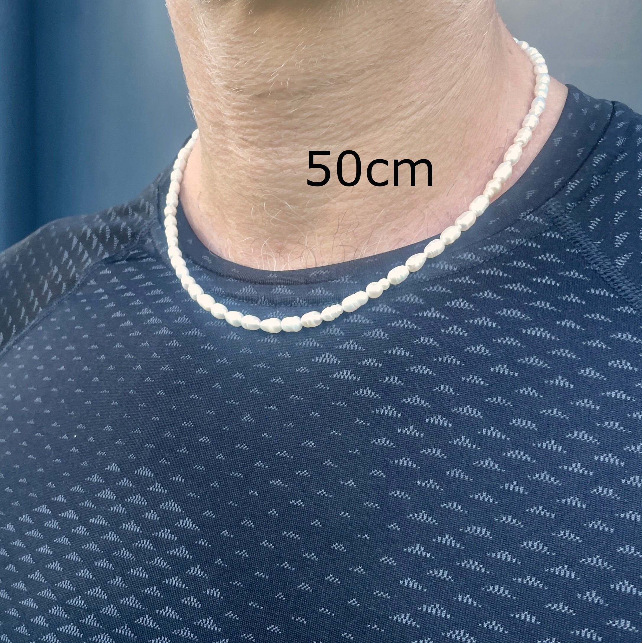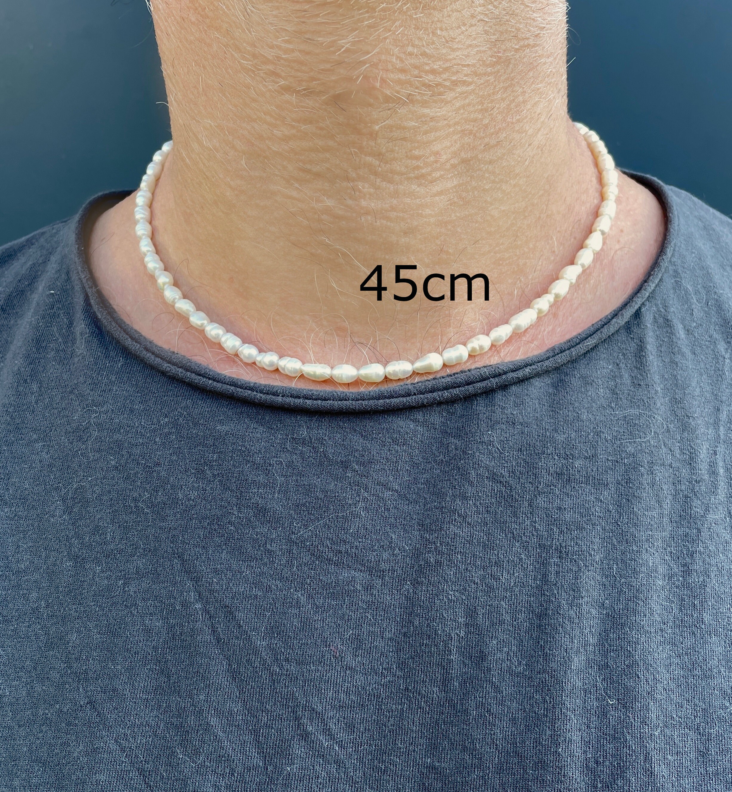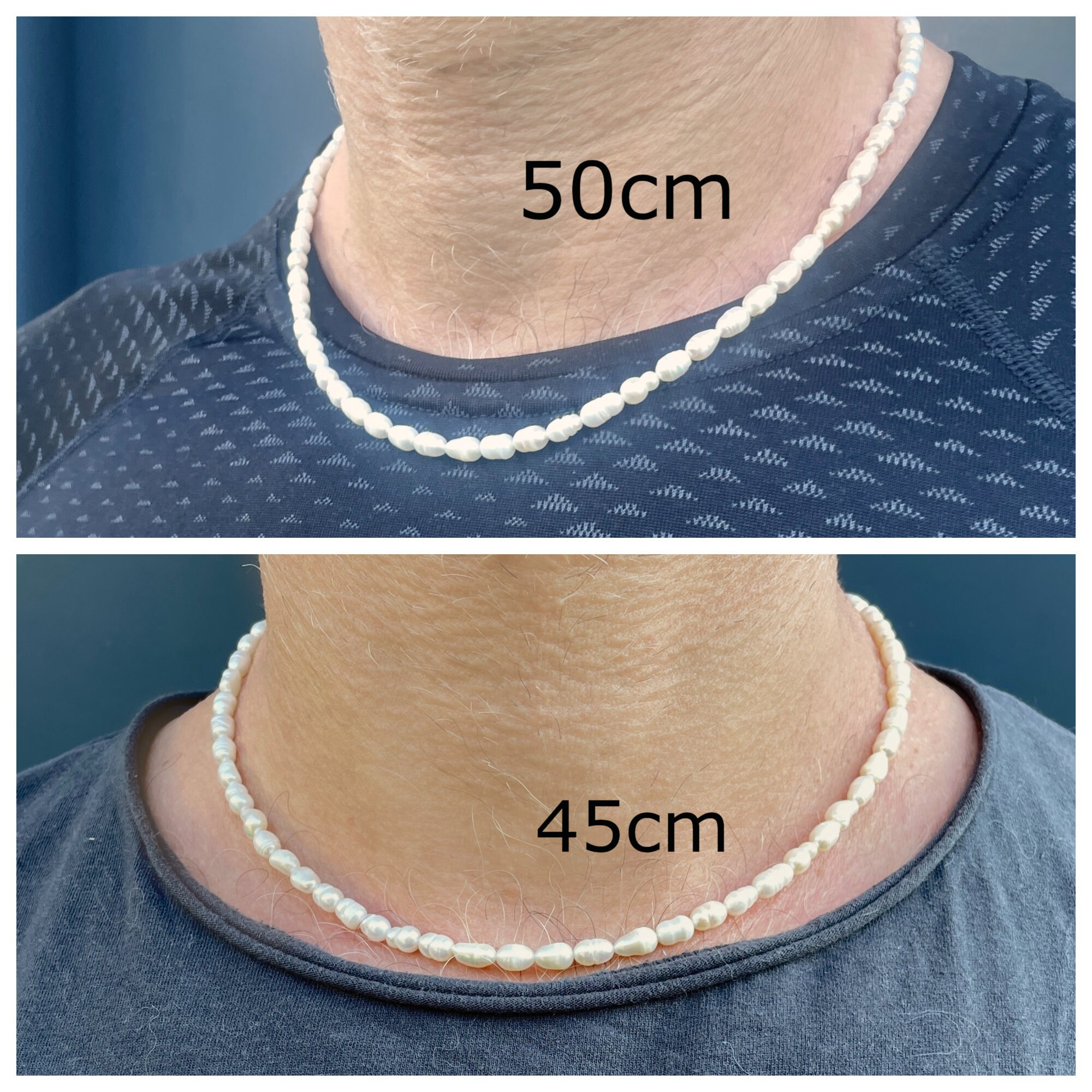 Süßwasserperlen Halskette unisex - Elegante Naturperlenkette in zwei Längen mit Edelstahlkarabinerverschluss Momentan trägt sie jeder moderne Mann, Frauen sowieso: die Perlenkette. Hier als perfektes Geschenk mit naturbelassenen echten Süßwasserperlen und einem robusten Verschluss aus massiven Edelstahl. Die Luxusvariante der einfachen Perlenkette. Sie passt perfekt zu jedem Outfit, sei es formell oder leger. Ein vielseitiges Schmuckstück, das sowohl moderne Männer als auch Frauen begeistert. Es stehen zwei Längen zur Auswahl. Einmal ca 45 lang und als Choker zu tragen oder mit a 50 cm Länge als kurze Halskette. Durch die großen Perlen von 0,5cm breite und bis zu 1cm Länge wirkt die Kette nicht zu zierlich. Unsere Süßwasserperlen-Halskette ist mit einem hochwertigen Edelstahlkarabinerverschluss ausgestattet, der nicht nur sicher, sondern auch robust und wasserfest ist. Zudem sagt man Edelstahl nach, dass er hypoallergen ist. So können Sie sich den ganzen Tag über an Ihrem Schmuck erfreuen, ohne sich Sorgen um Verlust oder Beschädigung machen zu müssen. Unisex-Design: Dieses Schmuckstück wurde mit einem zeitlosen und modernen Design konzipiert. Es ist das perfekte Geschenk für Männer und Frauen gleichermaßen, und es lässt sich mühelos zu verschiedenen Anlässen tragen. Natürliche Schönheit: Es handelt sich um ein Naturprodukt. Jede Perle ist ein Unikat, und sie verleihen Ihrem Look eine besondere Note.