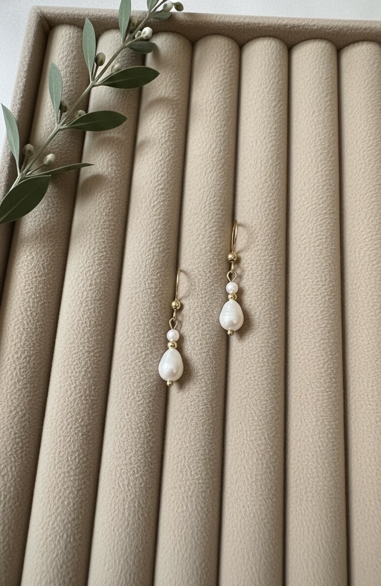 Material: Süßwasserperlen AA (kleine Perle ca. 3–4 mm, Tropfen/Barock ca. 8–11 mm), Abstandskugeln vergoldet, Haken aus Edelstahl (goldfarben, nickelfrei).