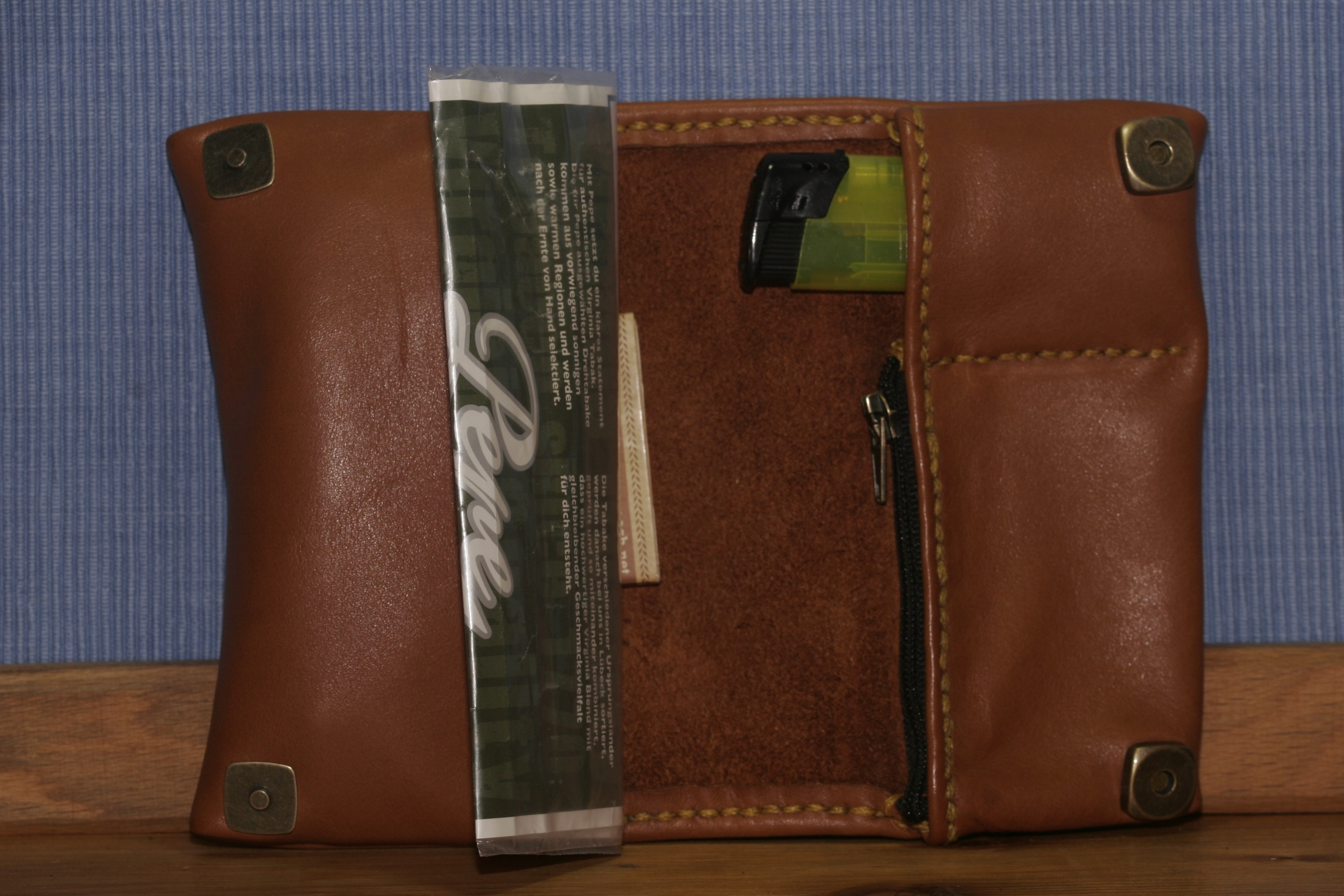 Ein Handgenähtes Leder-Etui zum verstauen von Rauchutensilien für Selbstdreher.