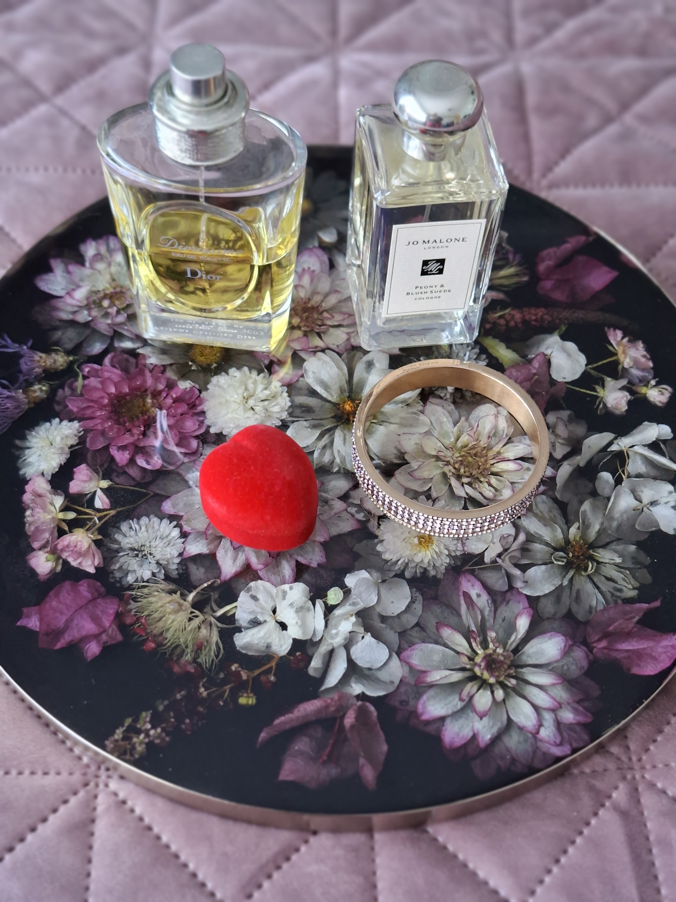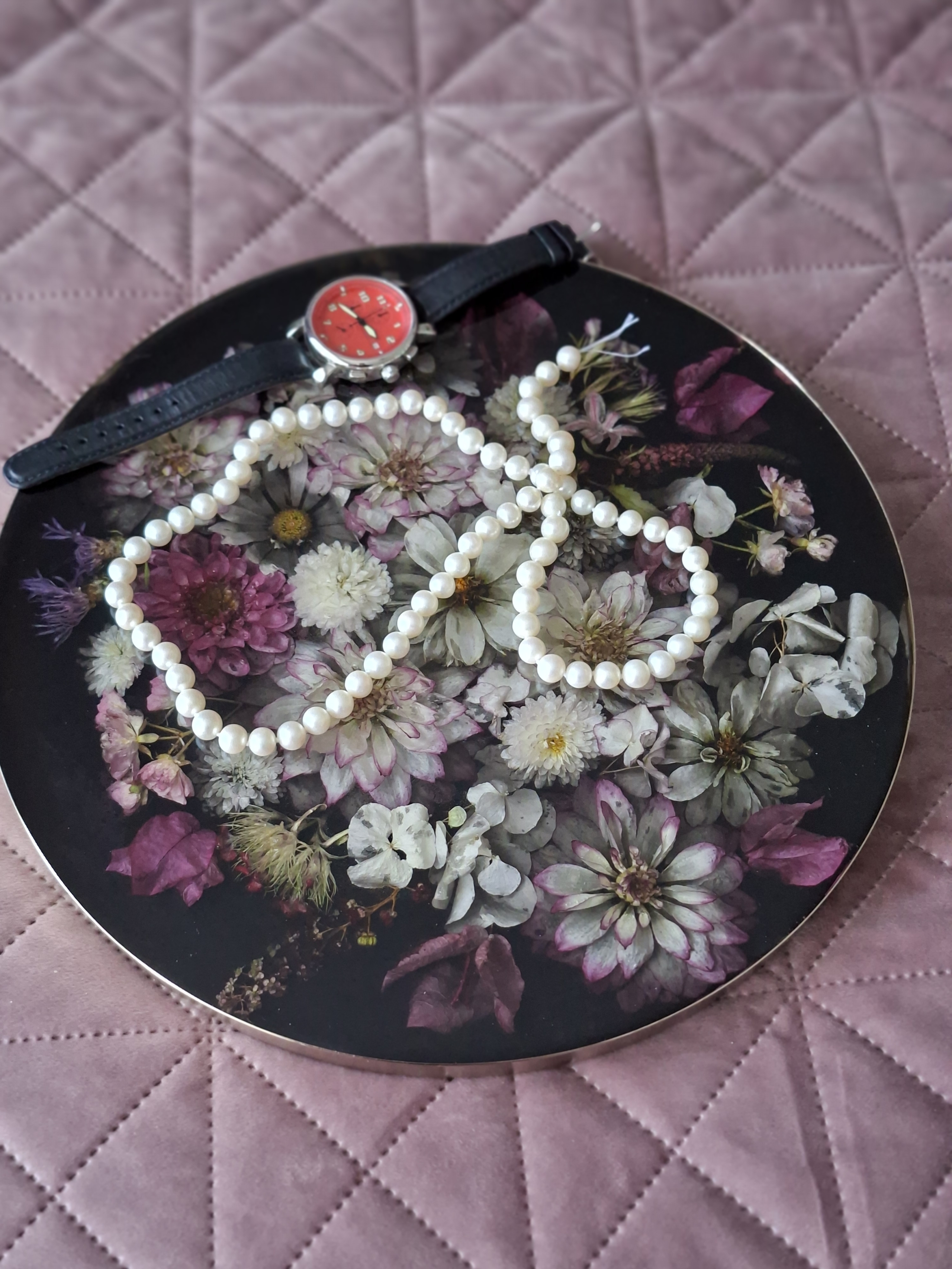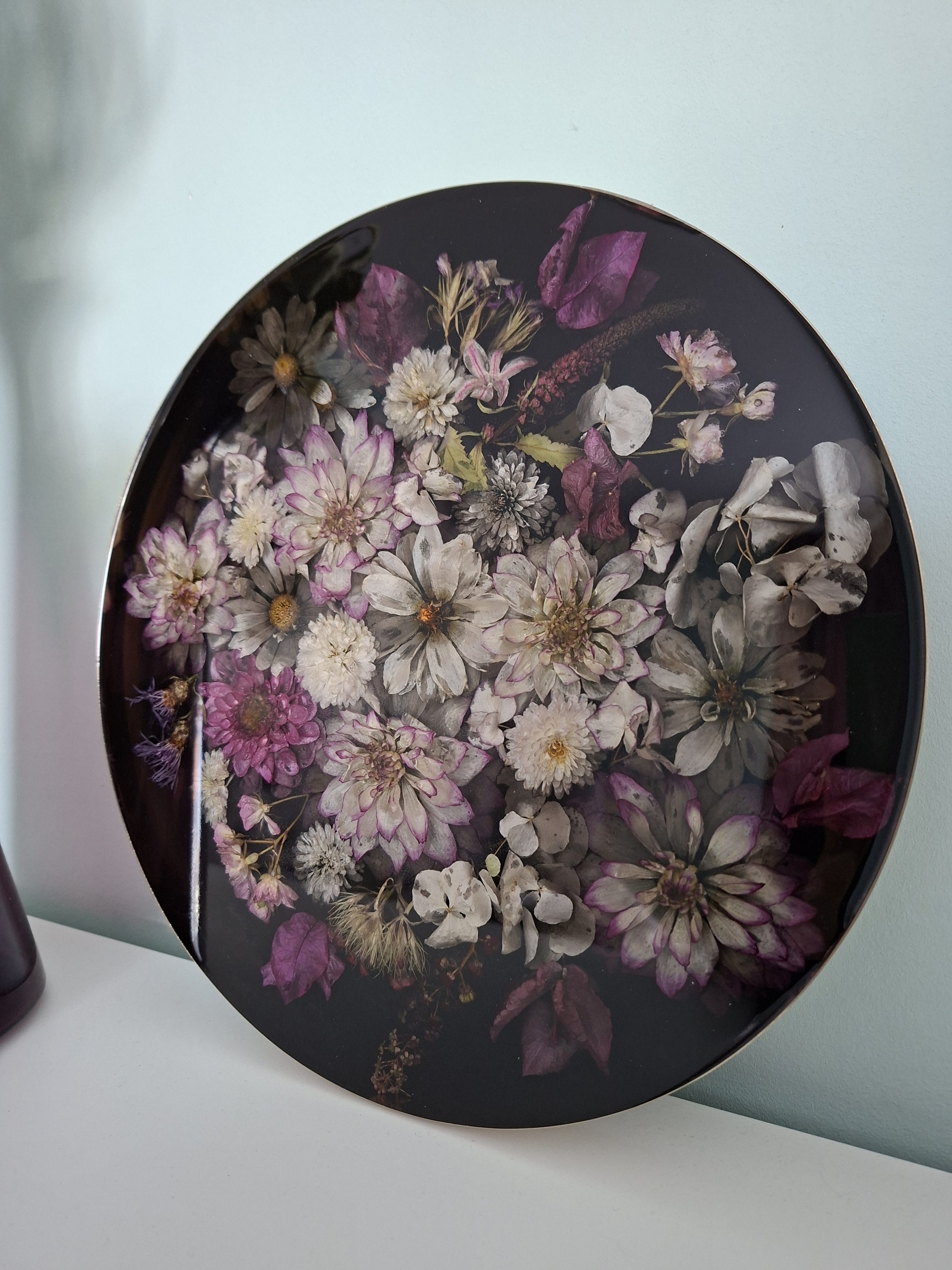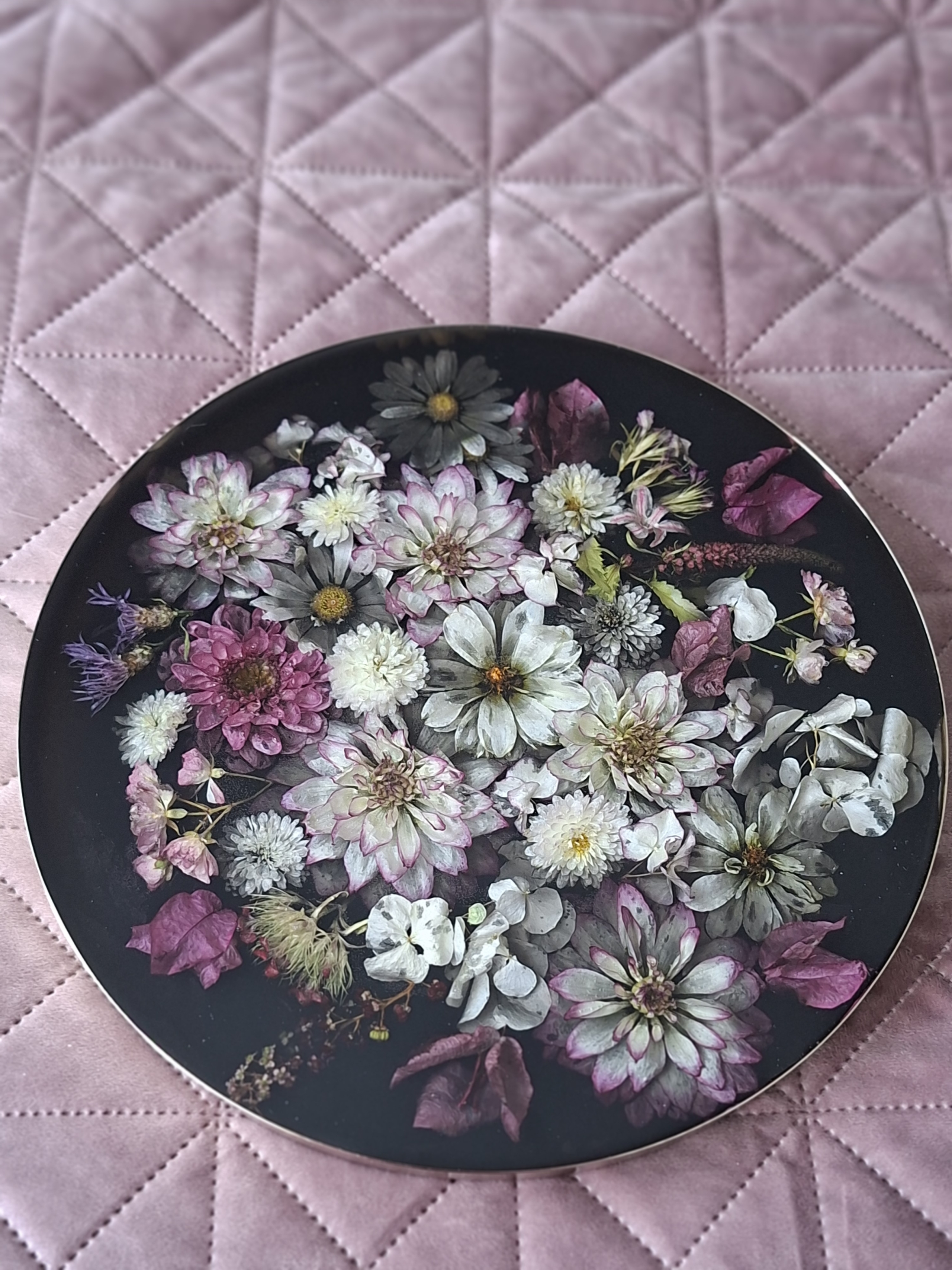 Goldener Tablett mit echten getrockneten Blumen in Epoxidharz