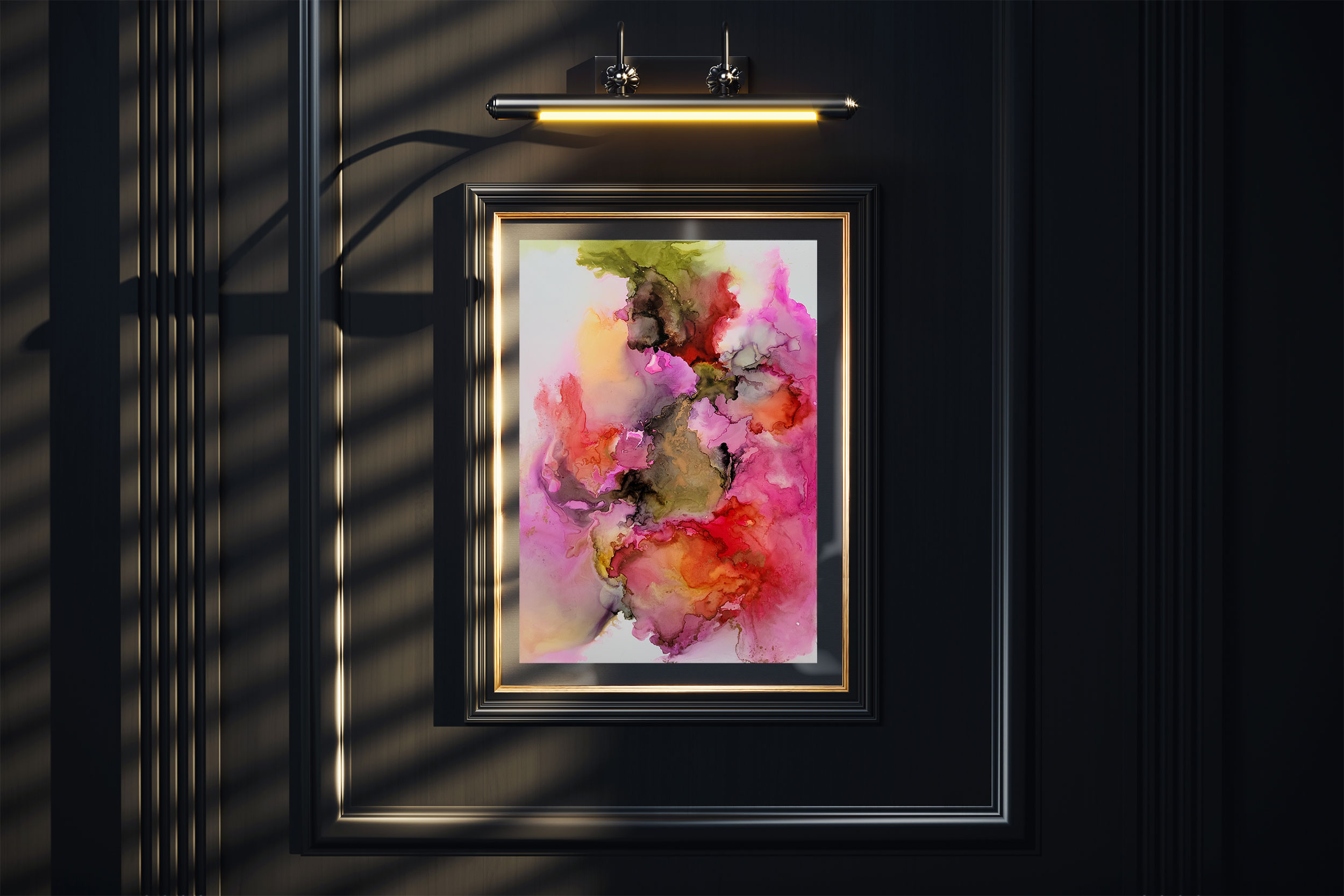 Das Kunstwerk ist UV-versiegelt und somit optimal geschützt. Mit einem passenden DIN-A3-Rahmen lässt es sich sofort stilvoll an Ihrer Wand präsentieren.