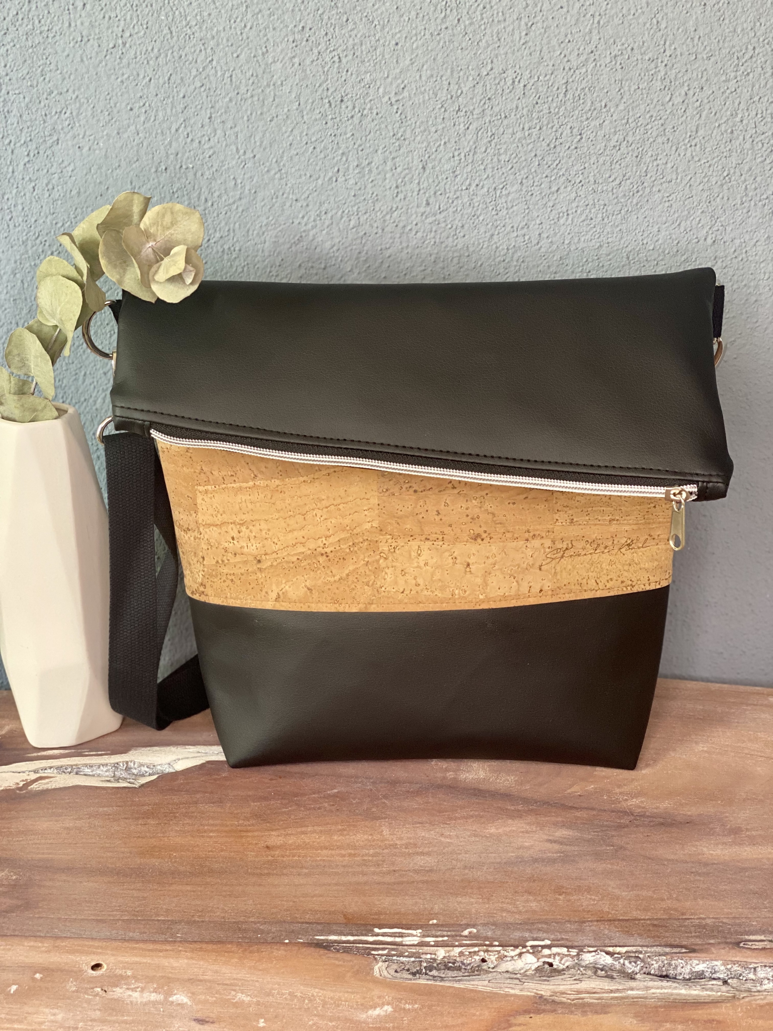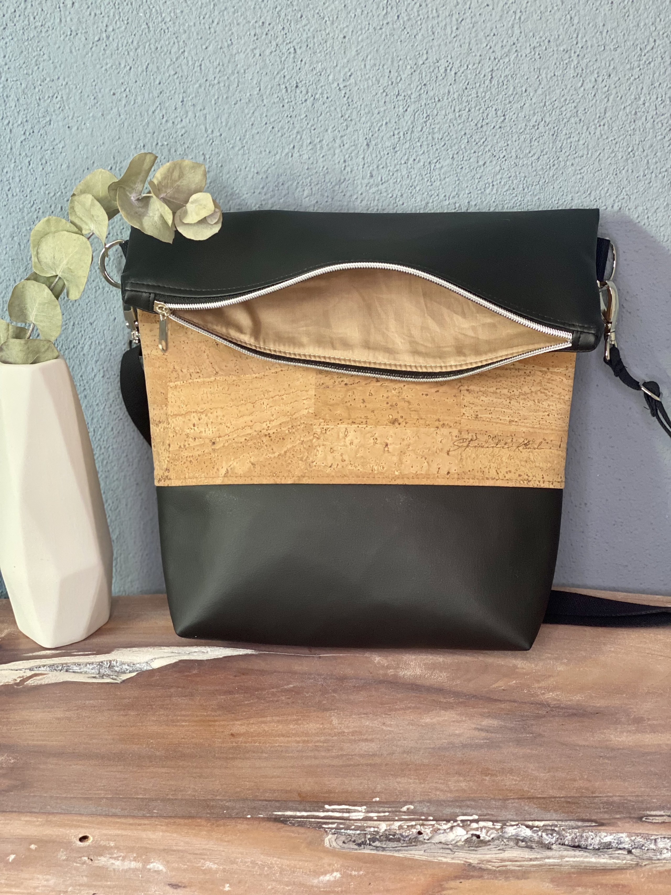 - Kunstleder schwarz, Kork Natur, Reißverschluss silber, Tascheninnenfutter beige, Reißverschlussfach aussen, Steckfach innen, Baumwollgurtband schwarz, 2,5cm breit, ca 145cm lang, Taschenzubehör silber, gefertigt nach Schnitt "FoldOver" von Hansedelli, Lizenznummer 9912-2018-FO