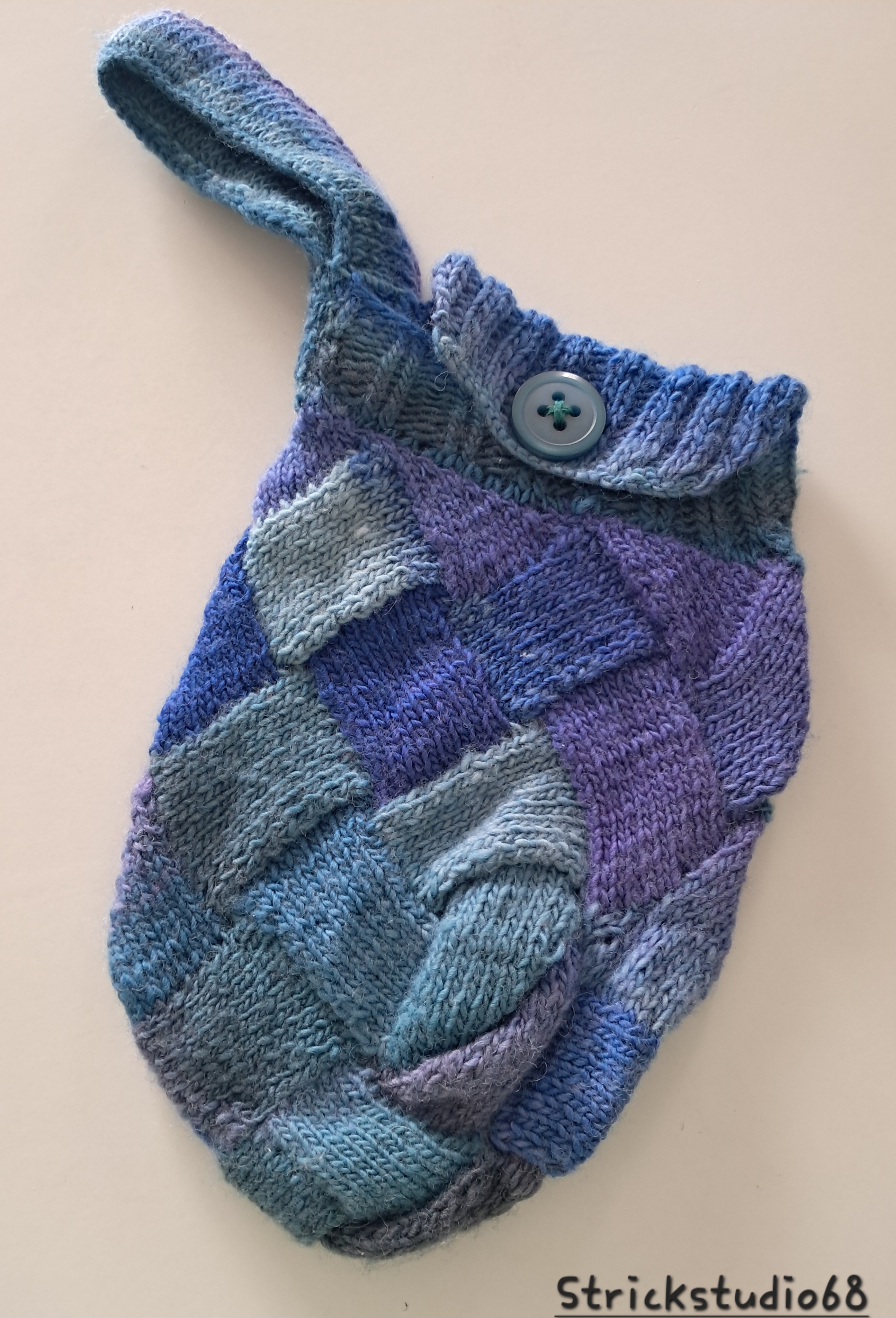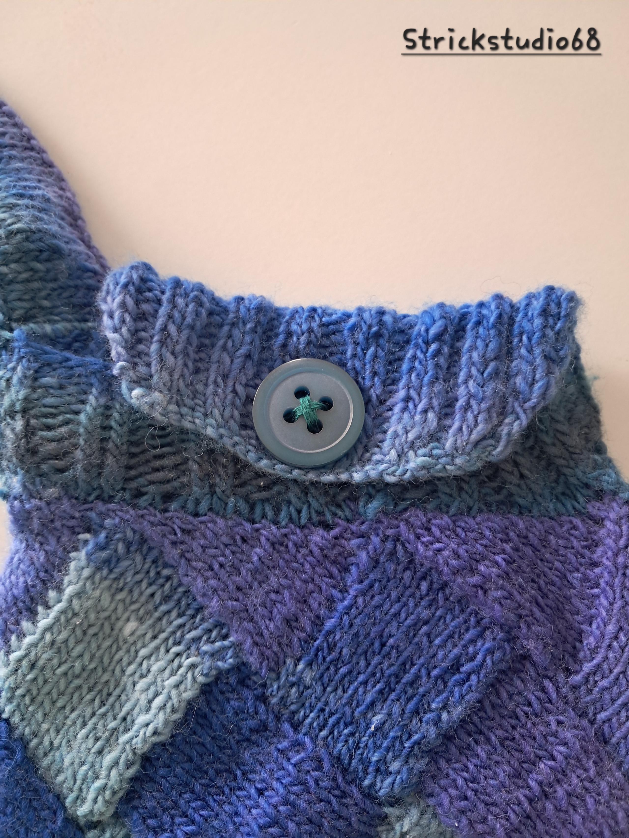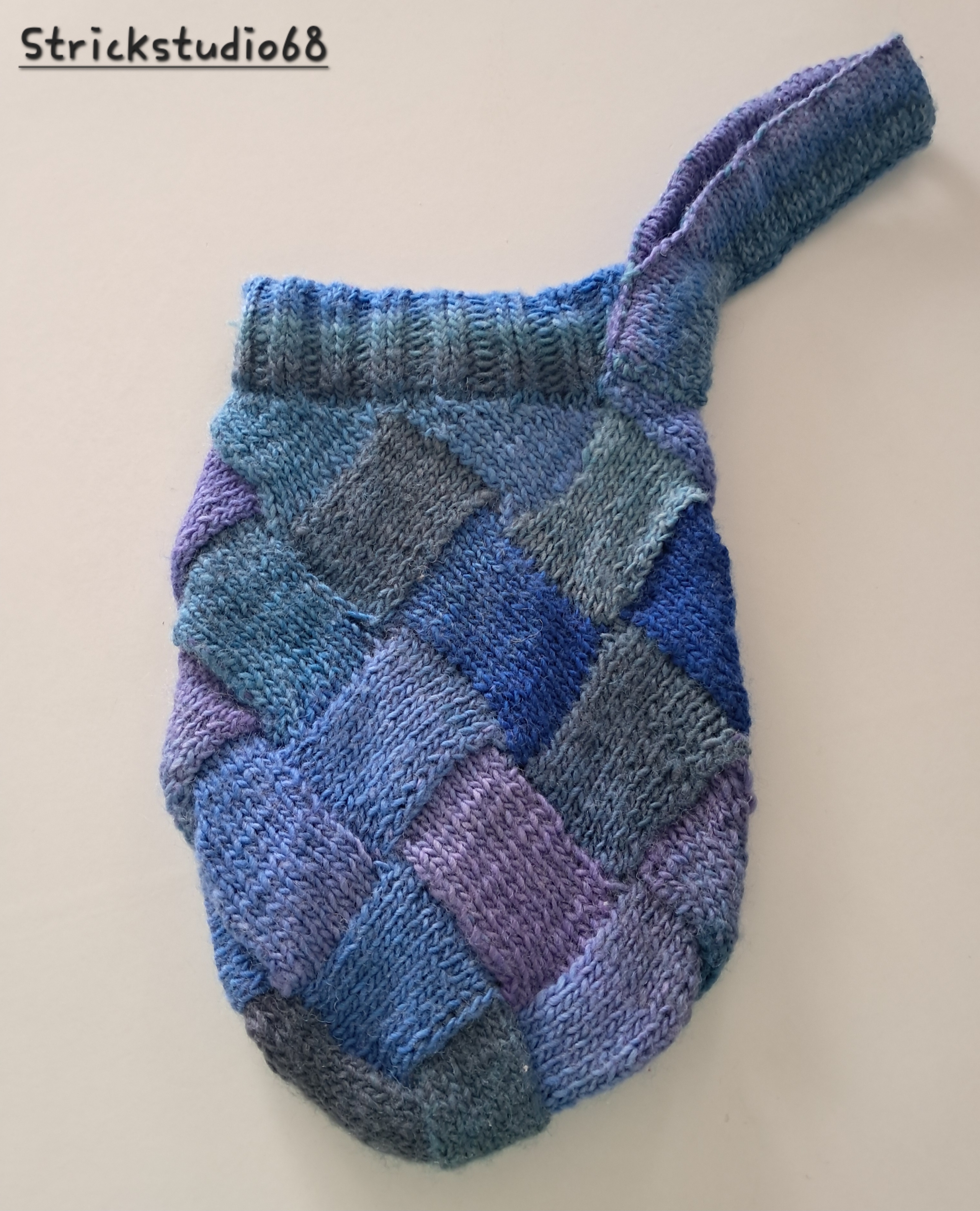 Gestrickt ist die Tasche in einem Farbverlaufsgarn der blauen Farbgruppe.