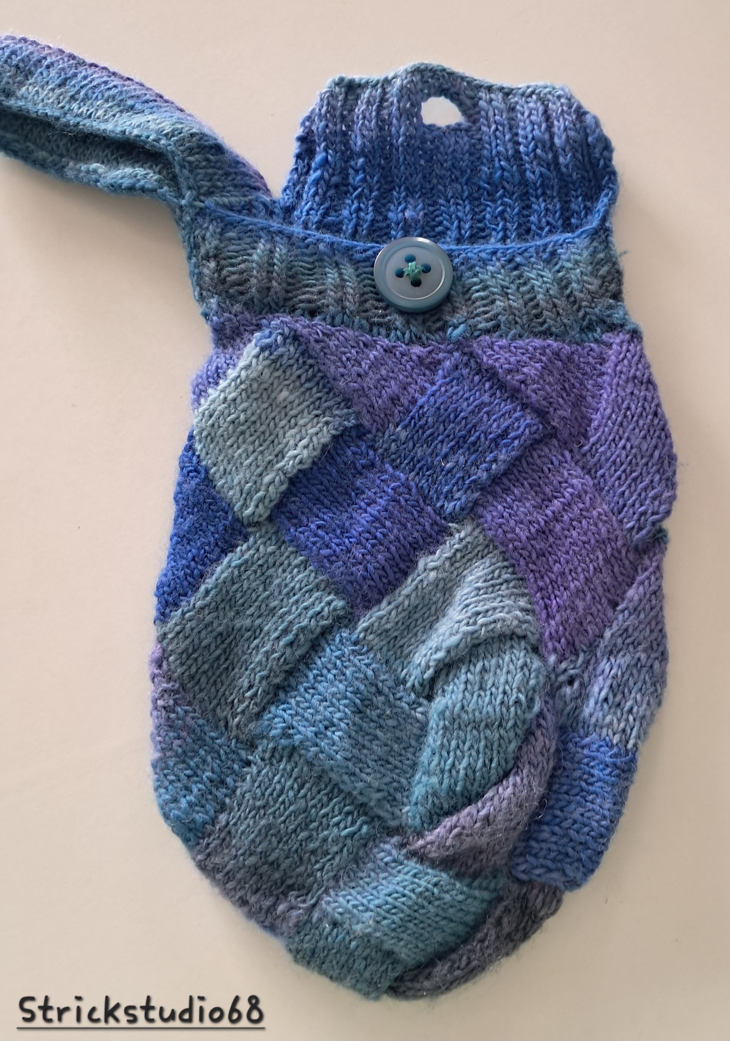 Die Tasche ist in der Entrelac-Technik gestrickt. Sie hat einen Knopf und eine Schlaufe zum tragen.