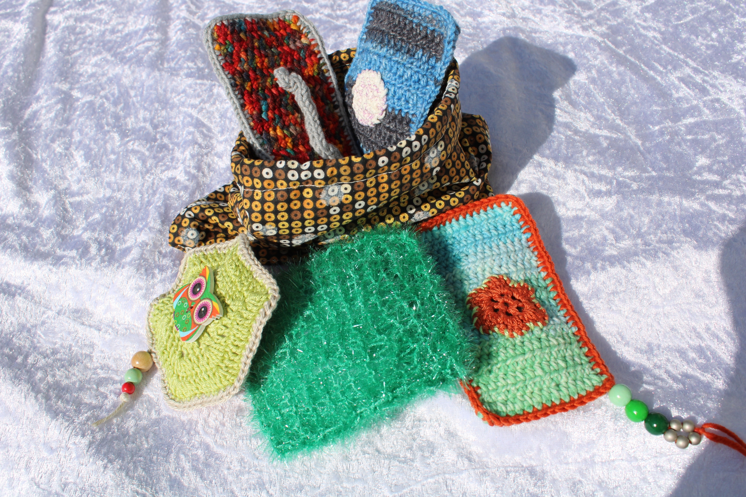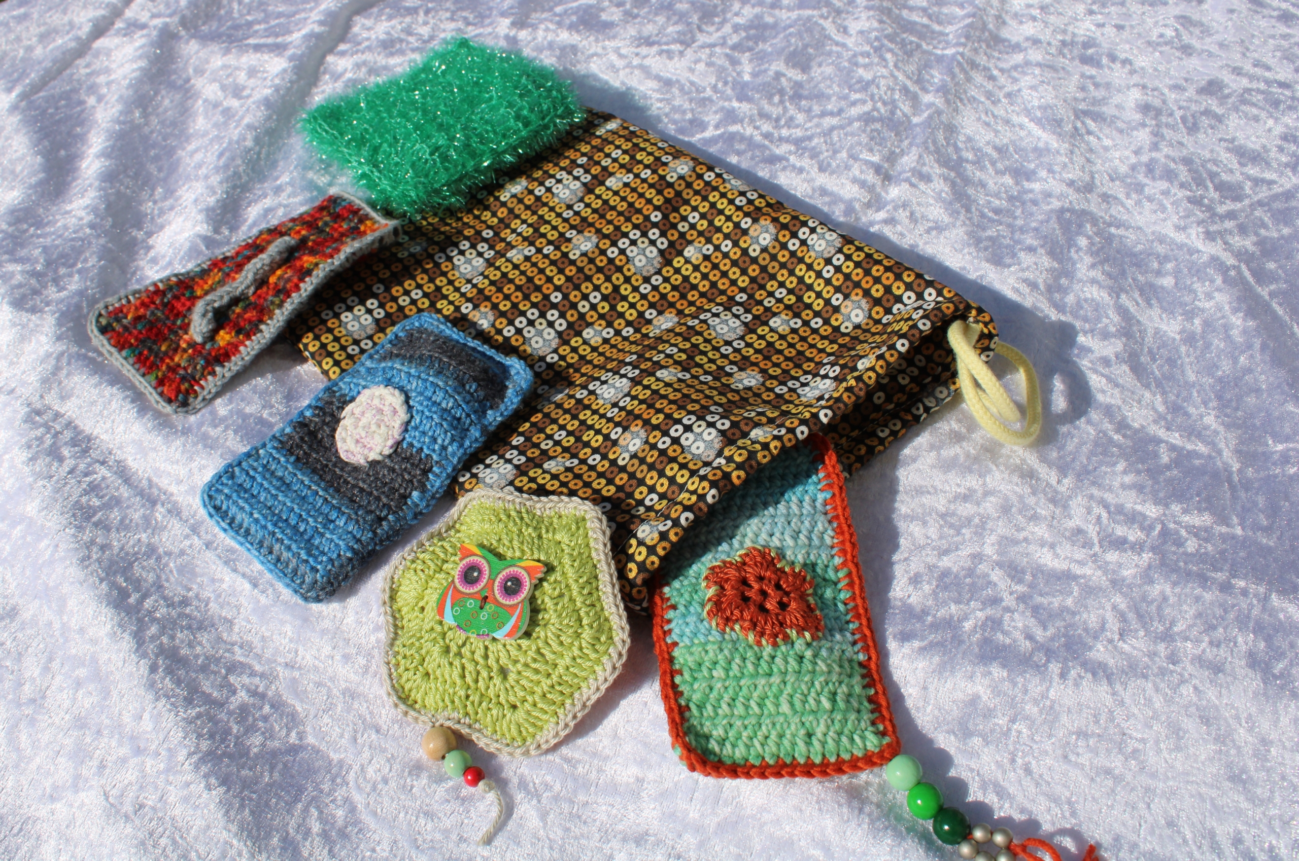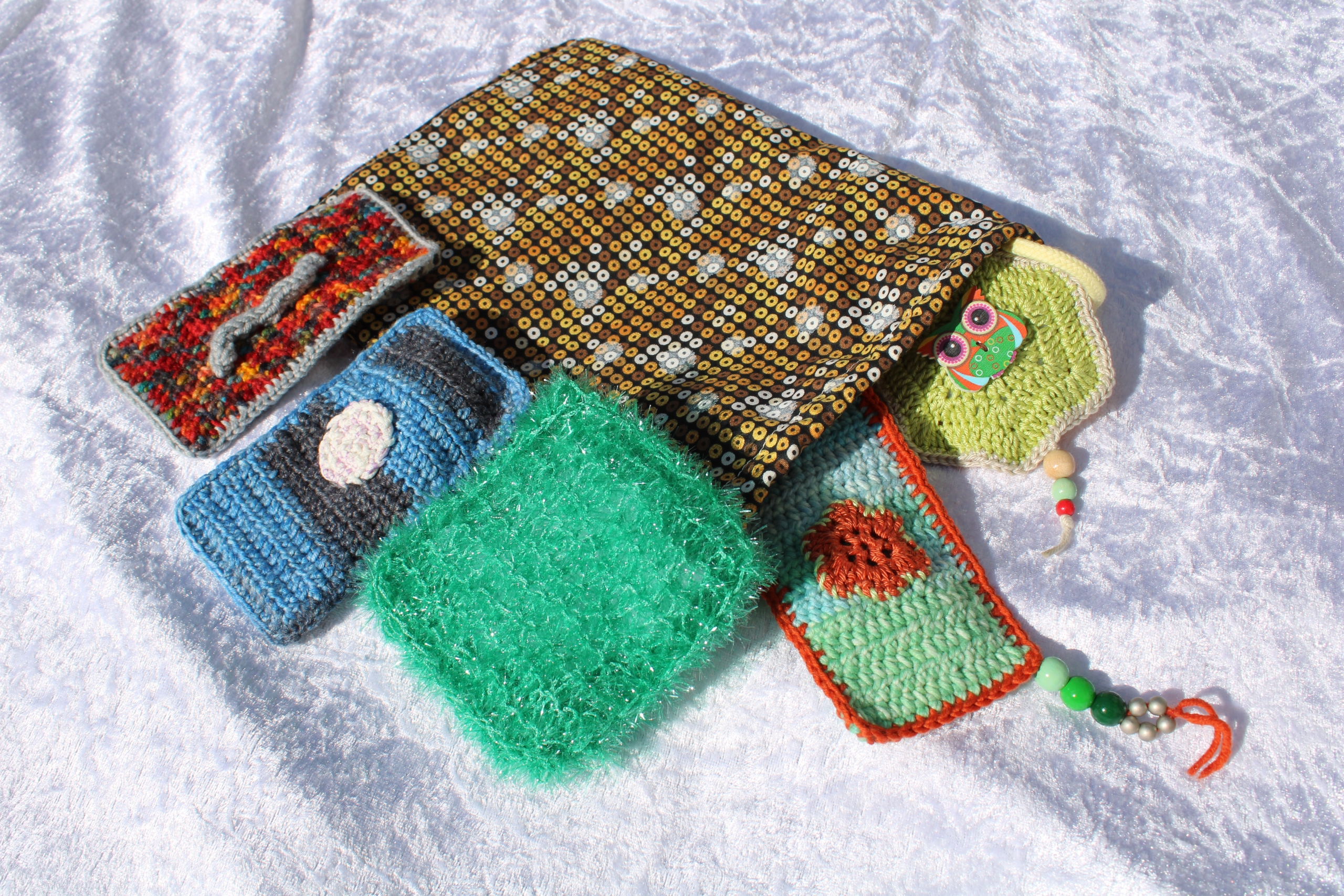 Füllungen: Muttern,Knisterfolie,Holzring, Perlen und ein Säckchen ist aus Schwammgarn.