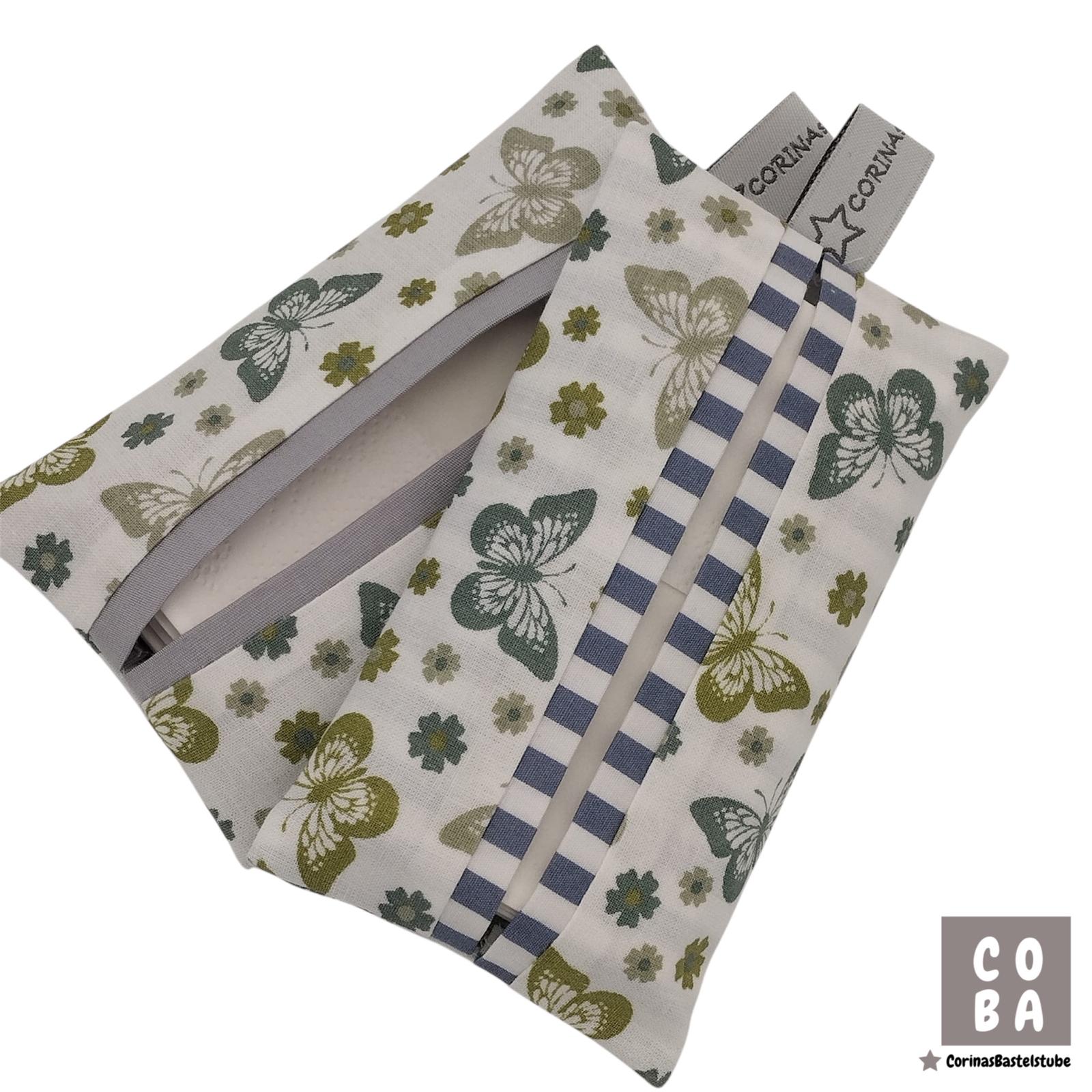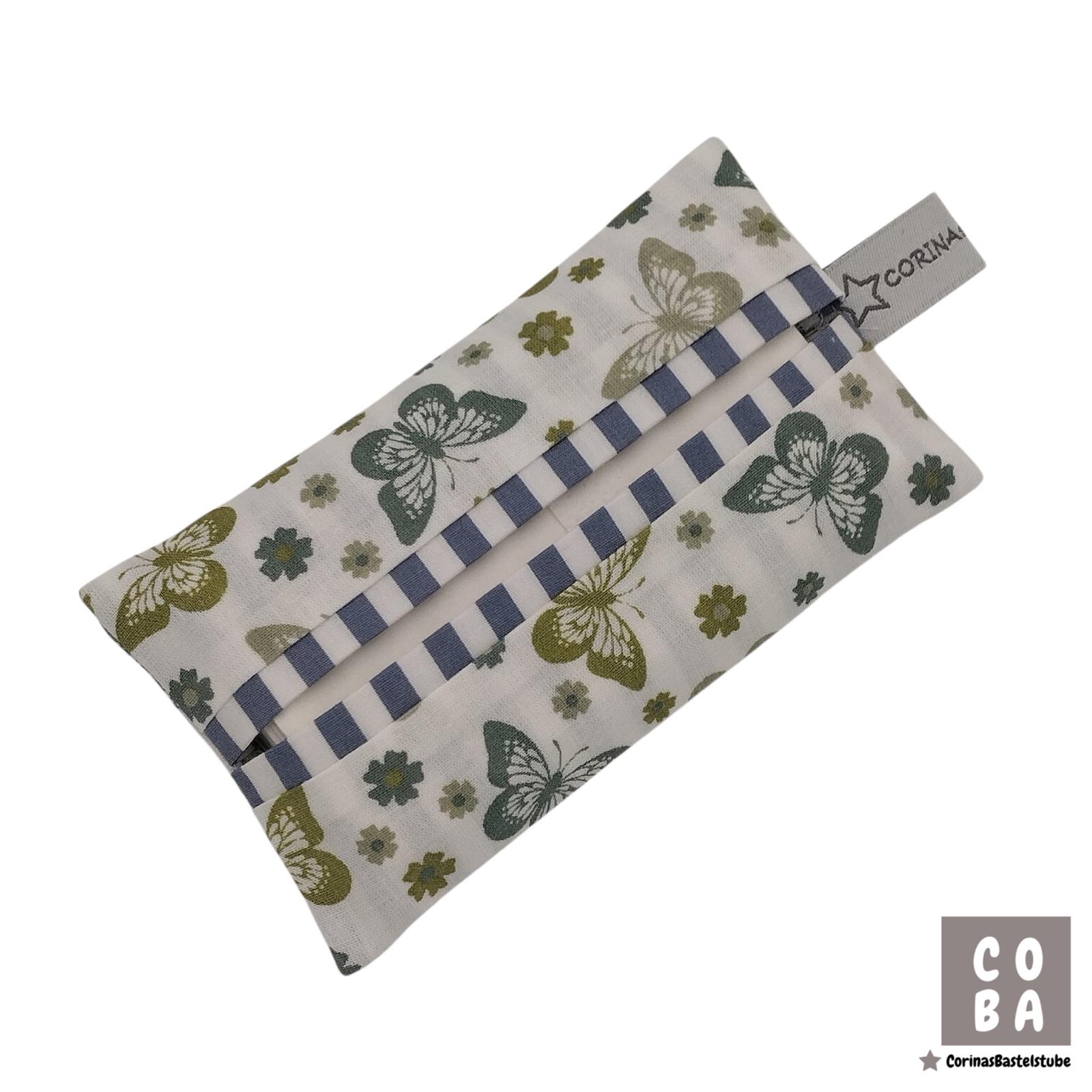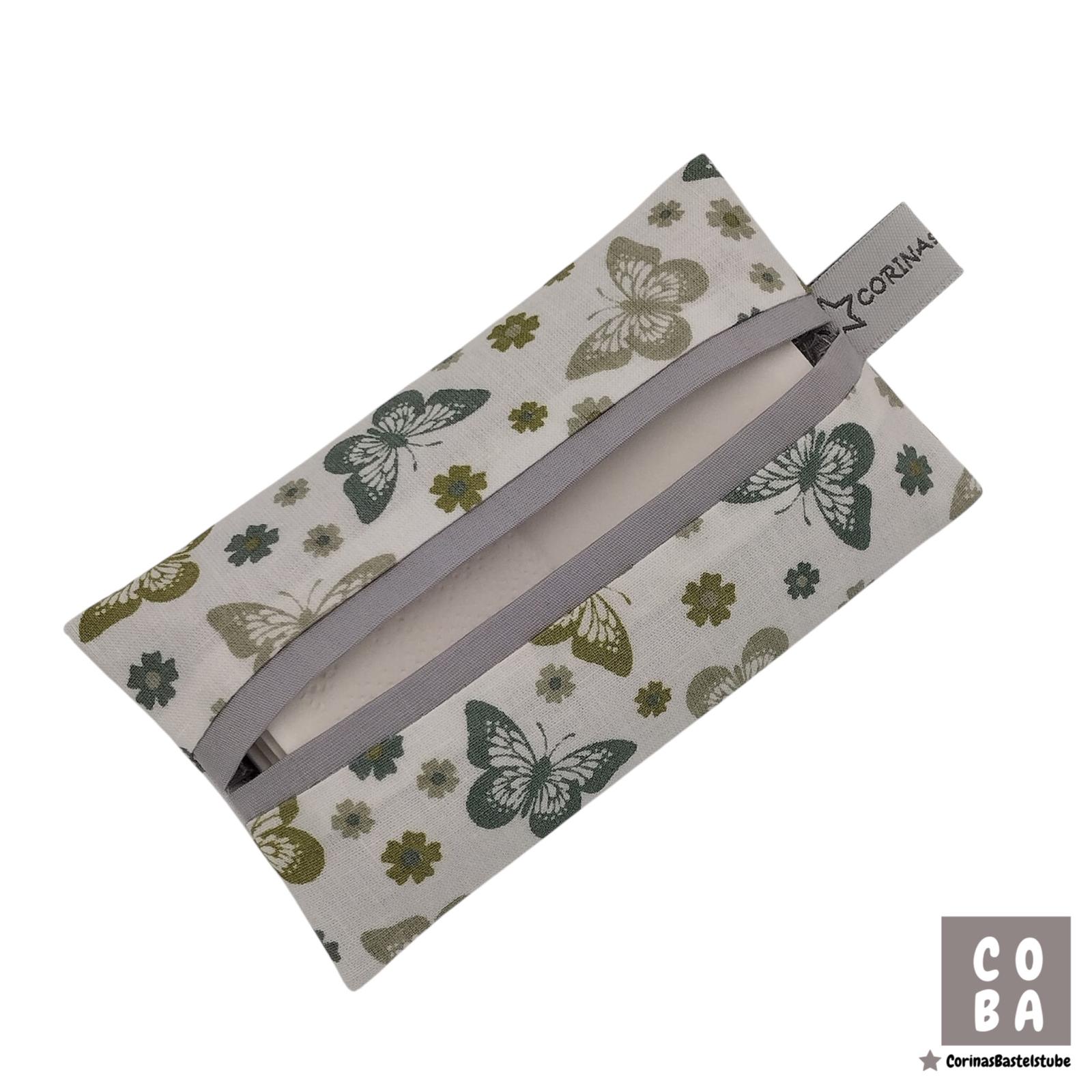 Diese handgefertigte Tatüta ist eine praktische Taschentüchertasche aus 100 % Baumwolle. Weiß in Kombination mit dem verspielten Schmetterlings-Motiv macht sie zu einem hübschen und zugleich nützlichen Alltagsbegleiter.