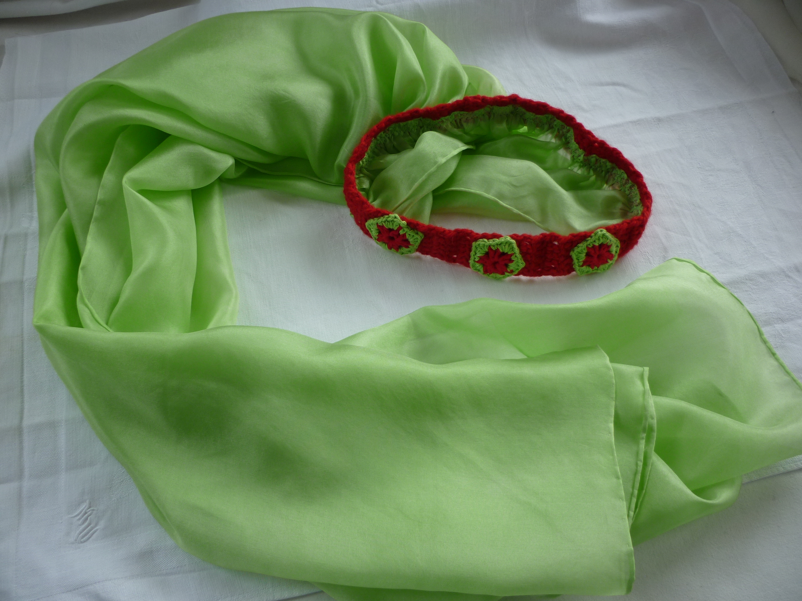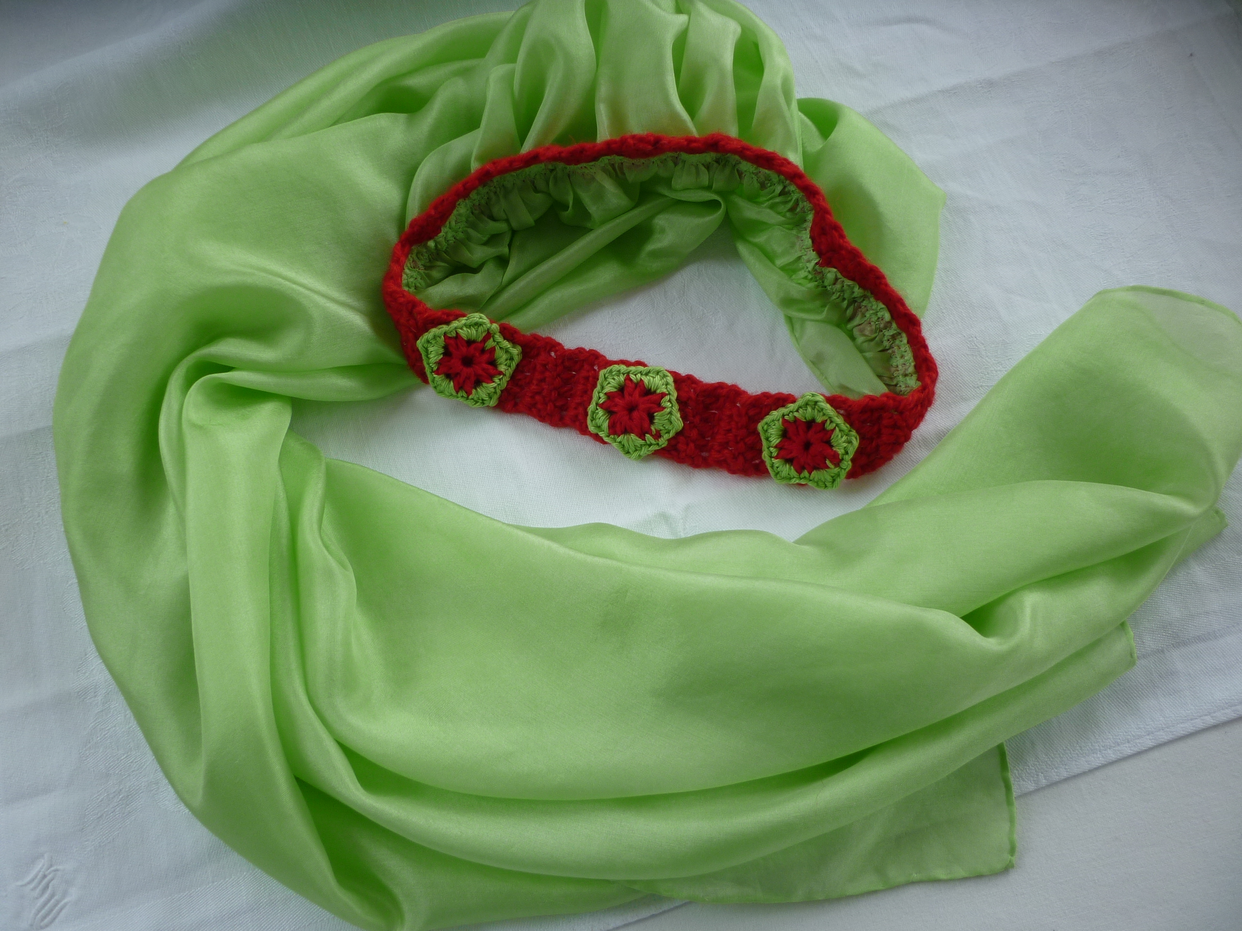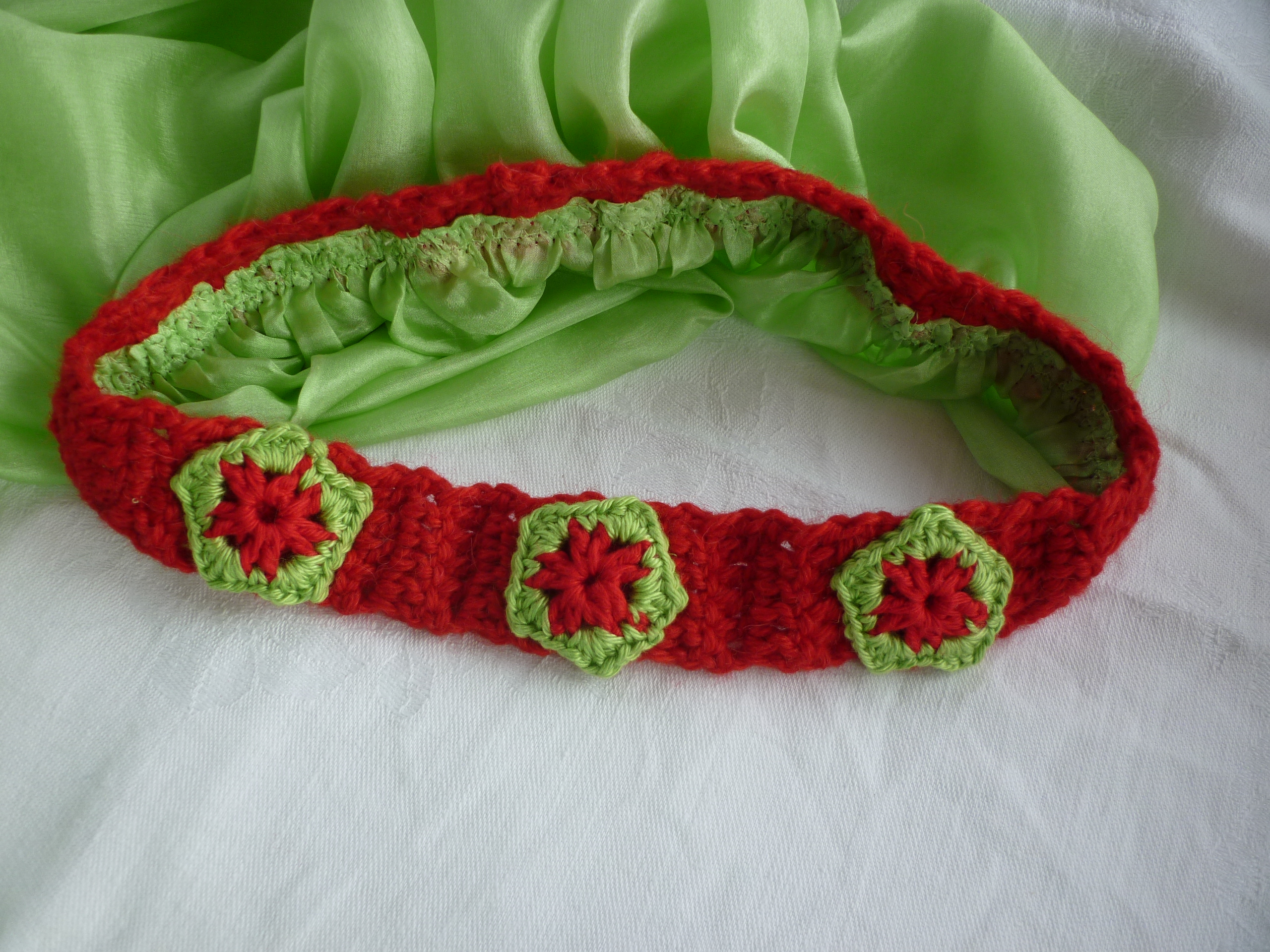 Das Kronenband ist aus Merino-Alpaka-Garn gehäkelt, die drei Blüten aus Baumwollgarn.