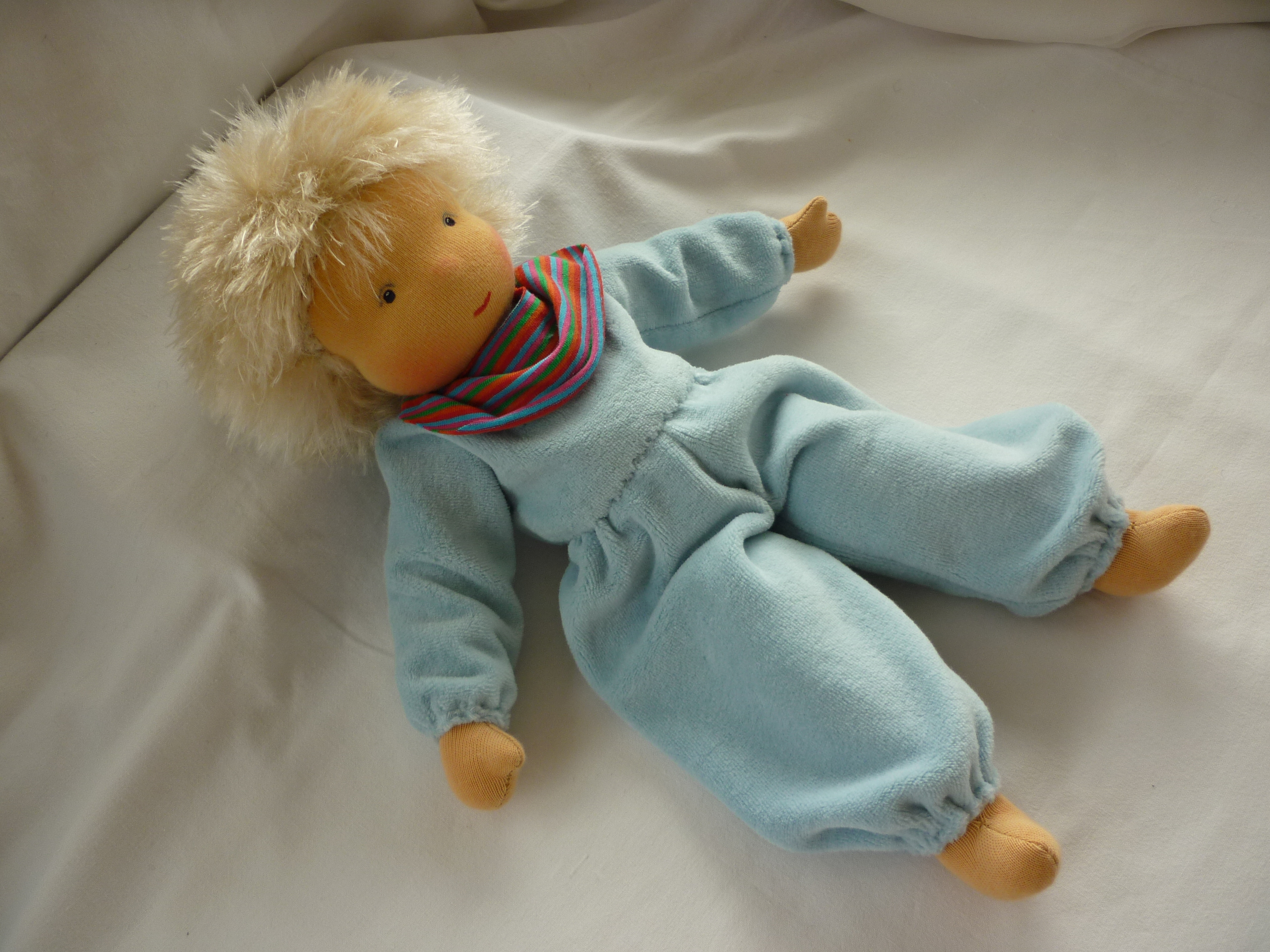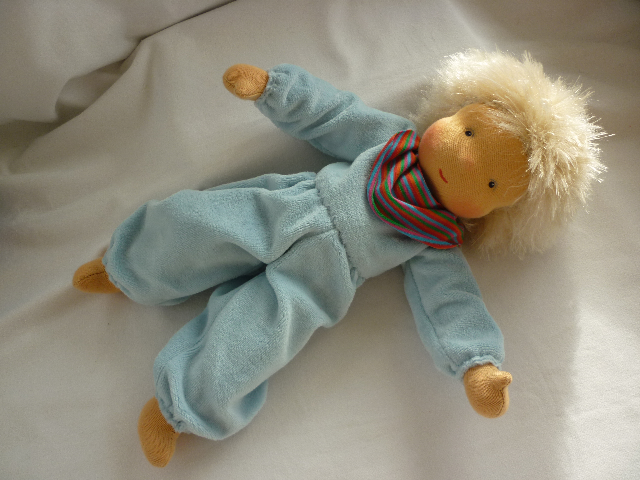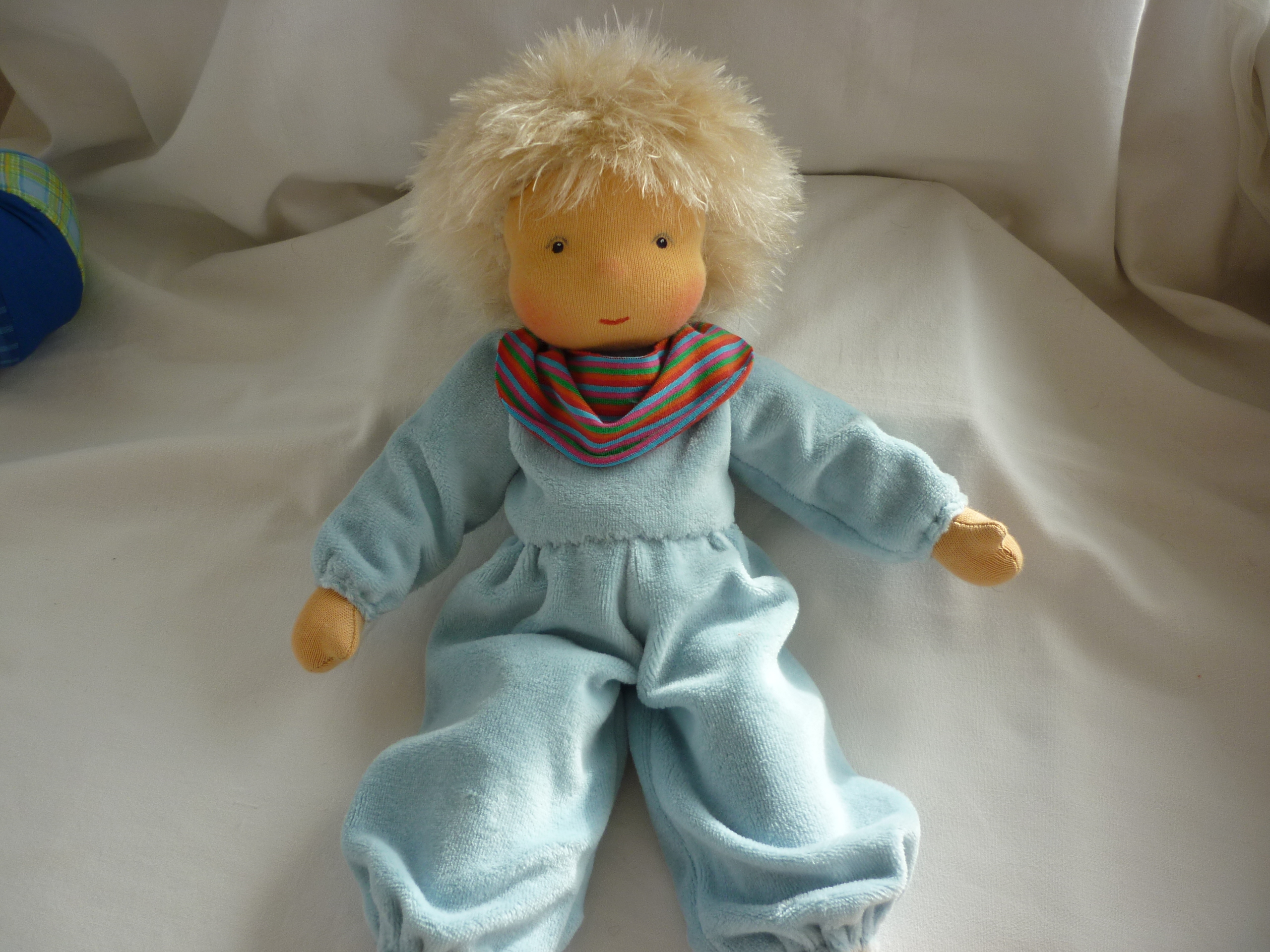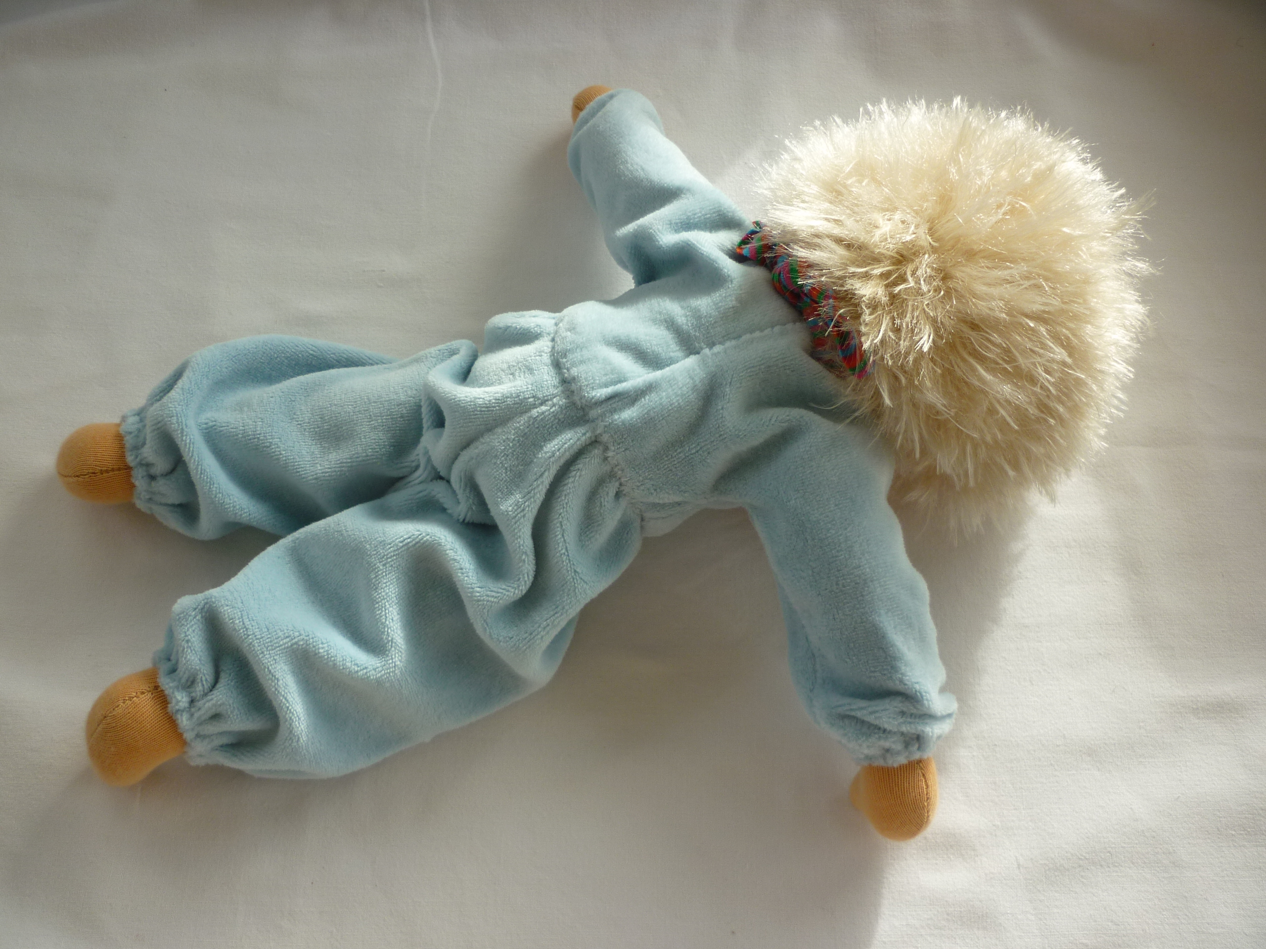 Kopf und Rumpf, Arme und Beine sind aus Schweizer Puppentrikot genäht und mit Schafwolle fest gefüllt. Die Hose und der Pullover sind aus weichem Nickistoff und fest an den Körper angenäht, die Puppe kann also nicht ausgezogen werden, man kann ihr aber gut noch etwas darüberziehen. Z.B. eine Latzhose oder ein Schürzenkleid, wie Sie sie auch in meinem Shop finden.