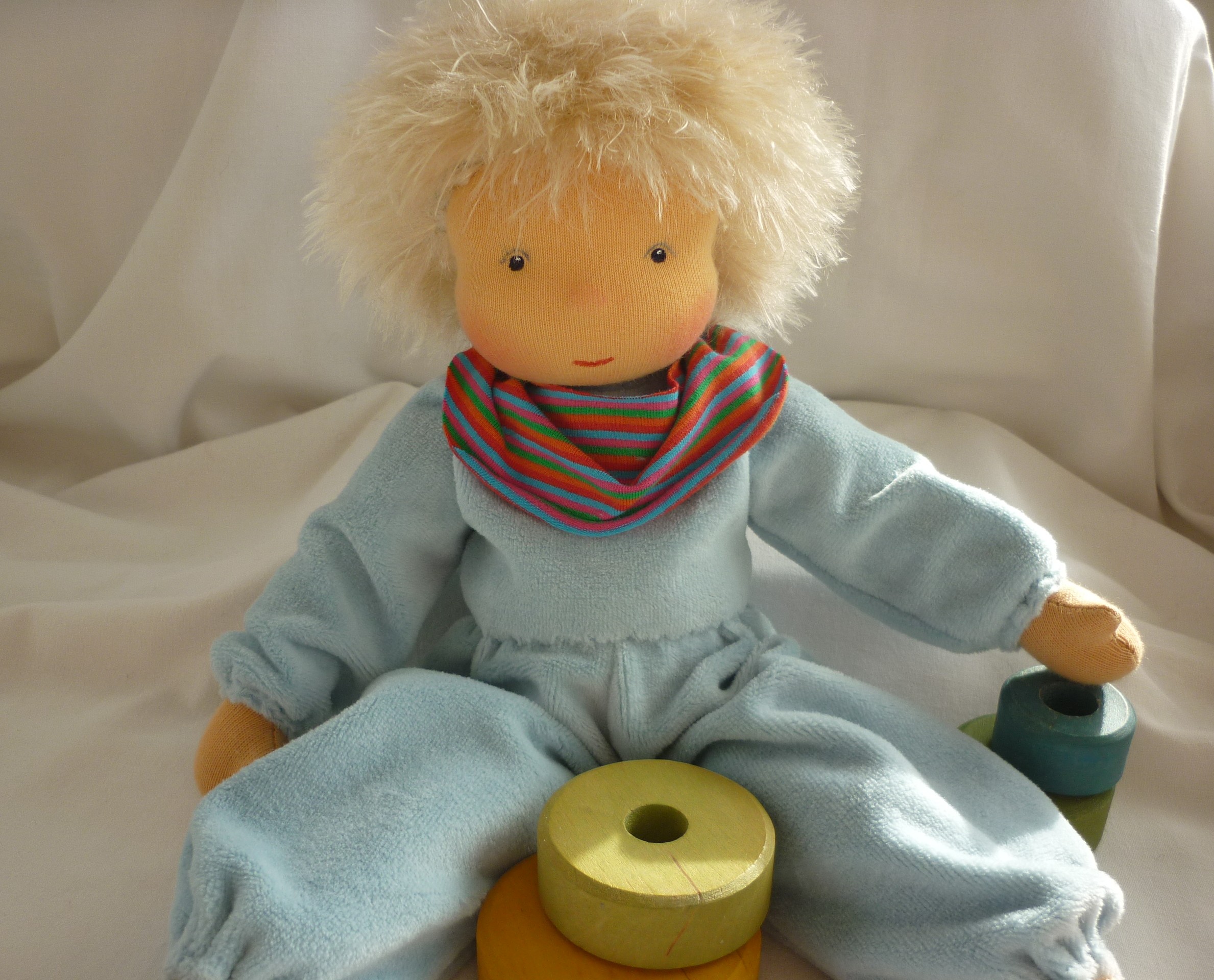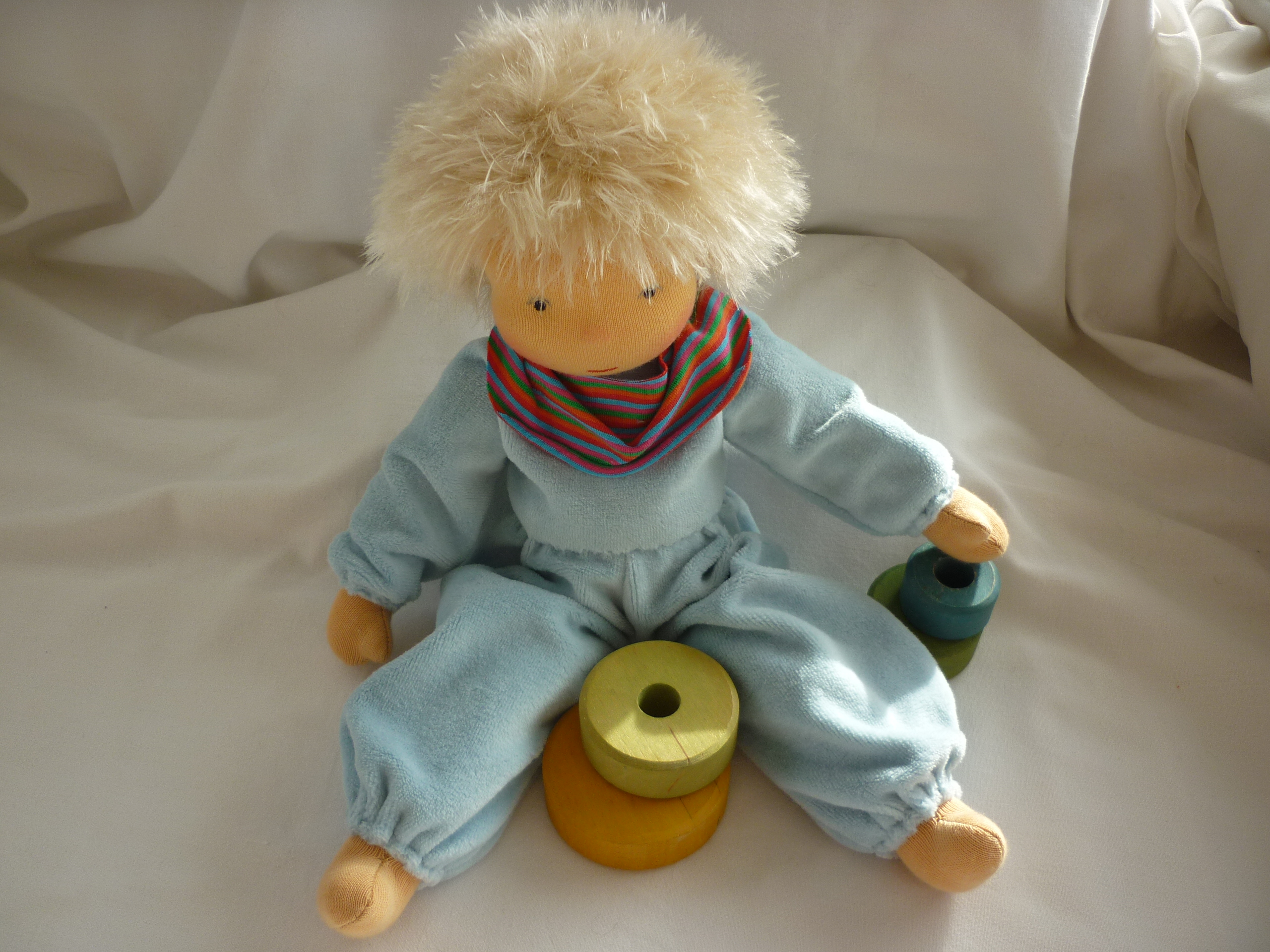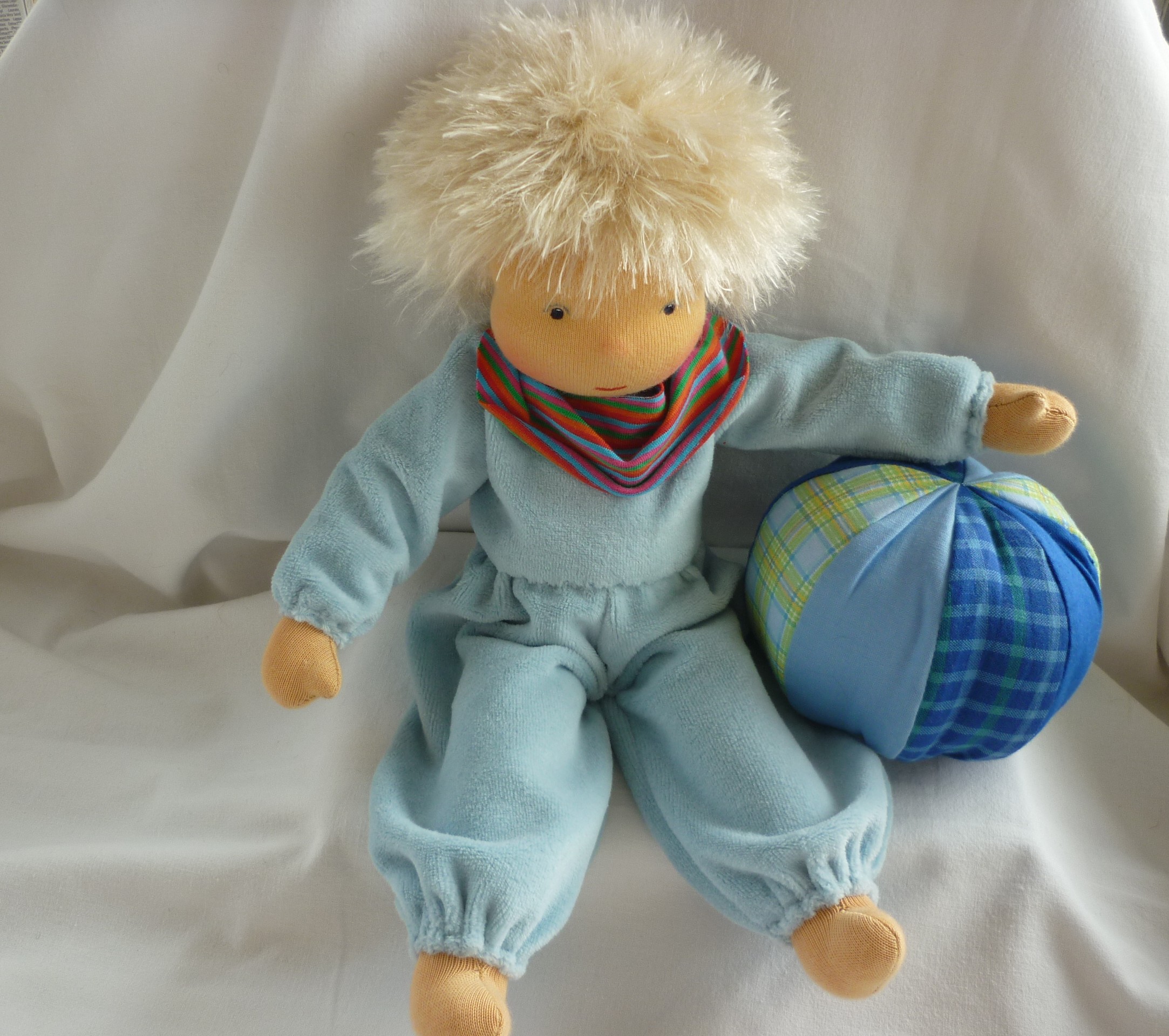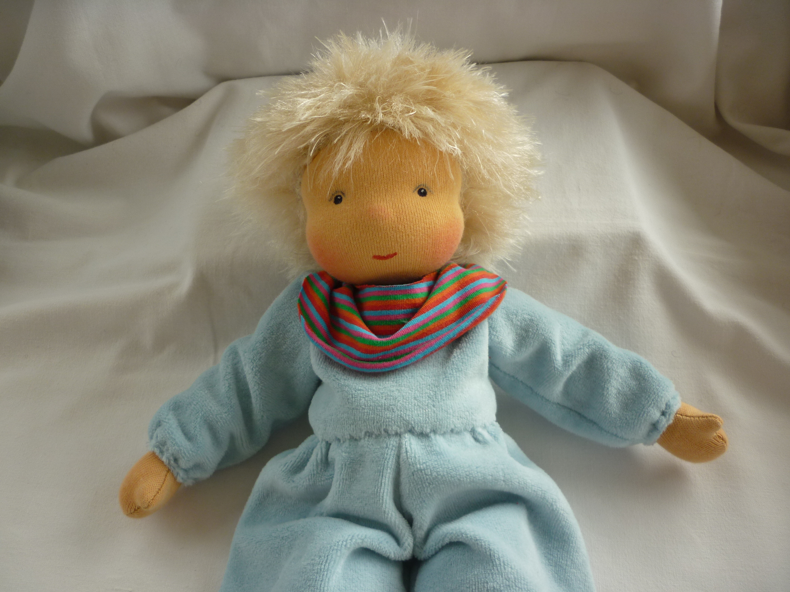 Kopf und Rumpf, Arme und Beine sind aus Schweizer Puppentrikot genäht und mit Schafwolle fest gefüllt. Die Hose und der Pullover sind aus weichem Nickistoff und fest an den Körper angenäht, die Puppe kann also nicht ausgezogen werden, man kann ihr aber gut noch etwas darüberziehen. Z.B. eine Latzhose oder ein Schürzenkleid, wie Sie sie auch in meinem Shop finden.