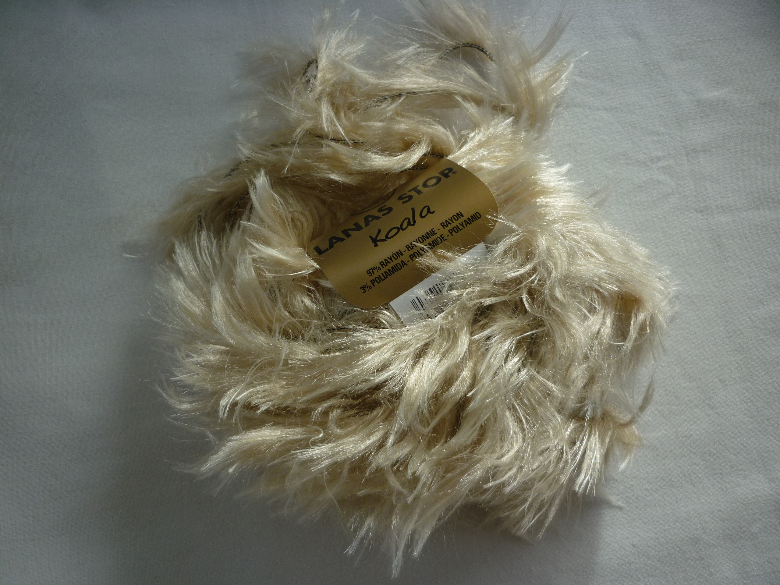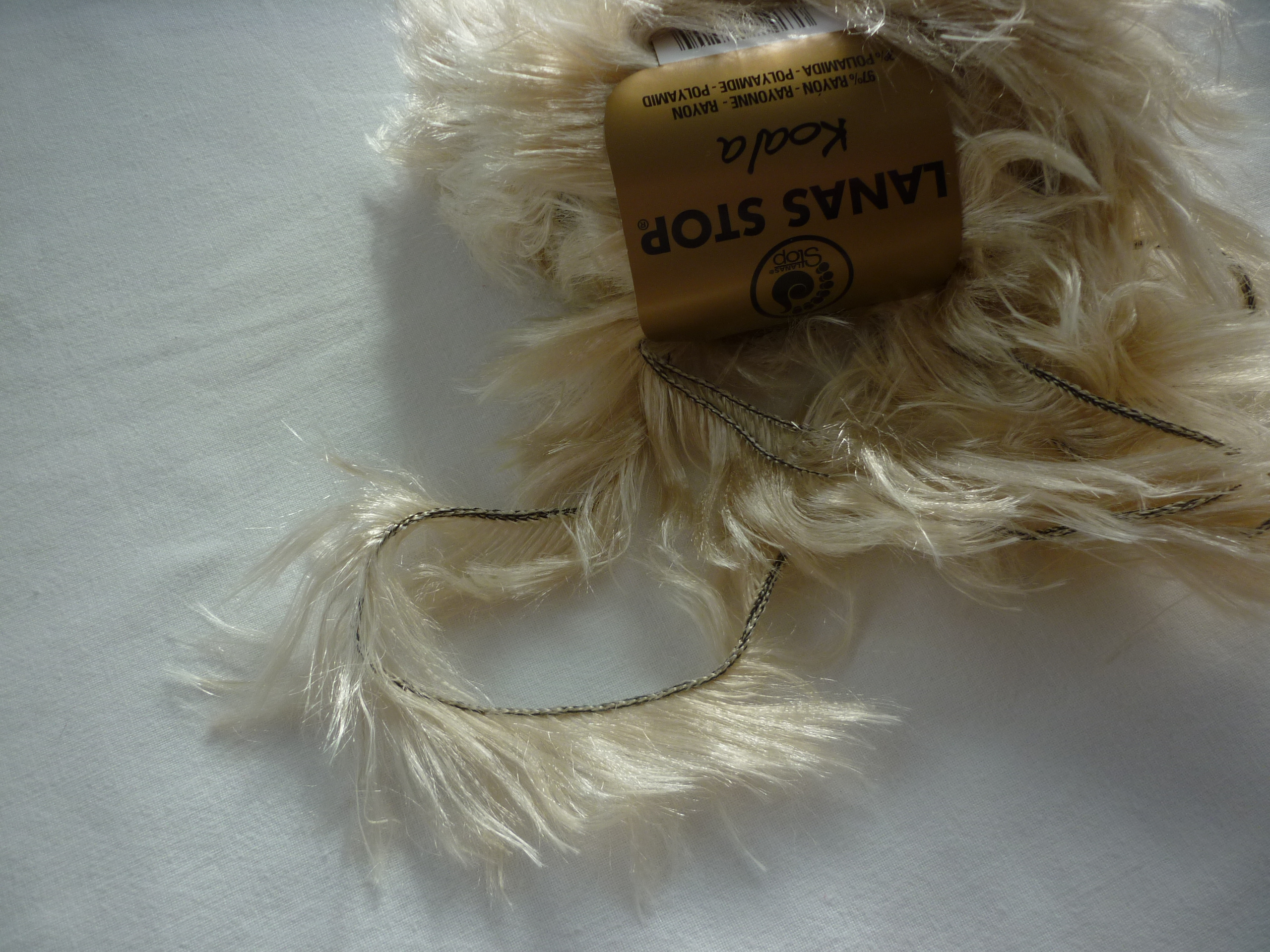 Für die Frisur habe ich aus Rayongarn ("Fake-Pelz" 97% Rayon, 3% Polyamid) eine Perücke gehäkelt und fest an den Kopf genäht.. Augen und Mund sind mit wasserfester Stofffarbe aufgemalt. Das Halstuch ist nur locker umgeknotet und kann entfernt werden.