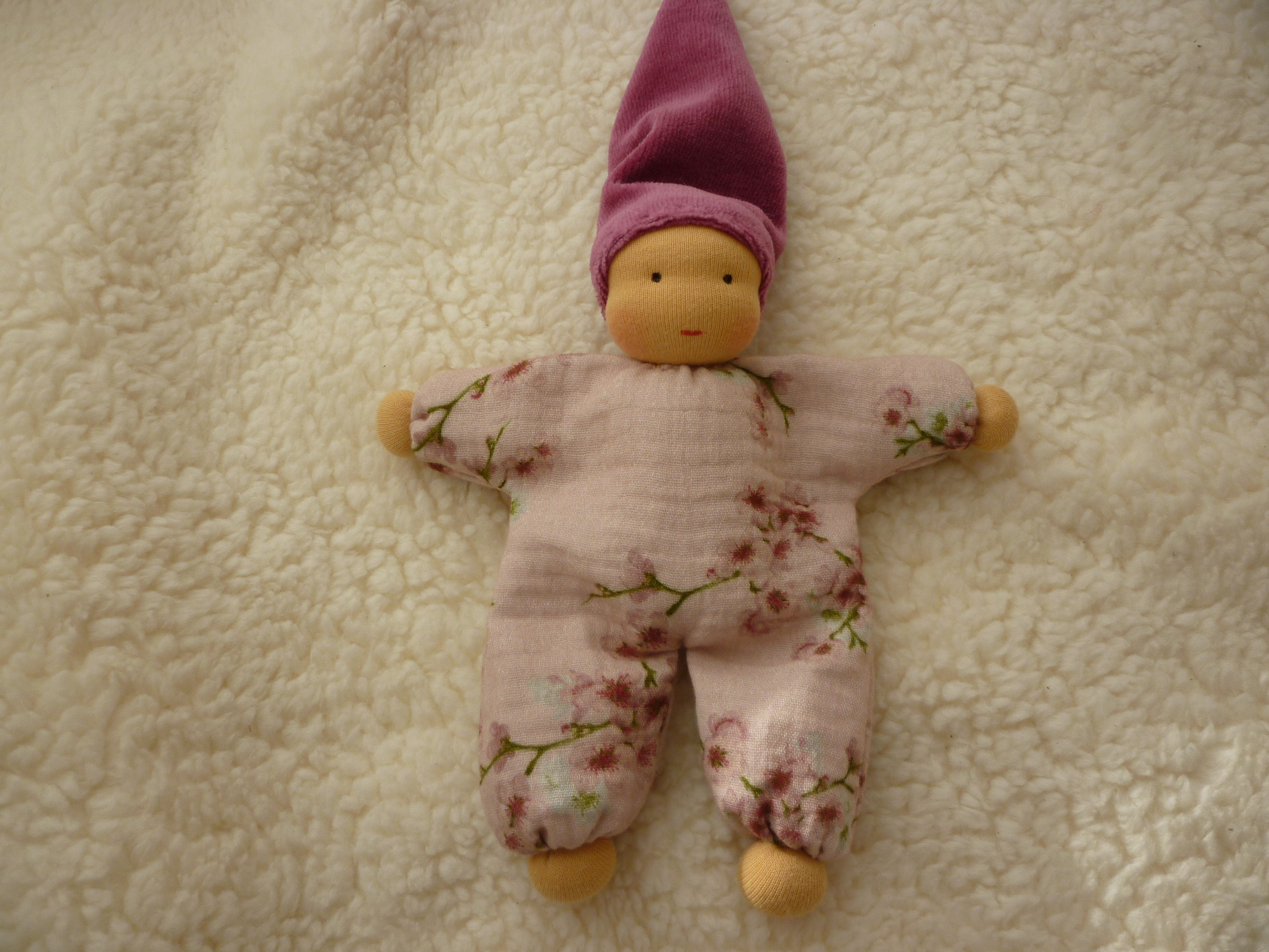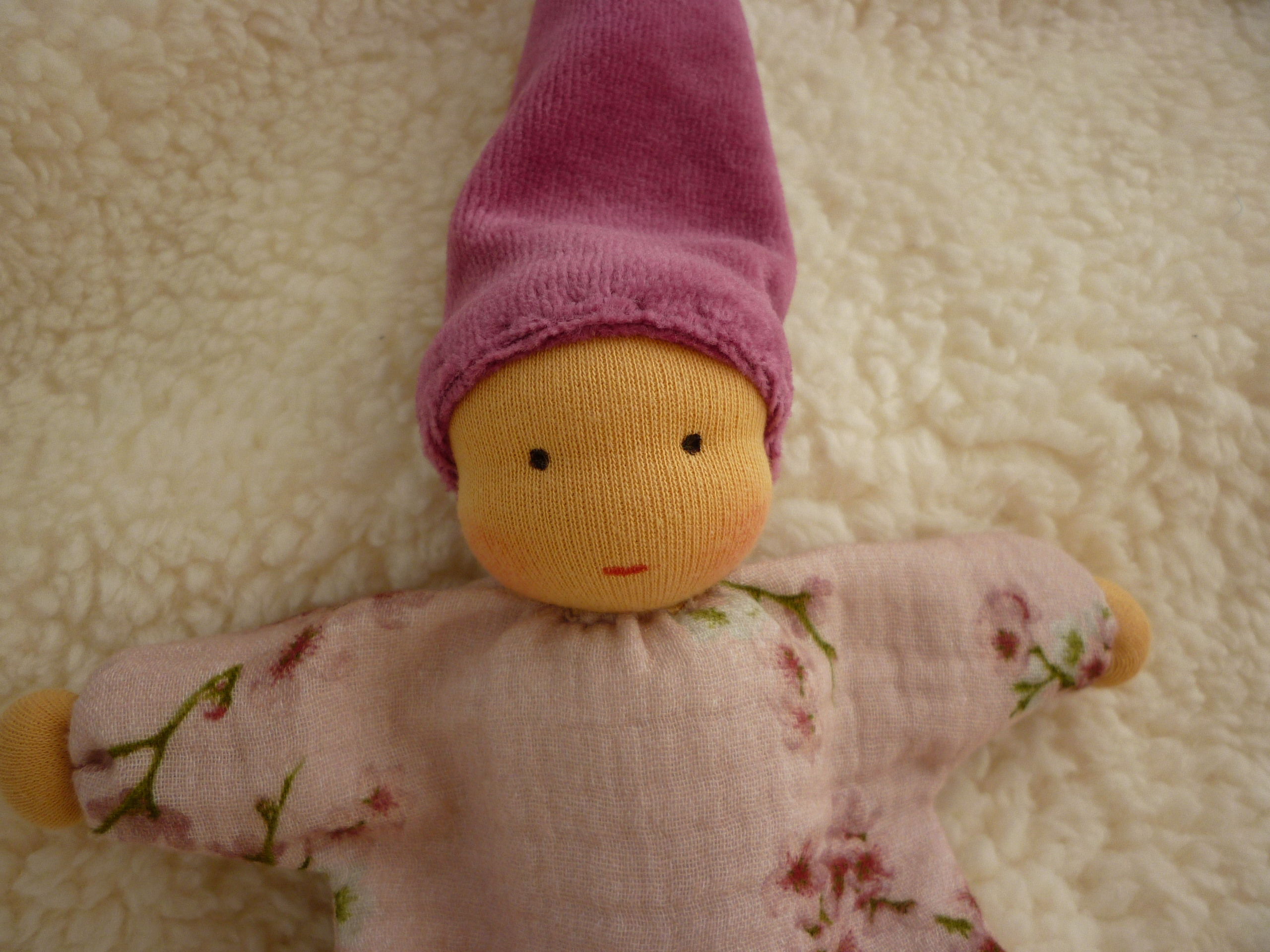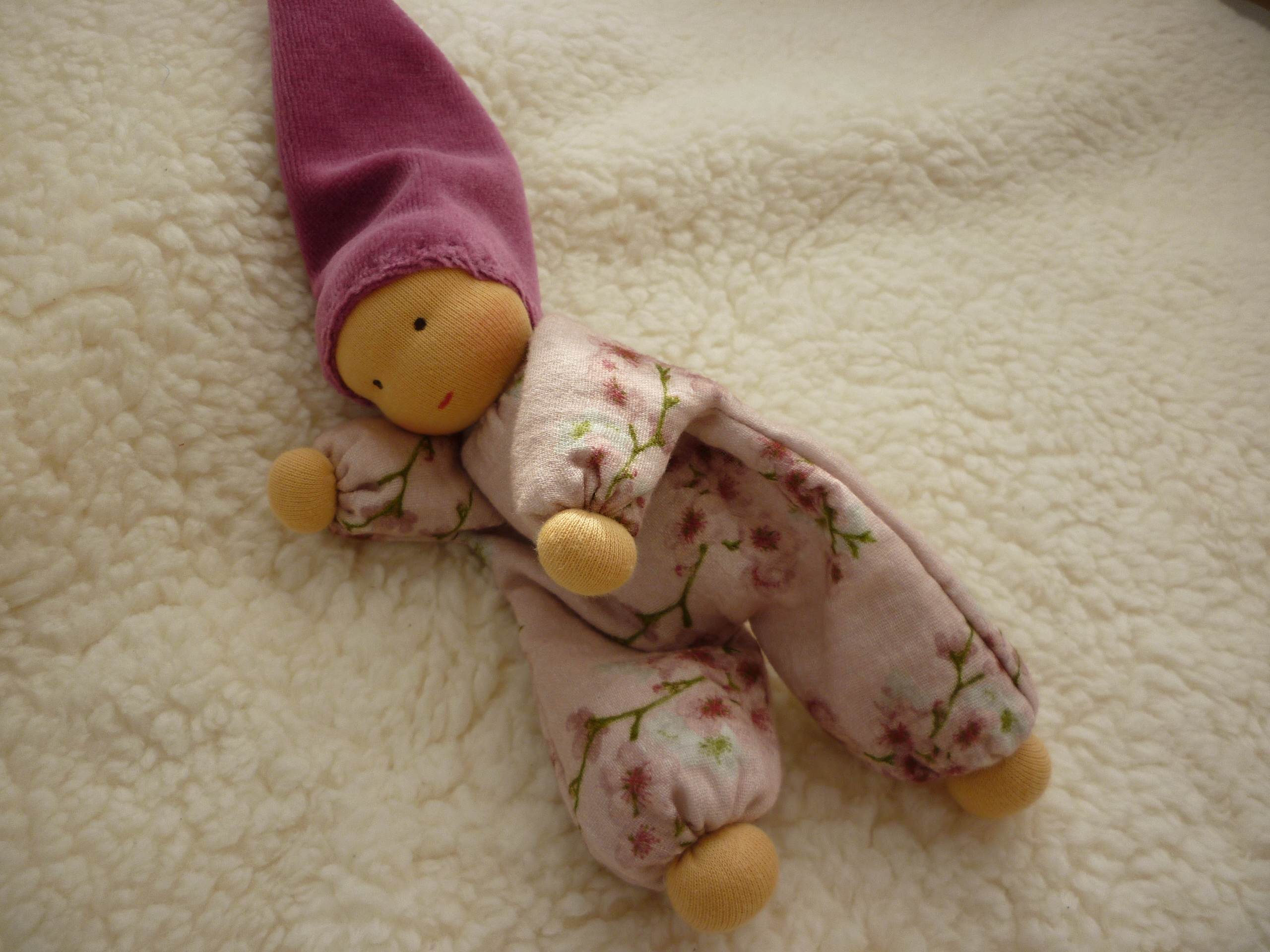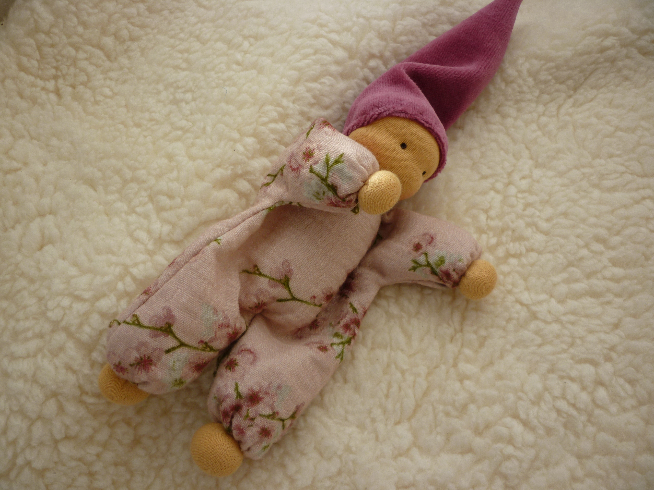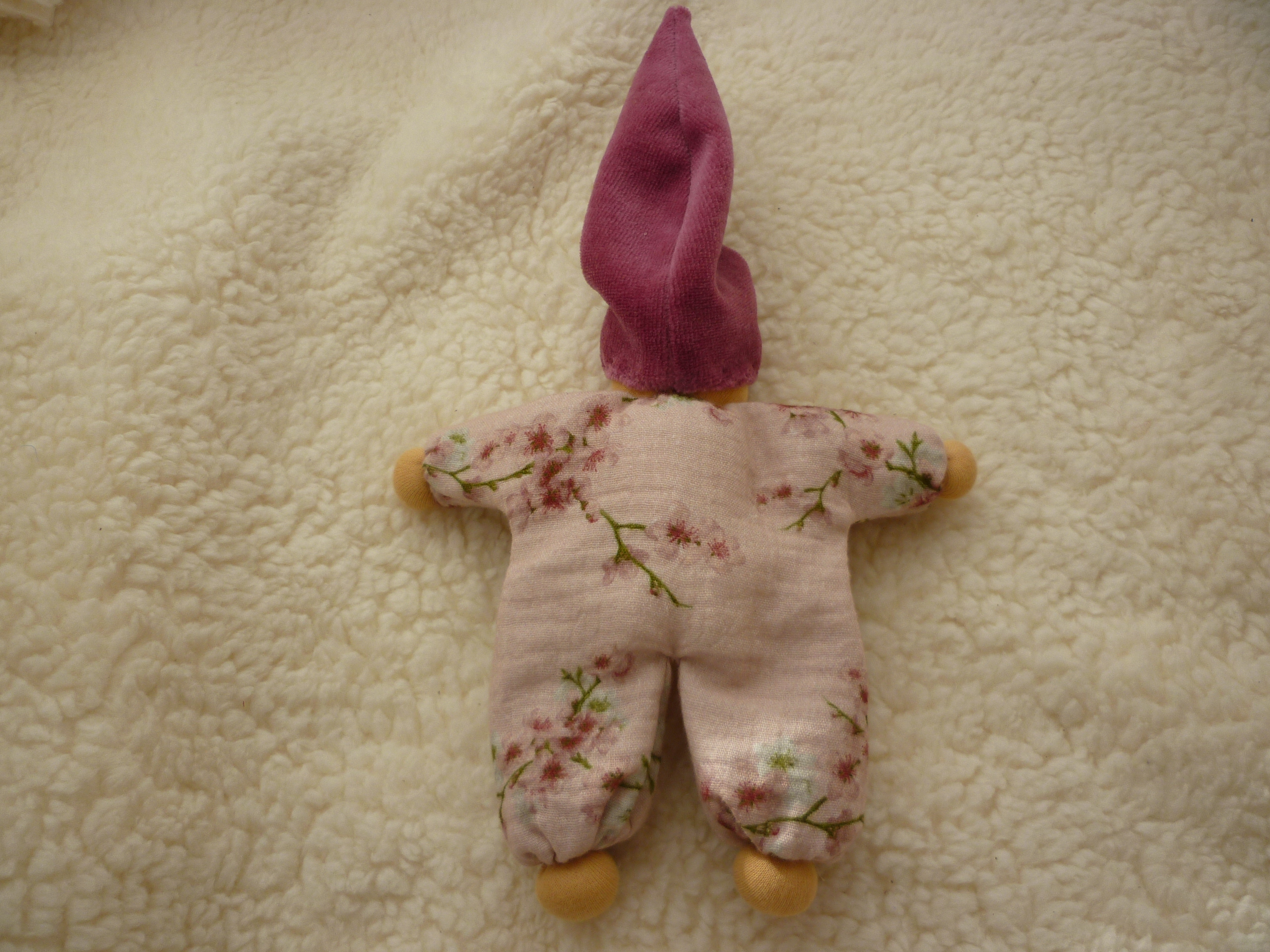 Der Körper ist aus Musselin double gauze genäht und nur im Rumpf leicht gefüllt. Weil der Musselin ein ganz zarter, leichter Stoff ist, habe ich ihn doppellagig mit einem feinen, weißen Baumwollstoff innen vernäht. Der Kopf, die Hände und Füße sind aus Schweizer Puppentrikot, mit Bio-Schafwolle gefüllt. Die braunen Augen und der Mund sind mit wasserfester Stofffarbe aufgemalt, die Zipfelmütze aus Nicki ist fest an den Kopf genäht.