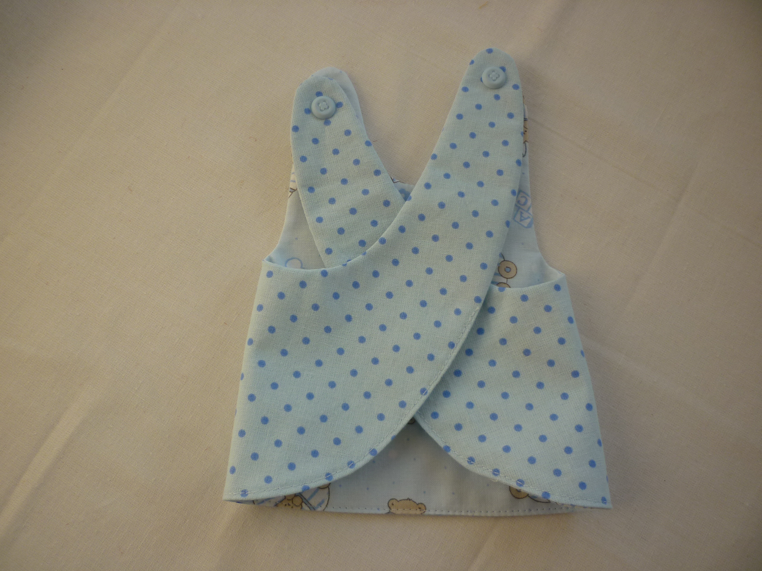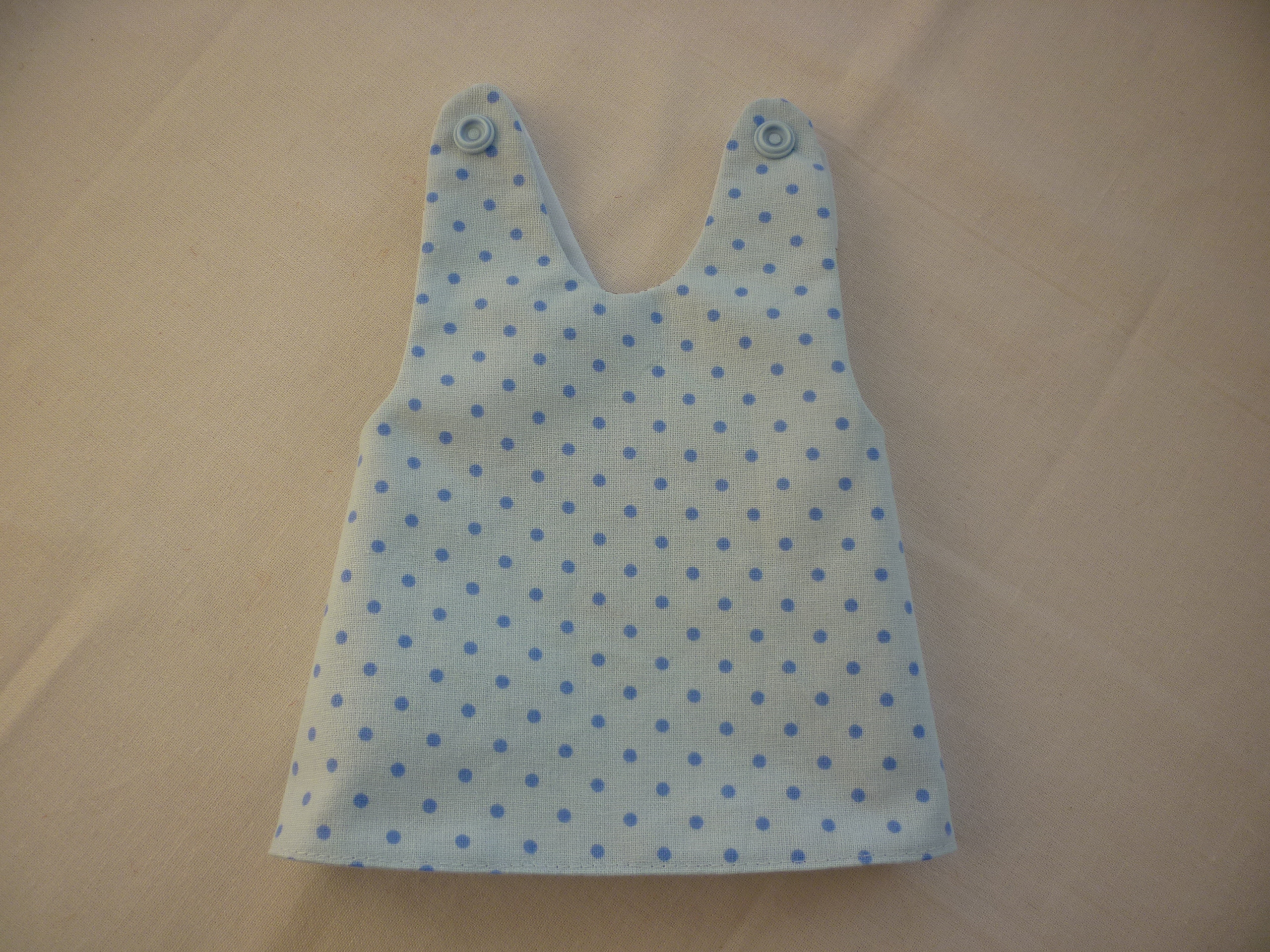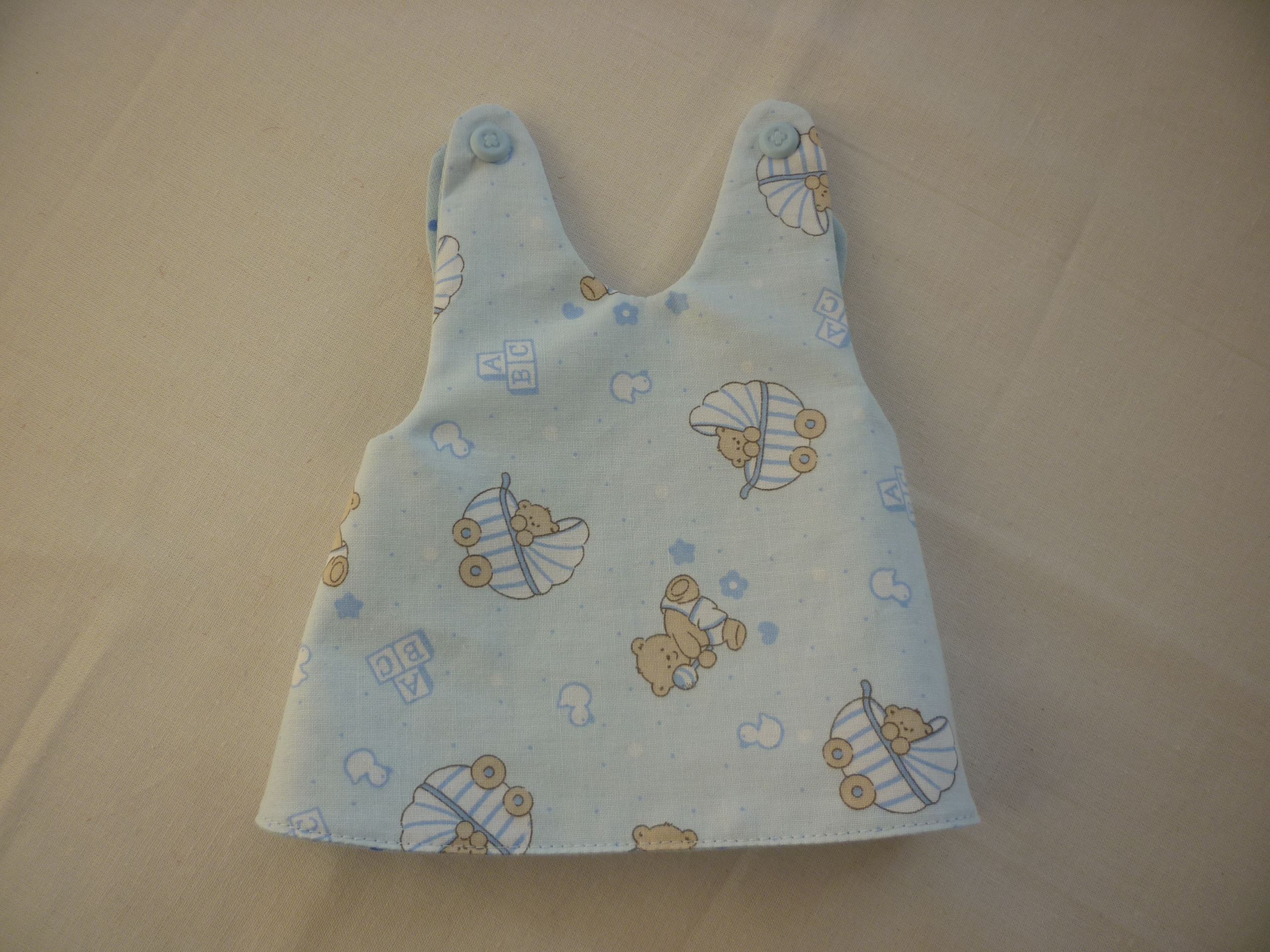Maßgeschneidert für mein Schlamperle und Nickilie, passt Puppen von ca 30 bis 35 cm Länge. Baumwollstoffe, eine Seite hellblau mit Bärchenmotiv, eine Seite mit blauen Pünktchen, mit Color Snaps auf den Schultern zu schließen. Vom Halsausschnitt bis zum Saum 12 cm, die einf. Unterarmbreite beträgt ca 13 cm.