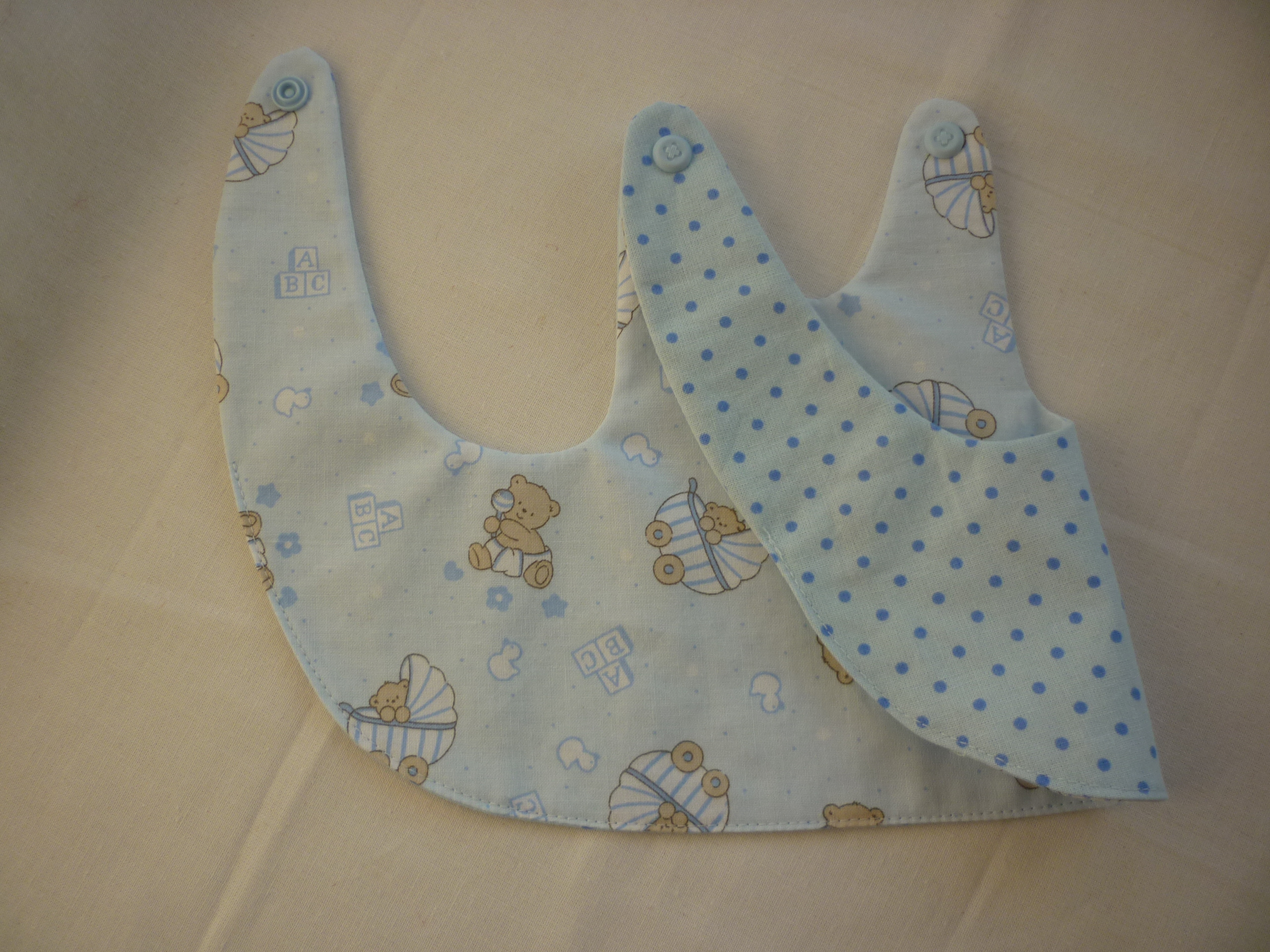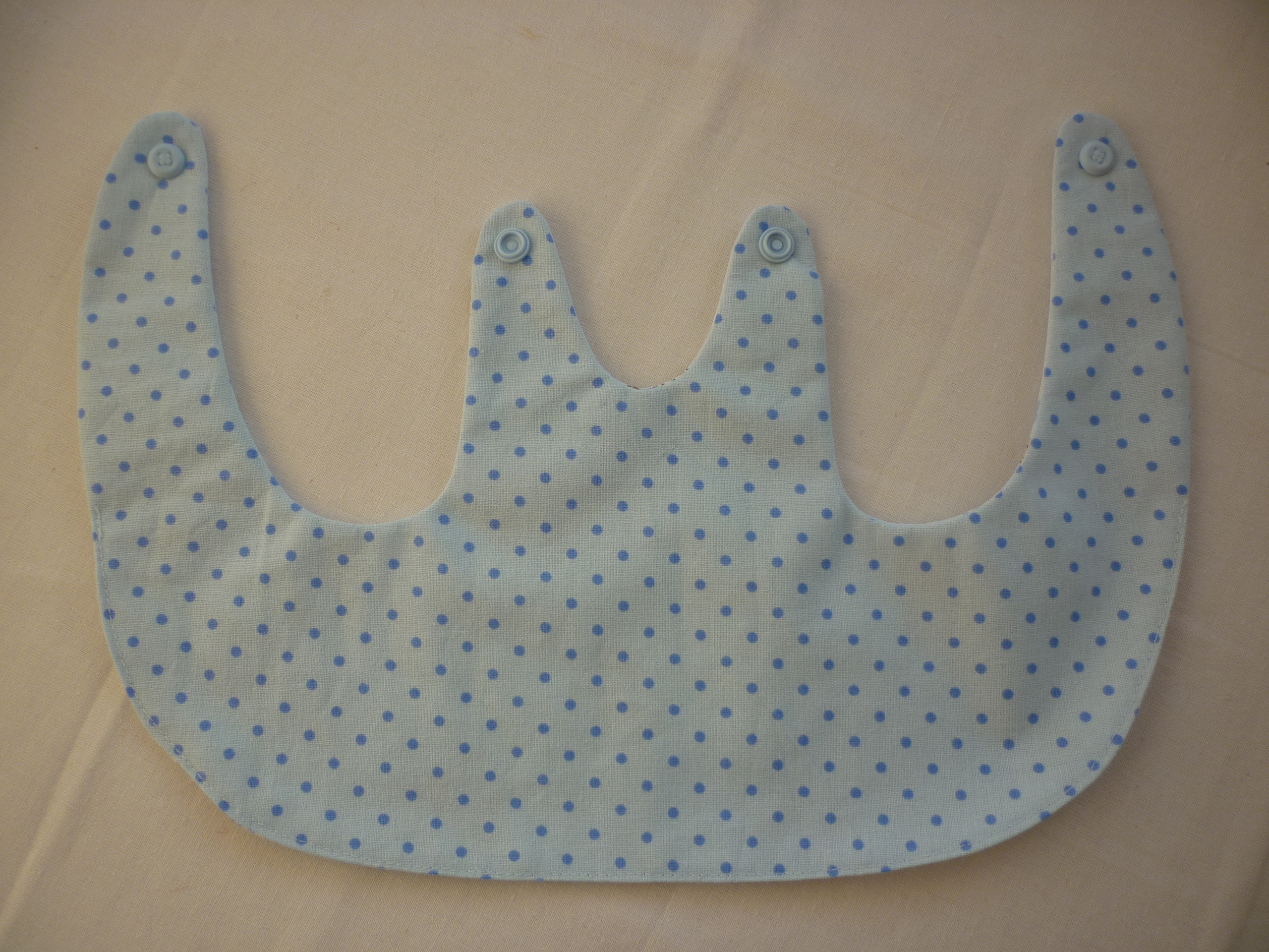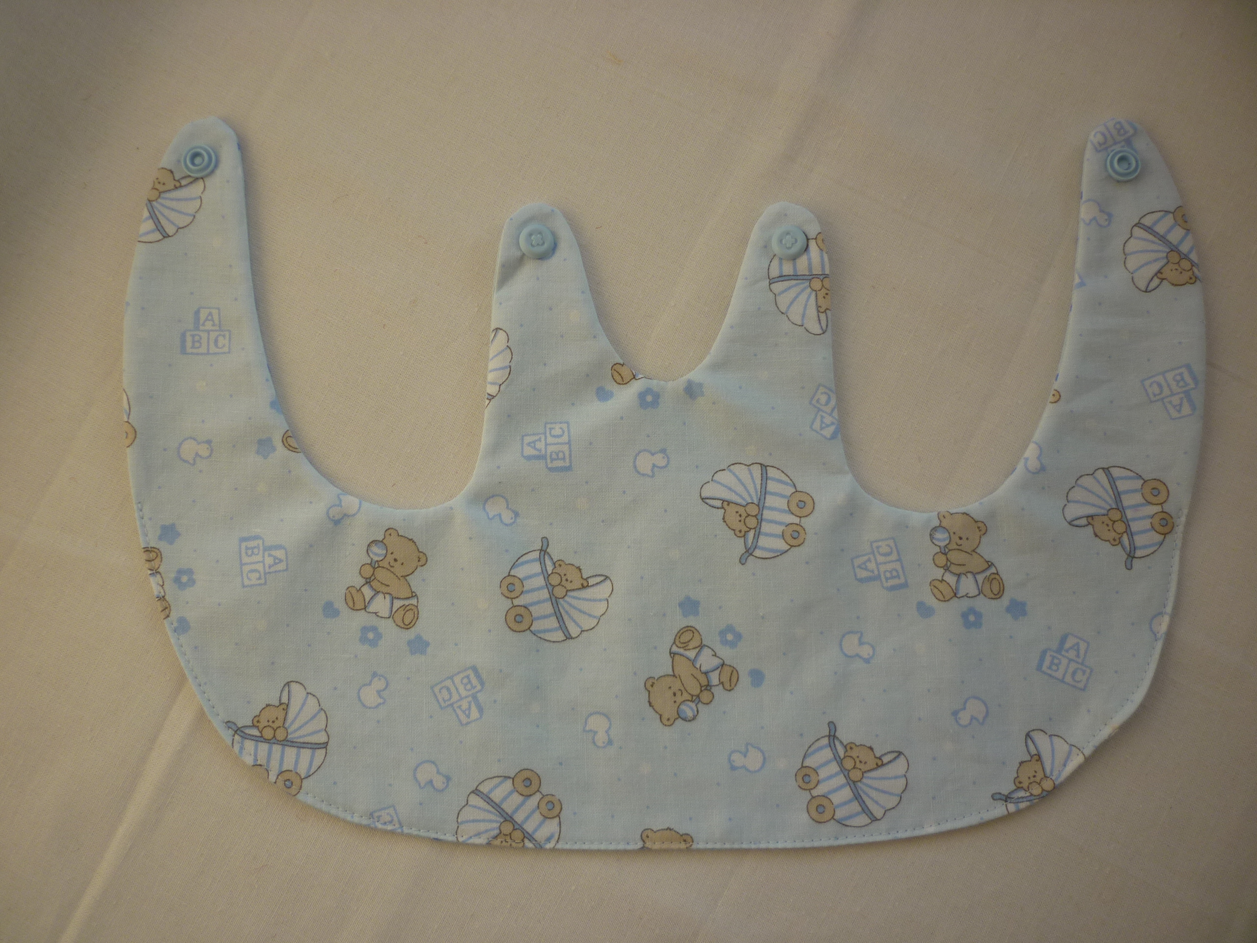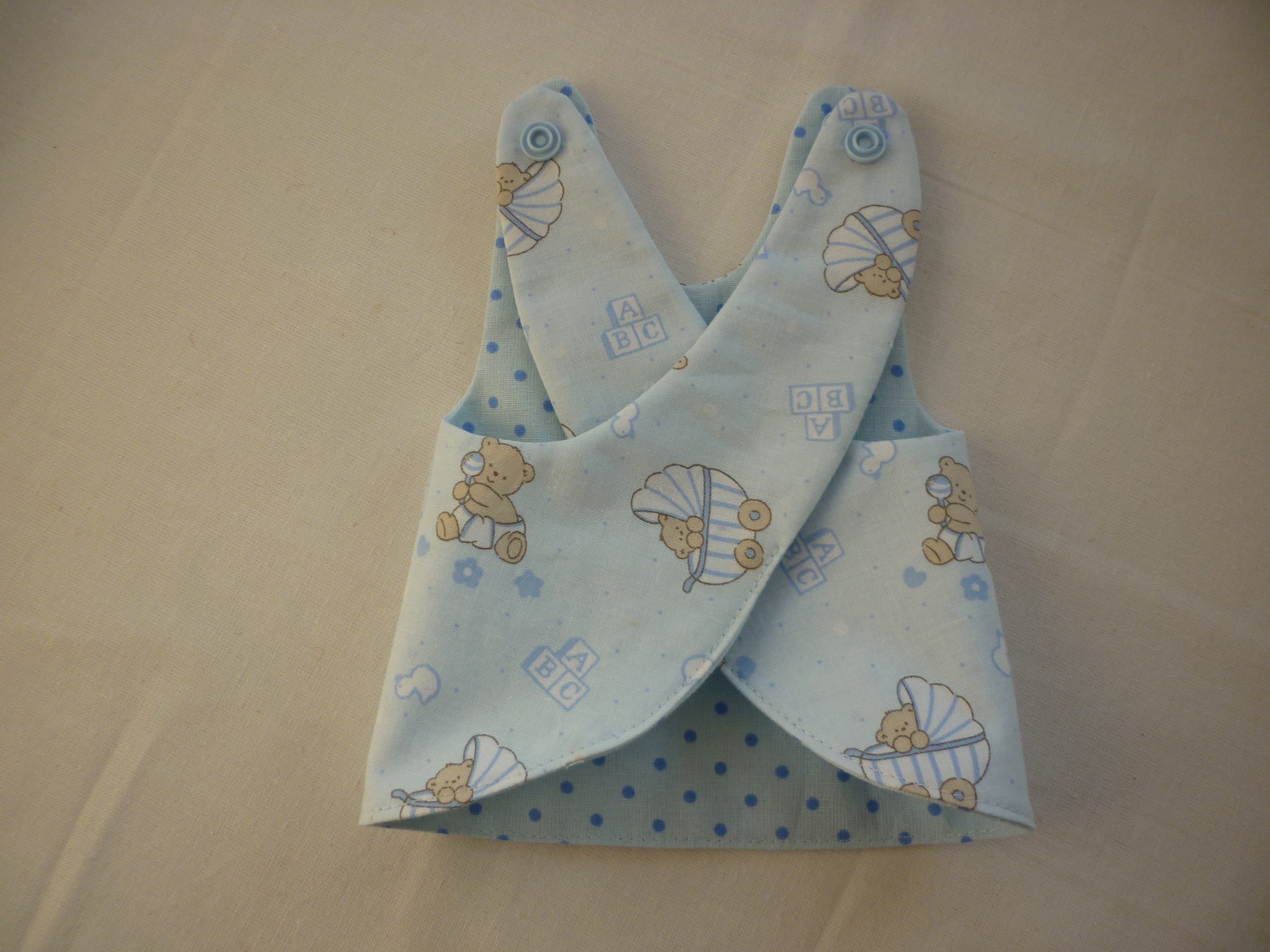 Maßgeschneidert für mein Schlamperle und Nickilie, passt Puppen von ca 30 bis 35 cm Länge. Baumwollstoffe, eine Seite hellblau mit Bärchenmotiv, eine Seite mit blauen Pünktchen, mit Color Snaps auf den Schultern zu schließen. Vom Halsausschnitt bis zum Saum 12 cm, die einf. Unterarmbreite beträgt ca 13 cm.