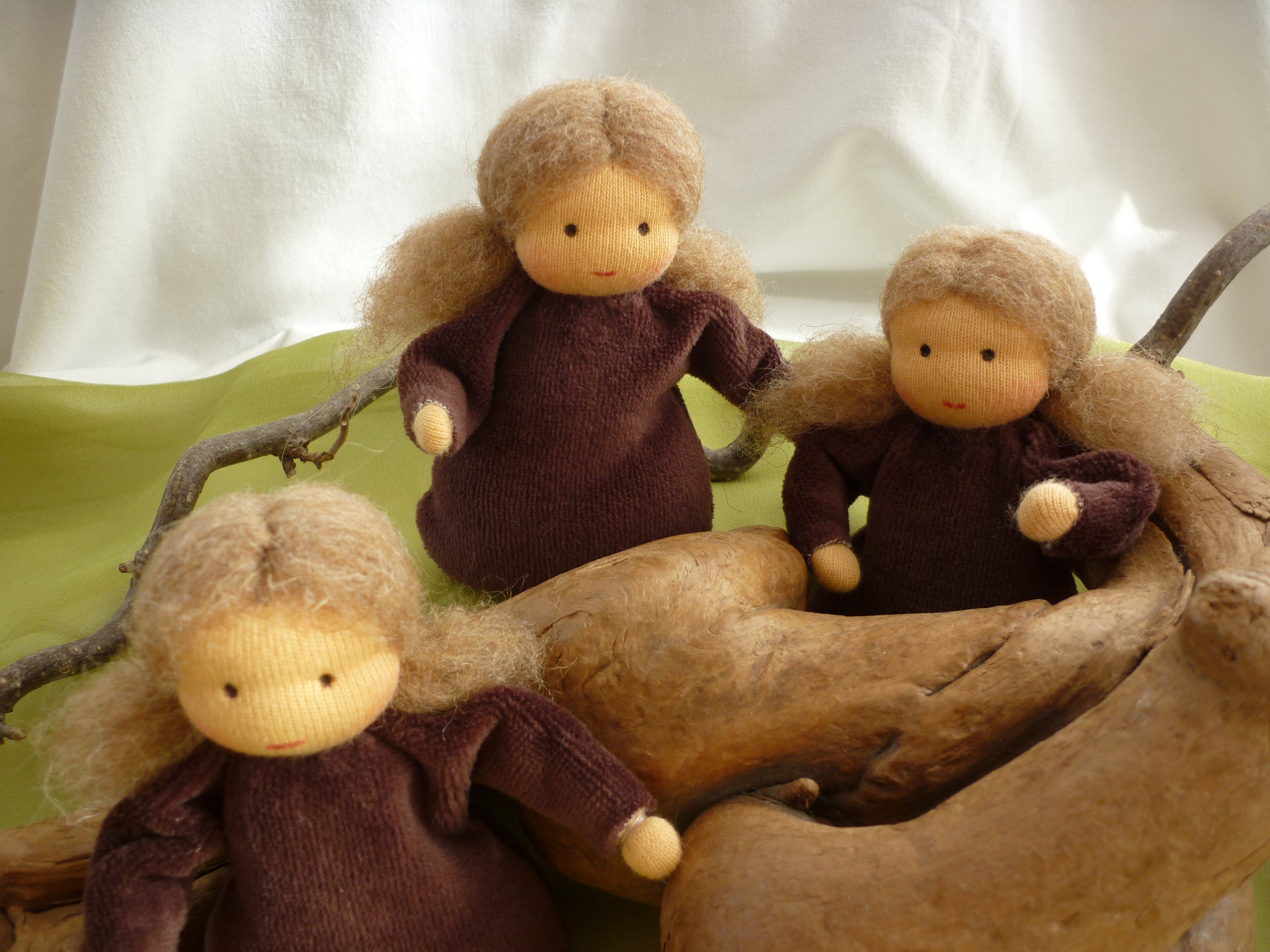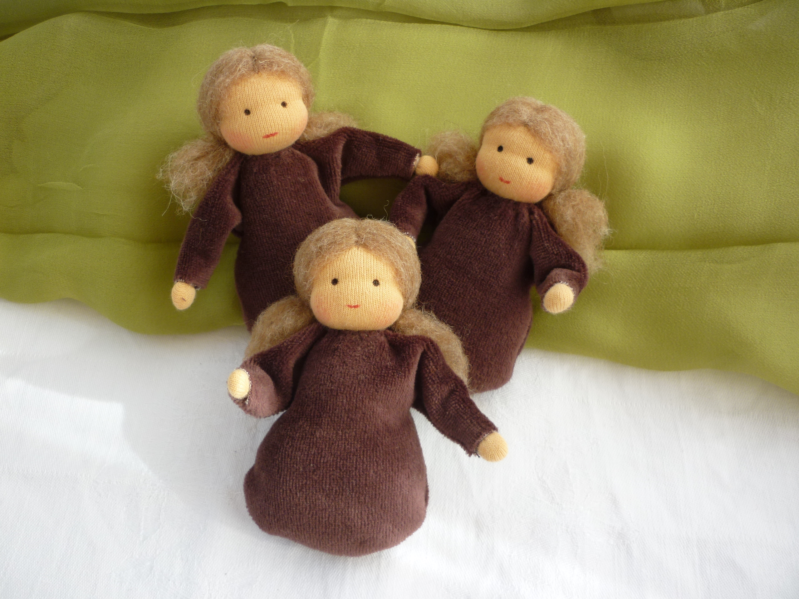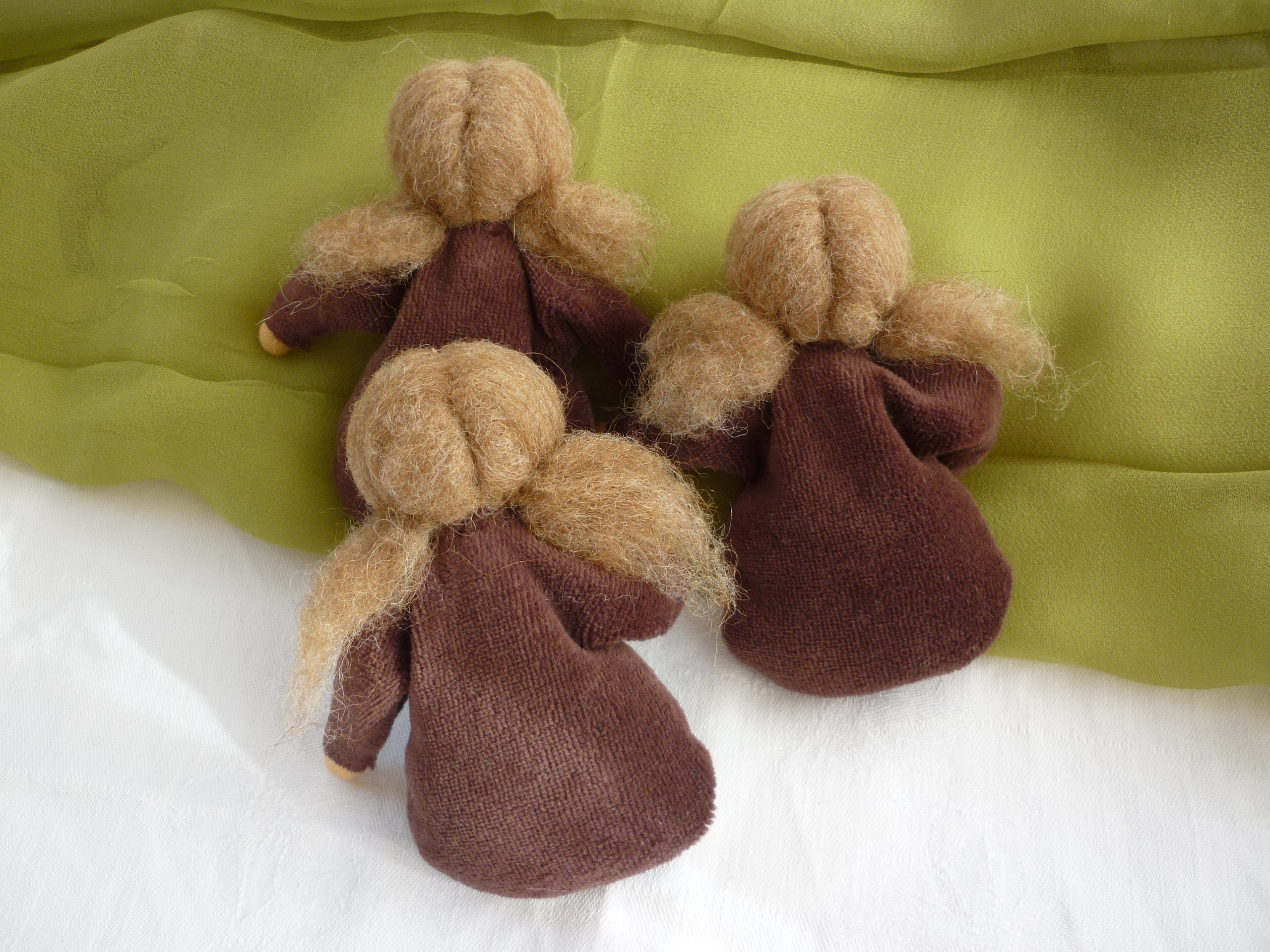 Der Körper ist aus braunem Nicki genäht und mit etwas Hirse und darüber wenig Schafwolle gefüllt, Kopf und Hände mit Trikot überzogen, die Haare aus hellbrauner Schafwolle. Größe des Püppchens 11 cm.