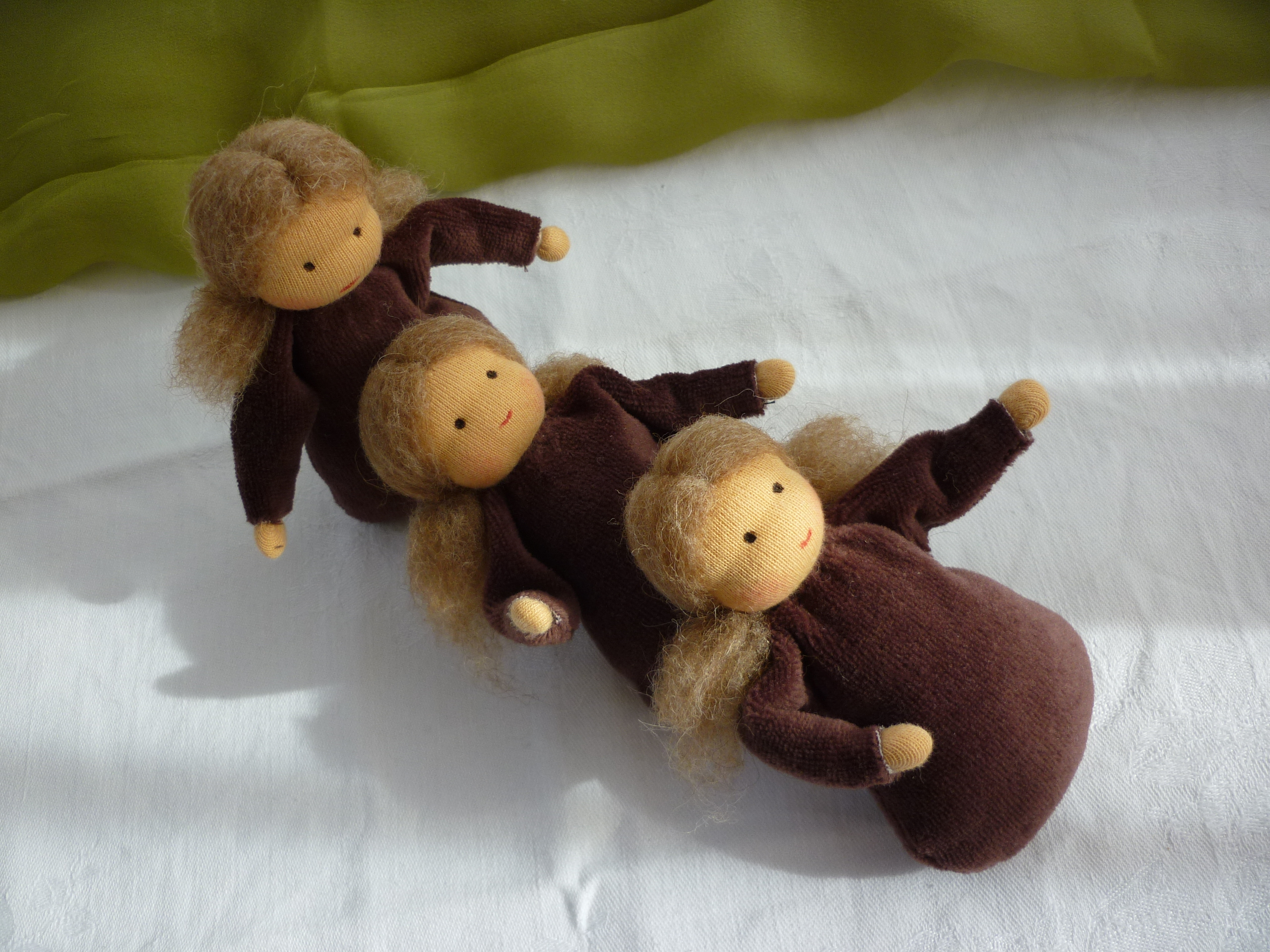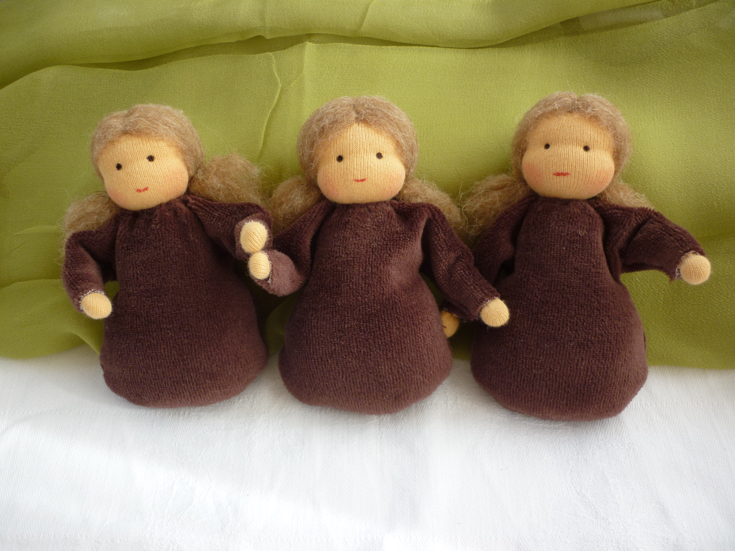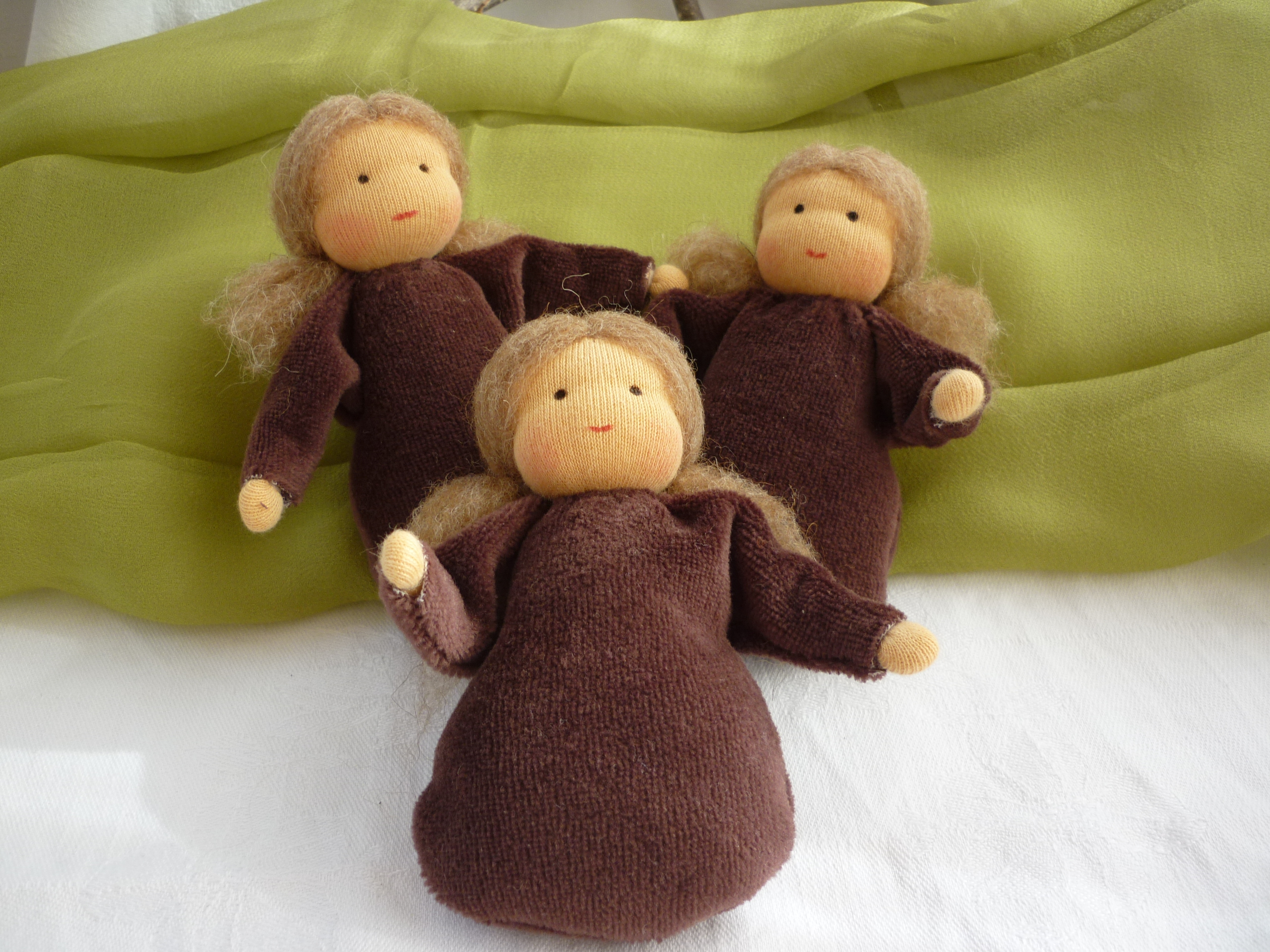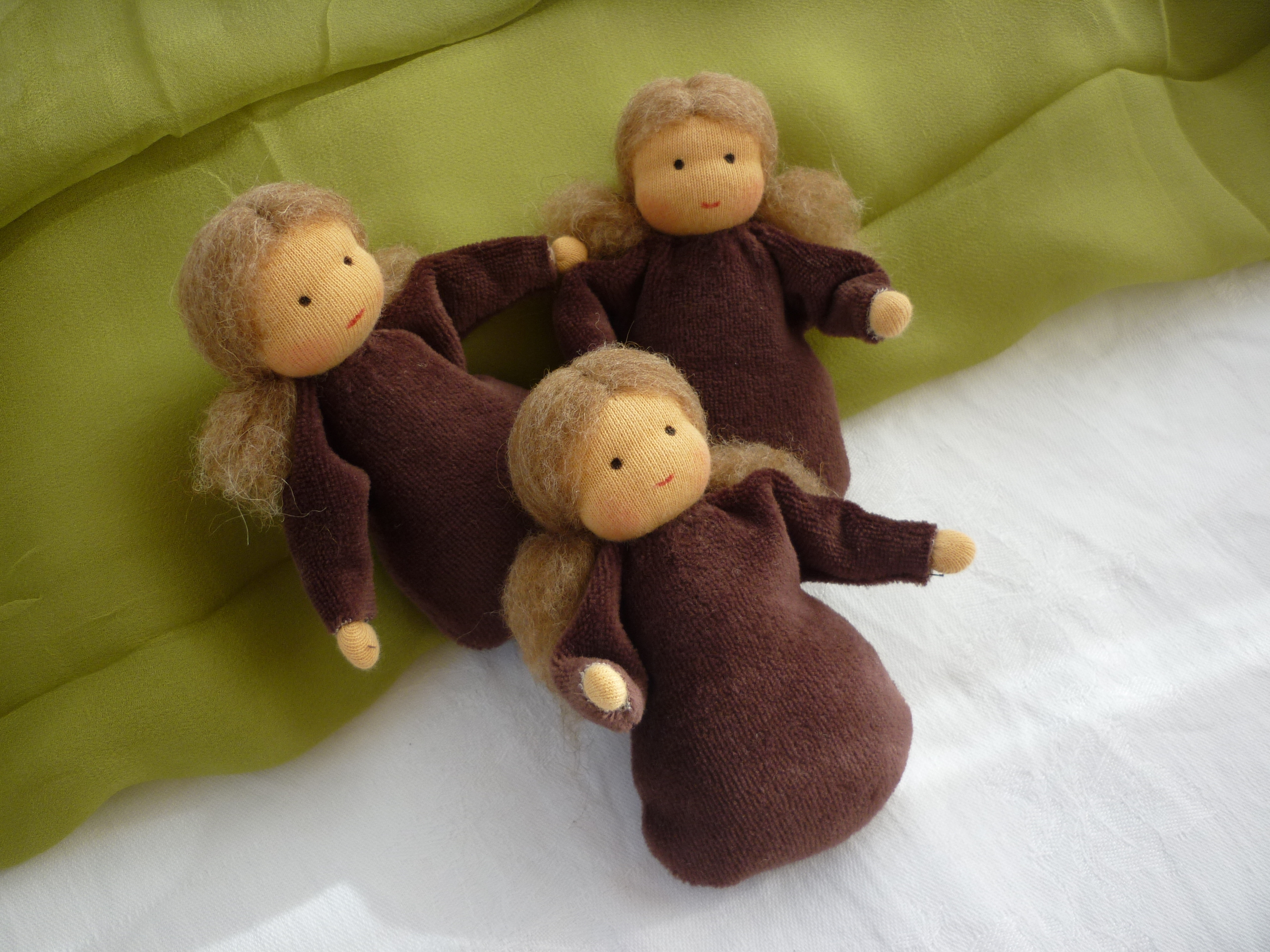 Der Körper ist aus braunem Nicki genäht und mit etwas Hirse und darüber wenig Schafwolle gefüllt, Kopf und Hände mit Trikot überzogen, die Haare aus hellbrauner Schafwolle. Größe des Püppchens 11 cm.