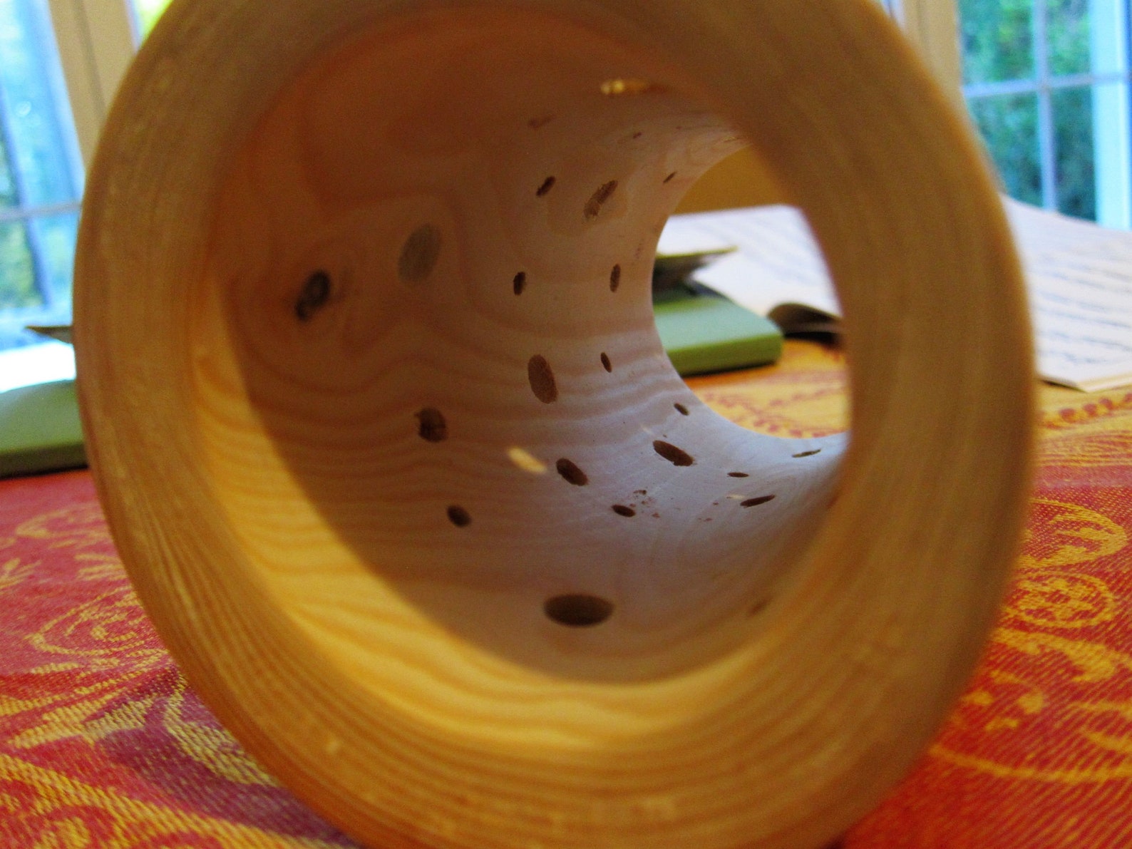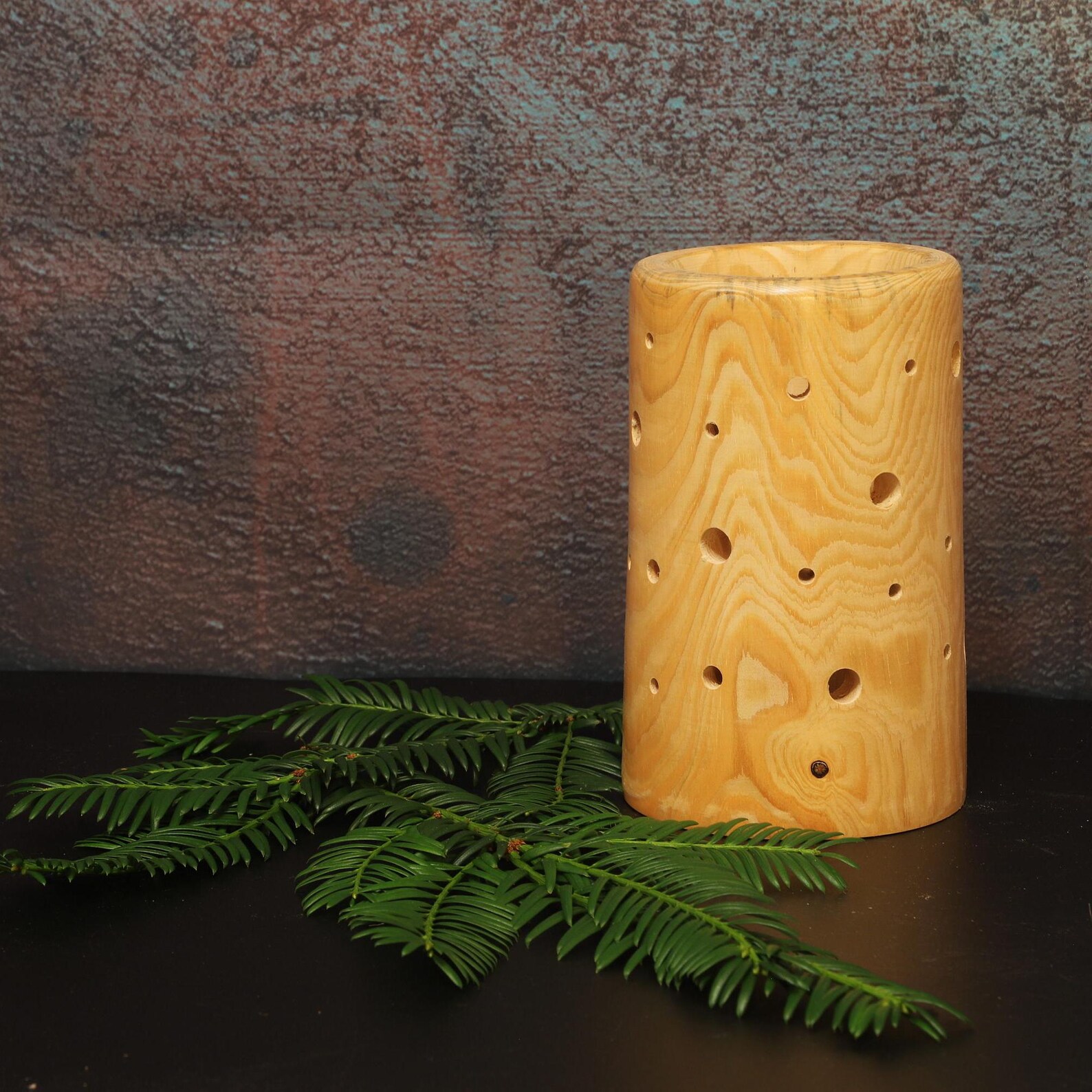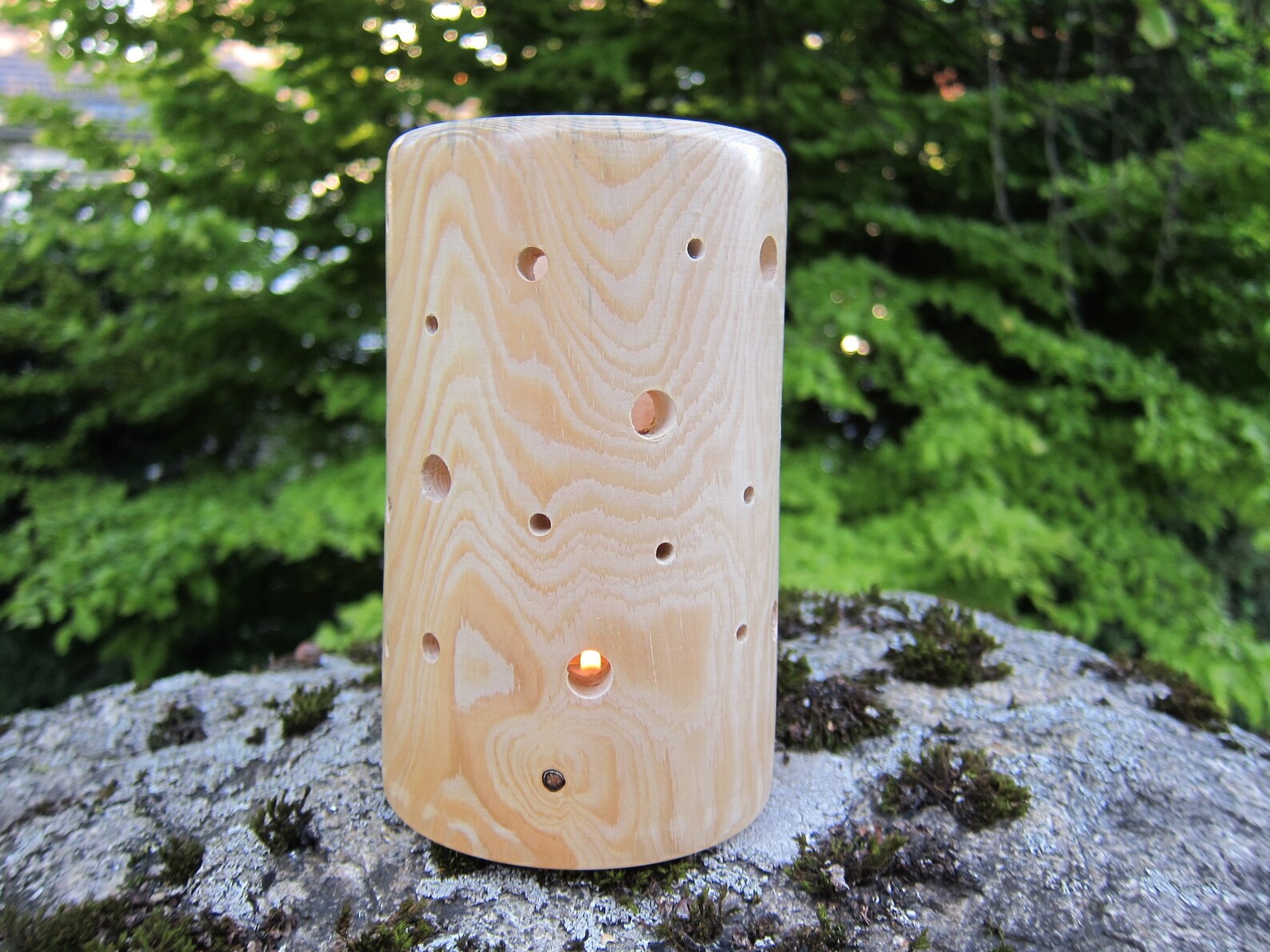 Das Holz, das ich benutze, stammt von einem Feuerholzlager meiner Familie und von Bäumen unseres Grundstücks und wurde über Jahre gelagert. Holz ist ein Naturprodukt. Alleine deswegen gleicht kein Kerzenständer dem anderen. Meine Werke sind auch sonst Unikate, da jedes Stück Holz mir erst im Laufe der Zeit offenbart, was es werden soll.