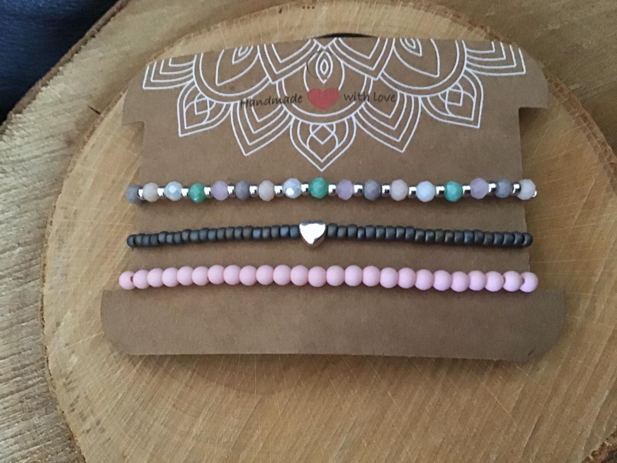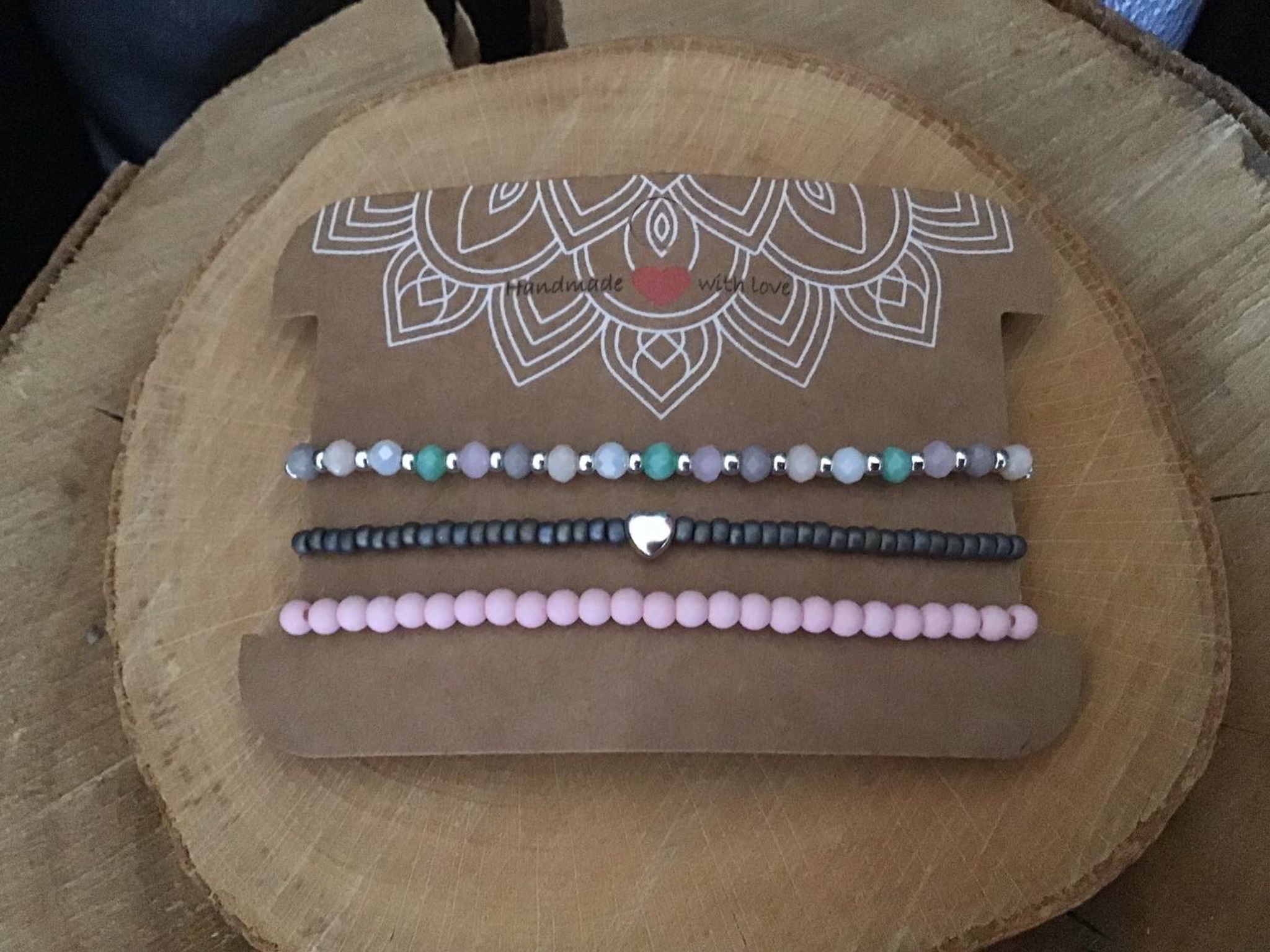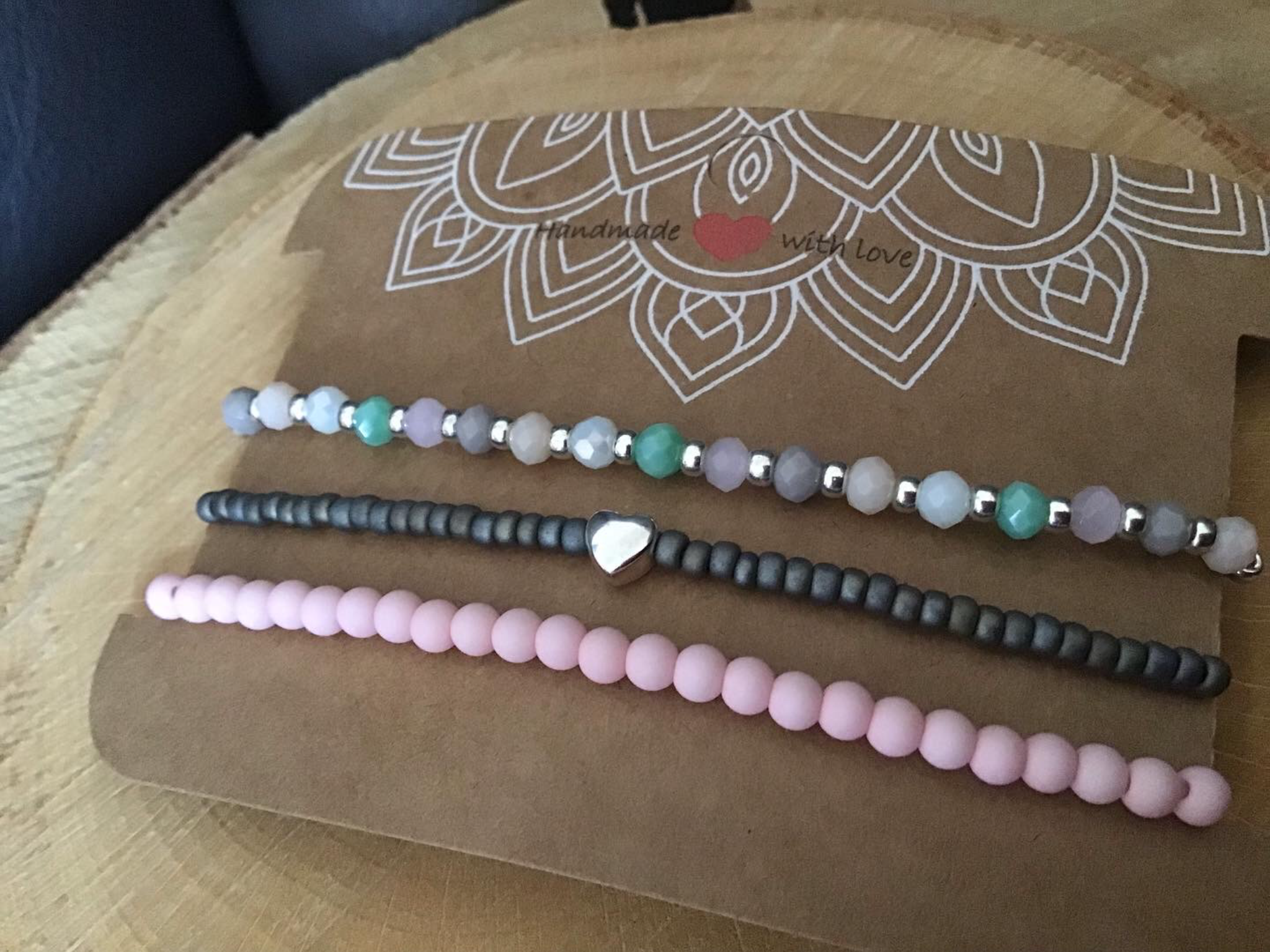 Das zweite Armband besteht aus Elastikband, auf dem 4 mm Acryl-Perlen gefädelt sind. Das dritte Armband besteht aus Miyukiglasperlen und ein versilbertes Herz, die ebenfalls auf Elastikband gefädelt sind.