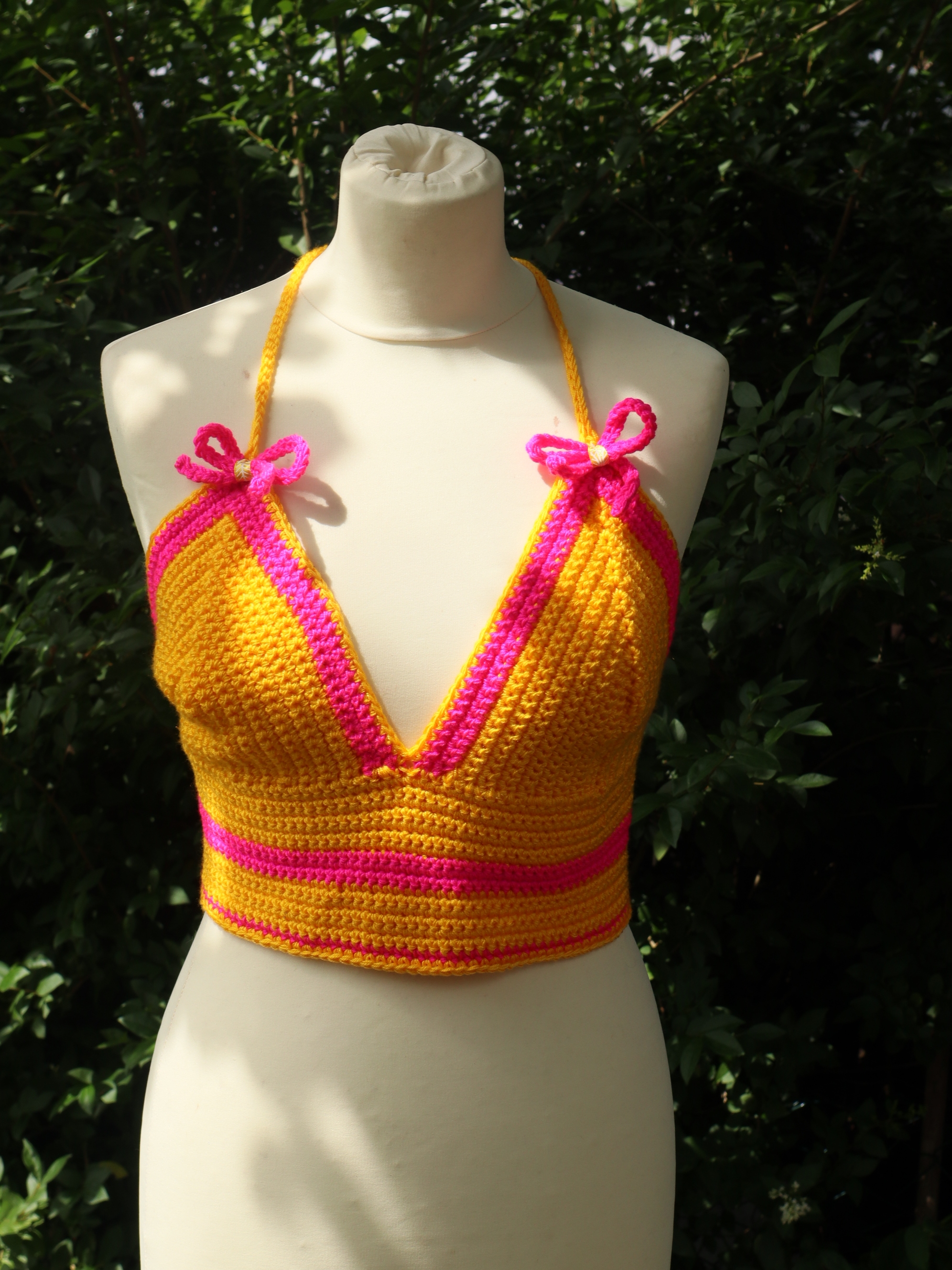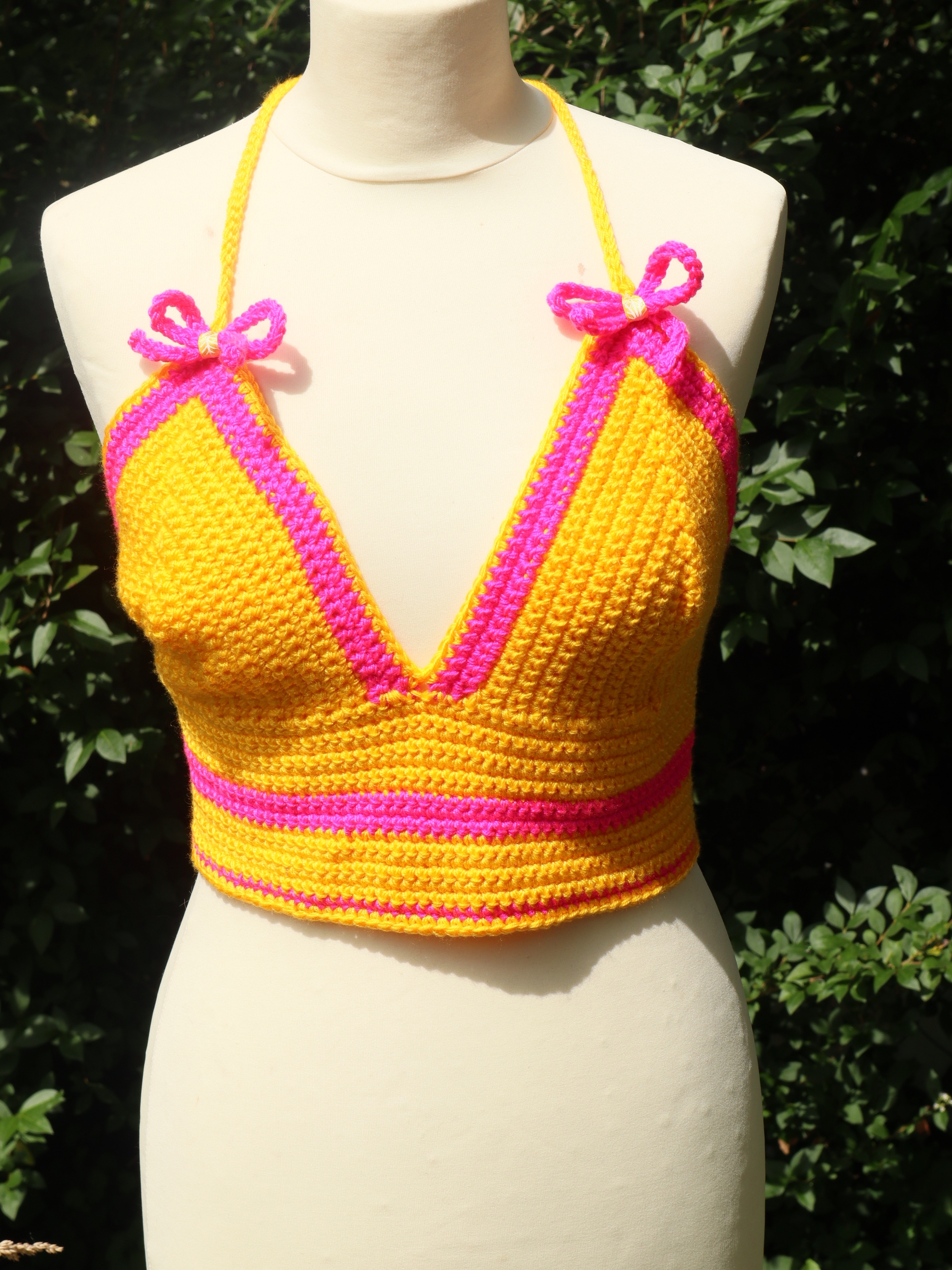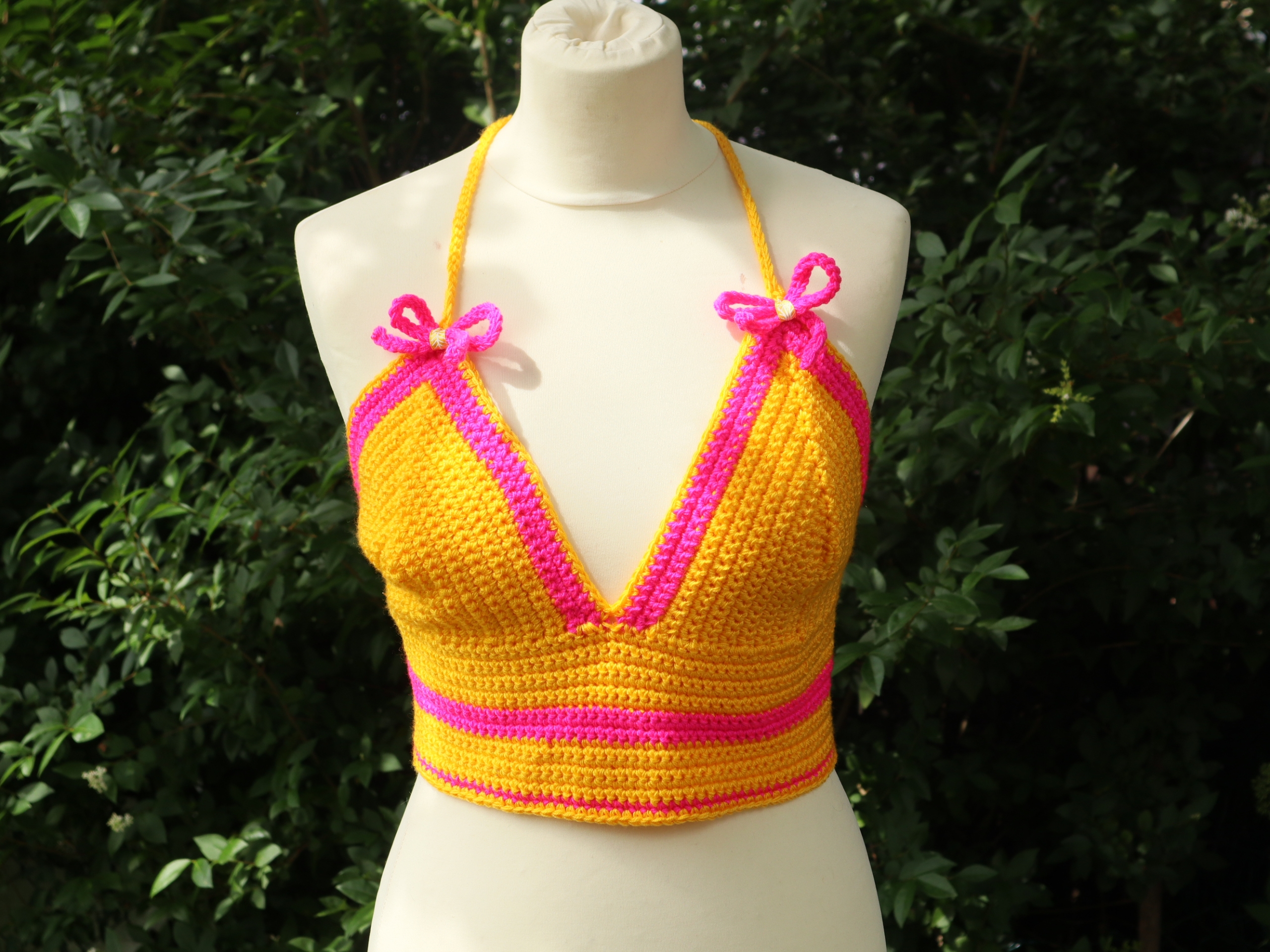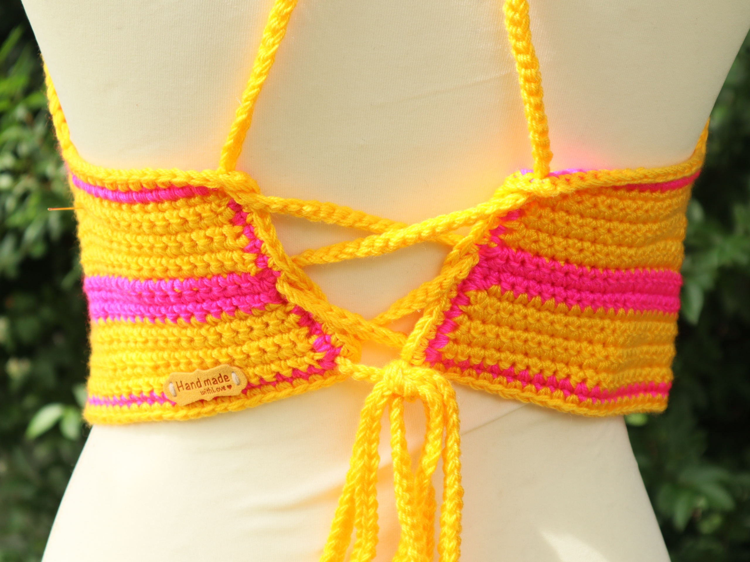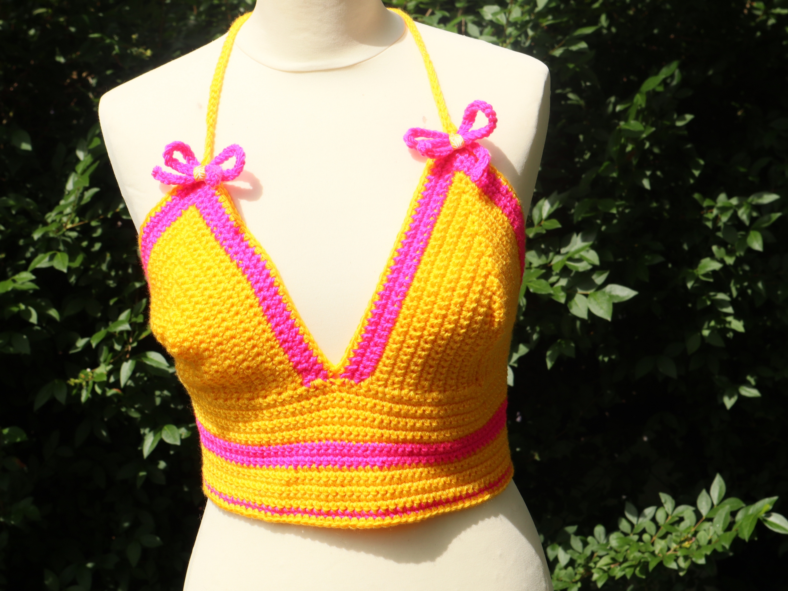 Liebevoll von Hand gehäkeltes Sommertop aus Perlgarn in Polyacryl in leuchtendem Gelb und Pink. Durch die Schnürung im Rückenbereich kann es individuell angepasst werden.